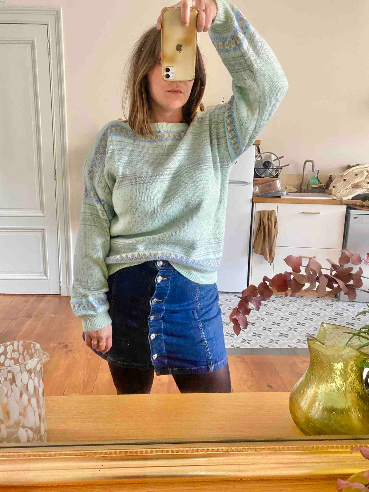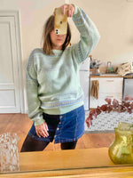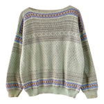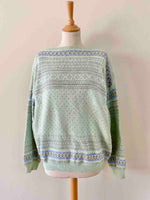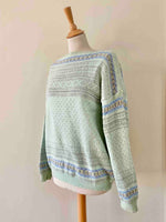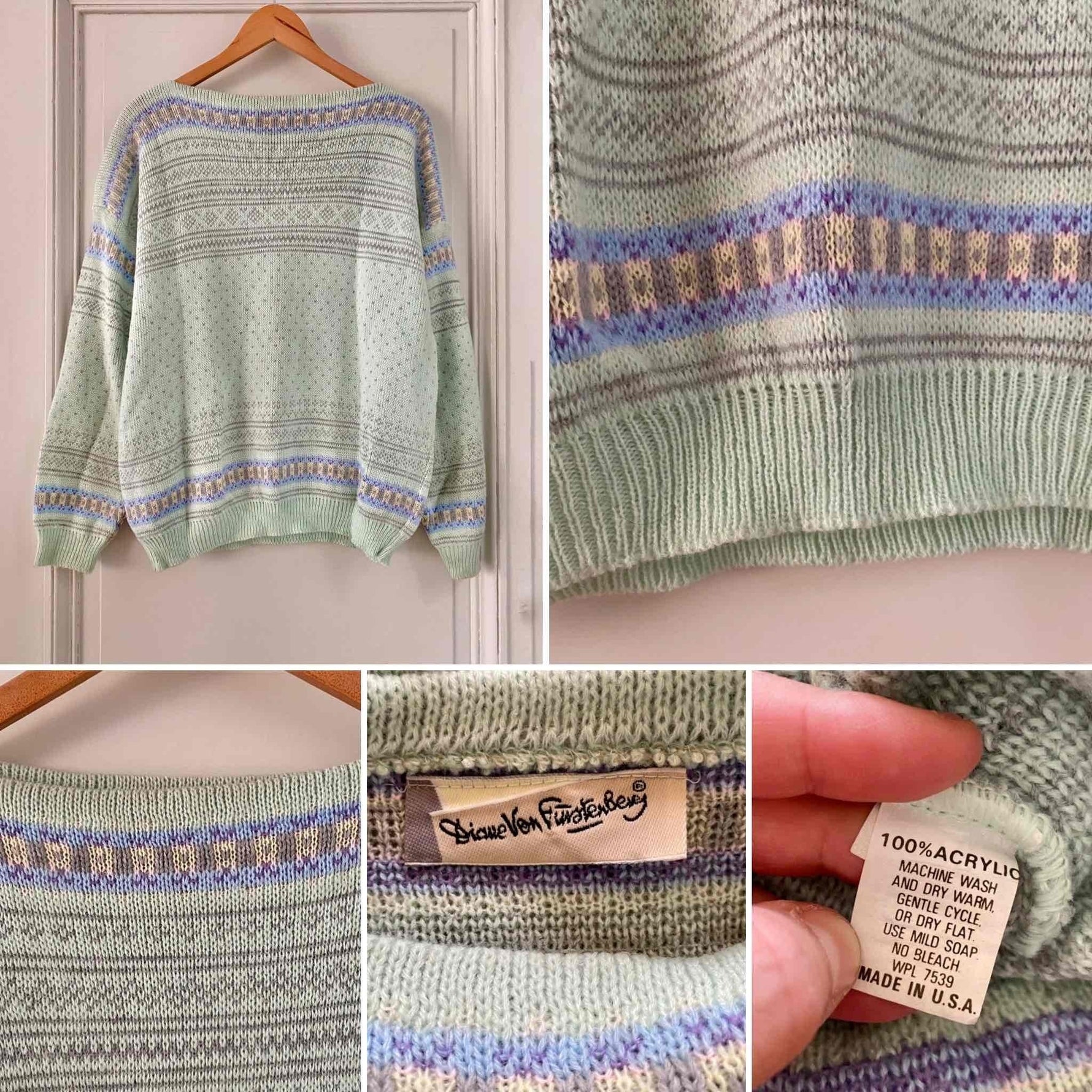 Pull Diane Von Furstenberg à motifs jacquard vert menthe, lilas, roses, pastels, col bateau, manches ballons, en acrylique, fabriqué aux USA, taille 38/40.