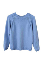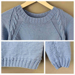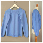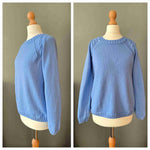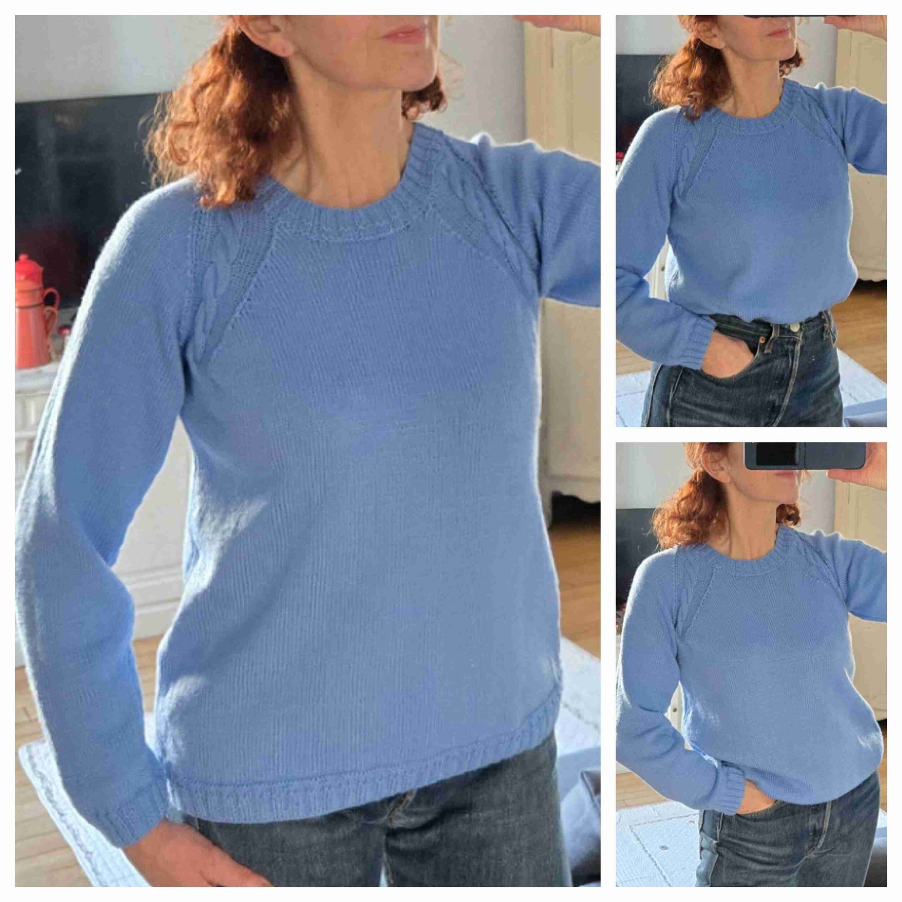 Pull en coton bleu de cobalt, ras de cou, manches raglan, épaules torsadées, poignets et base en côtes. Porté sur les photos par une personne T36. Matière douce. Pièce tricotée à la main.
