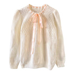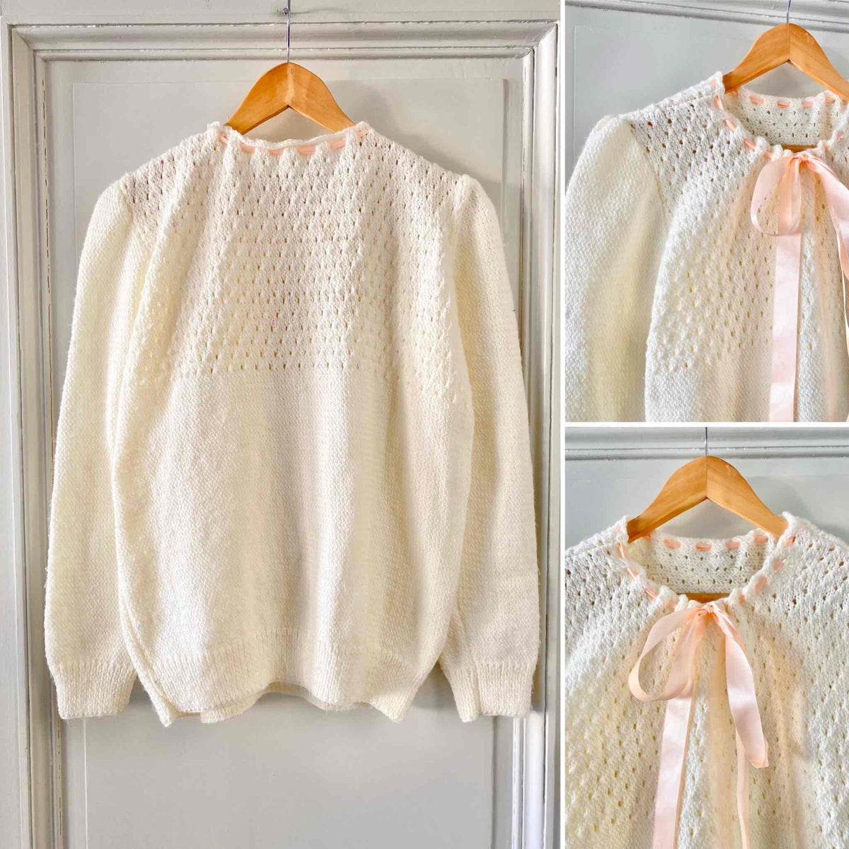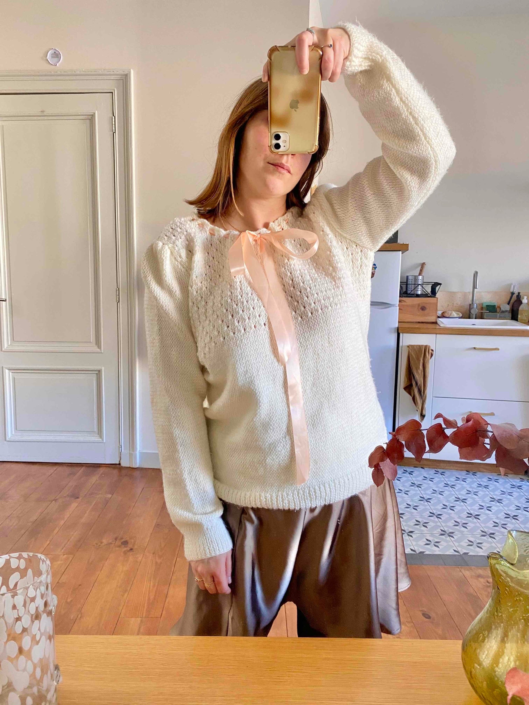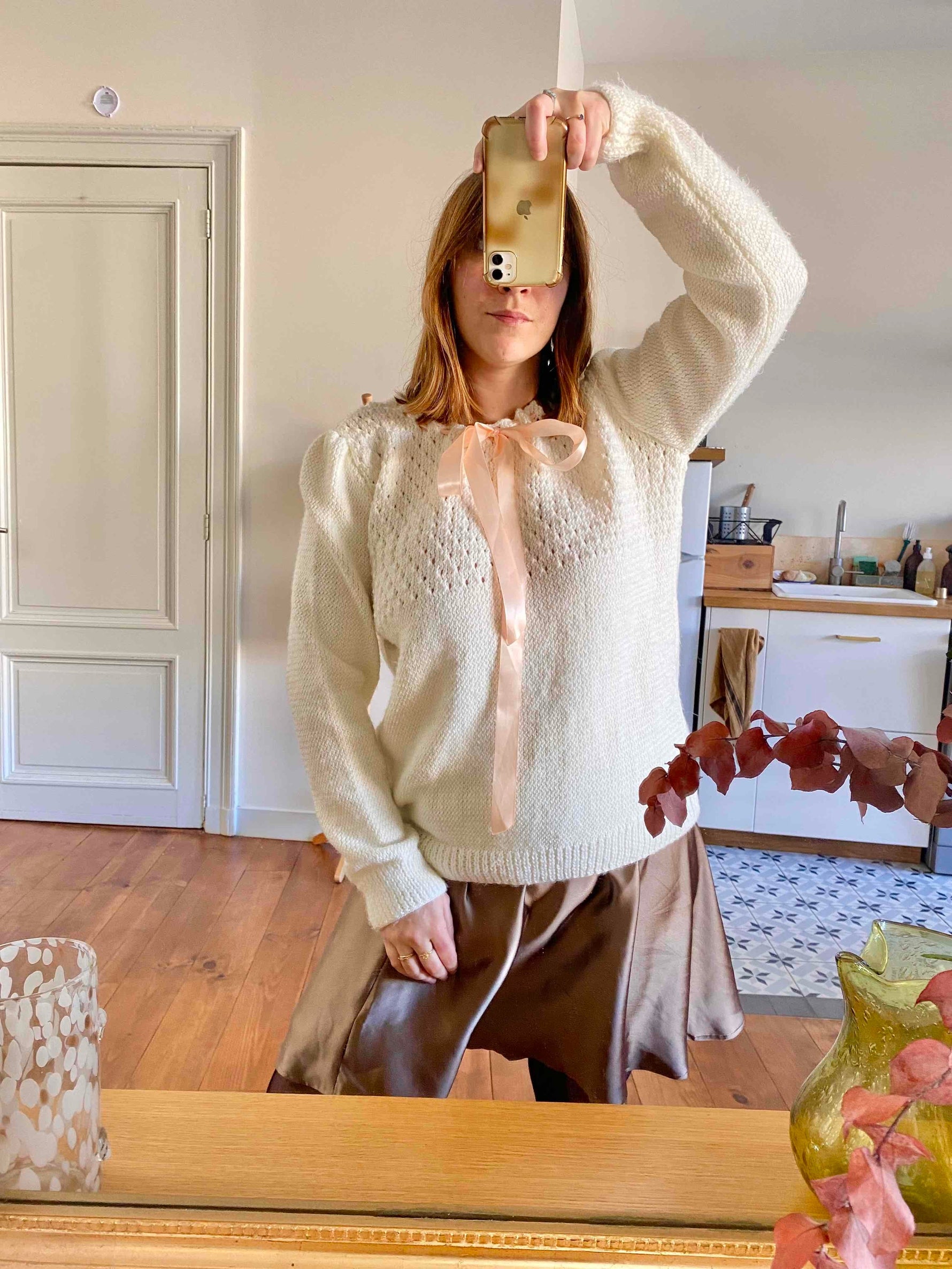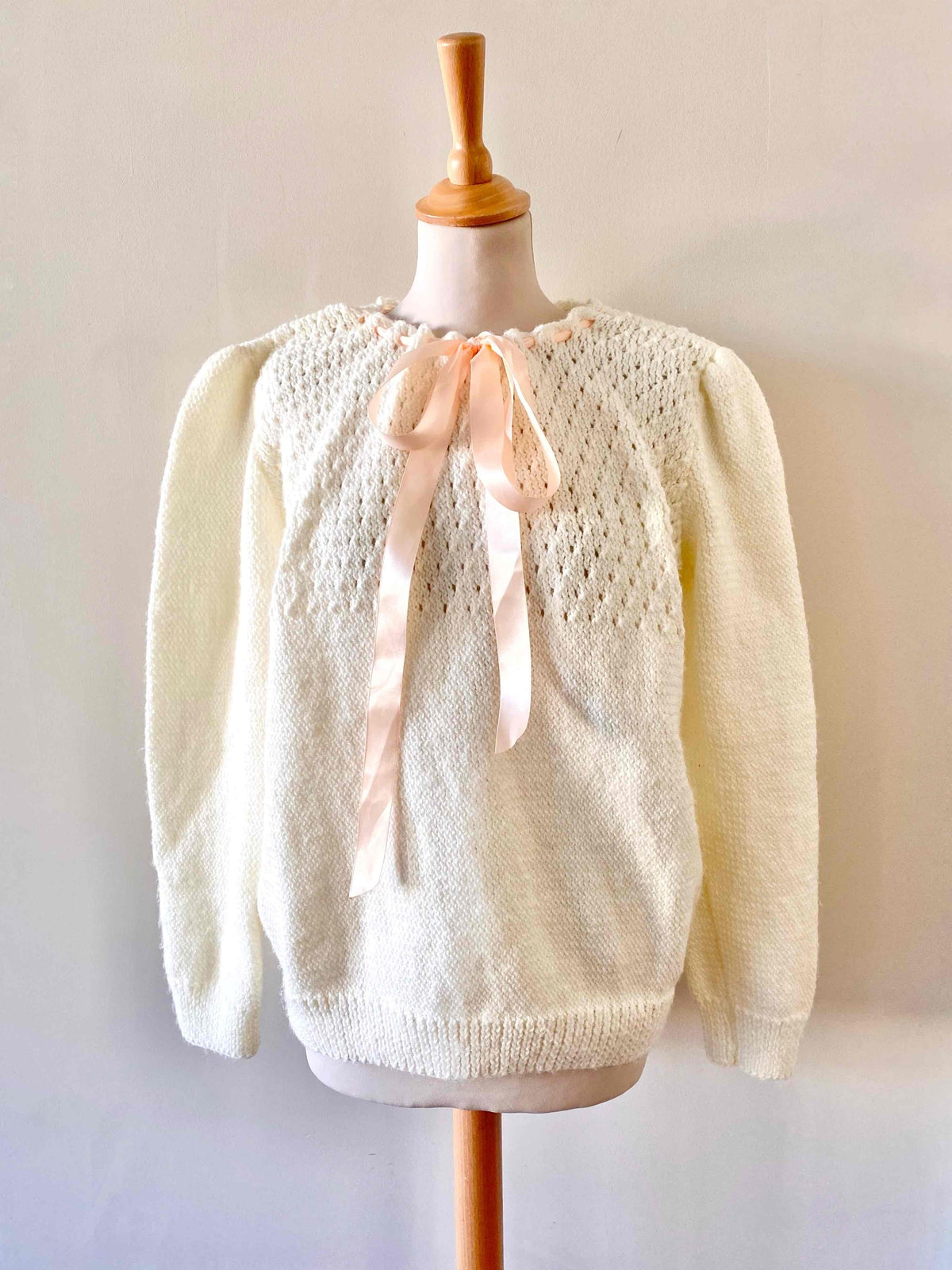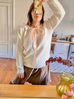 Prix unitaire parPull en laine mélangée écrue, maille ajourée dentelle, col lacet par un ruban en satin rose pâle à nouer, manches ballons, tricoté mains, taille 40 porté ici sur un mannequin T36 et une personne T40.