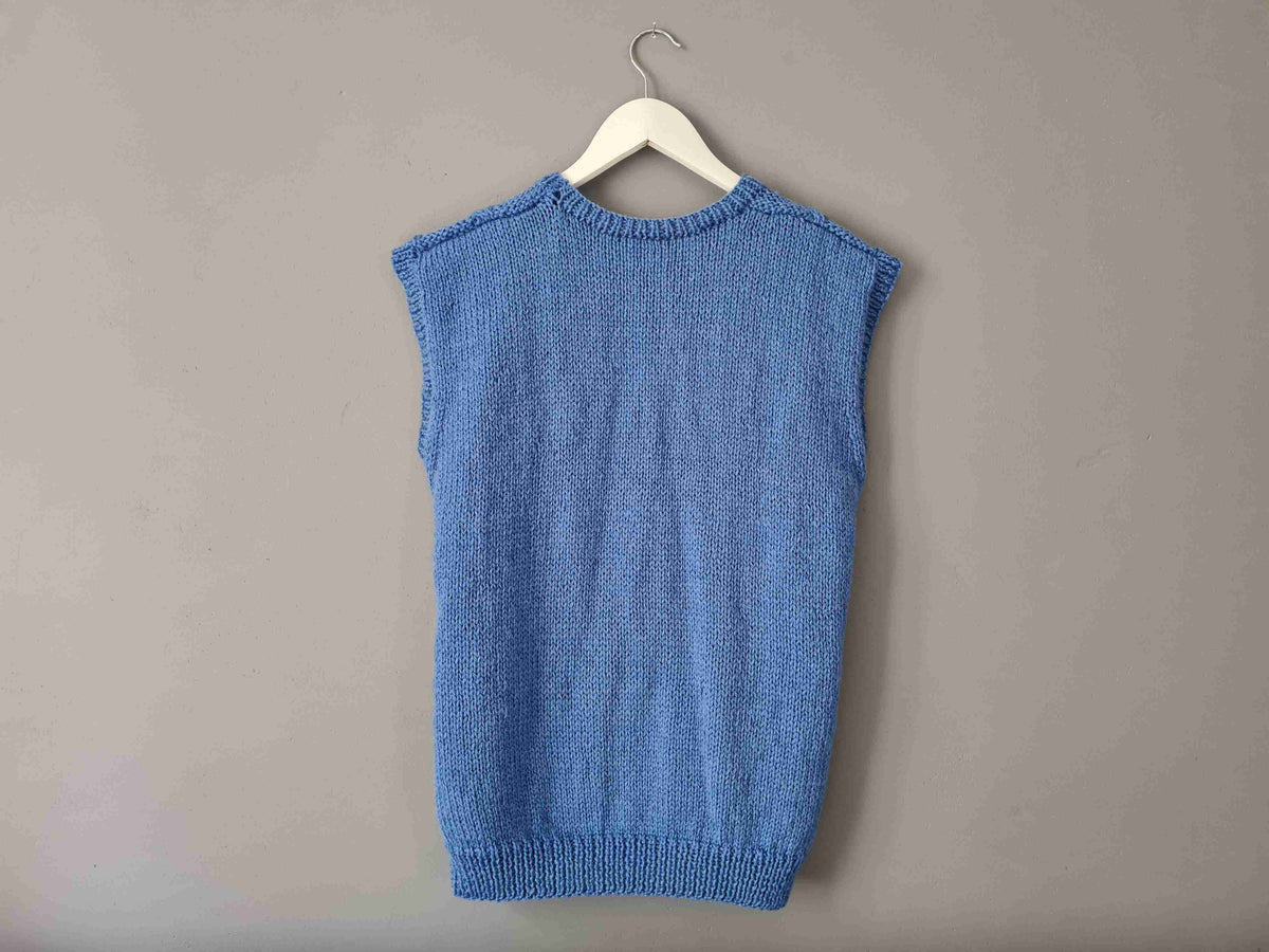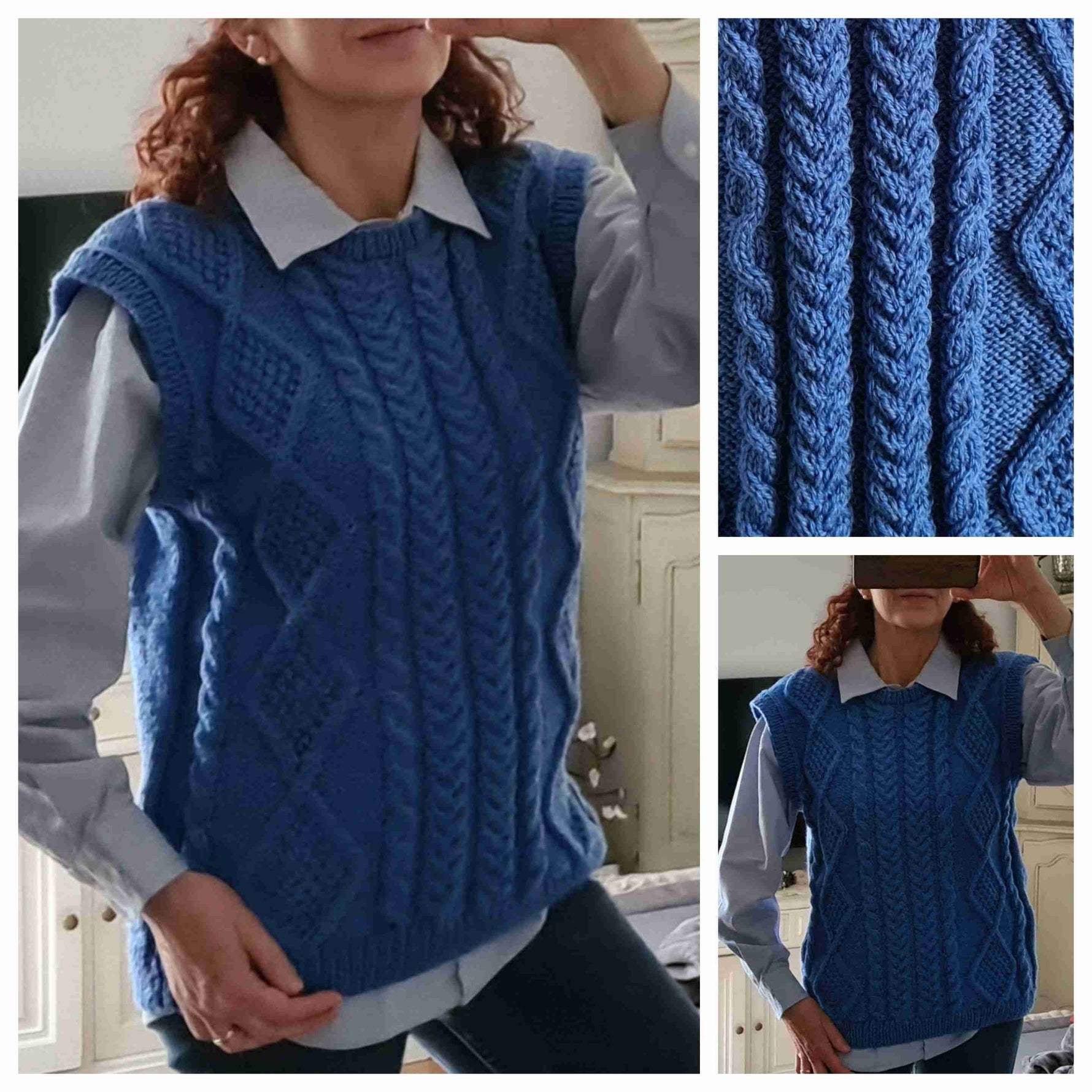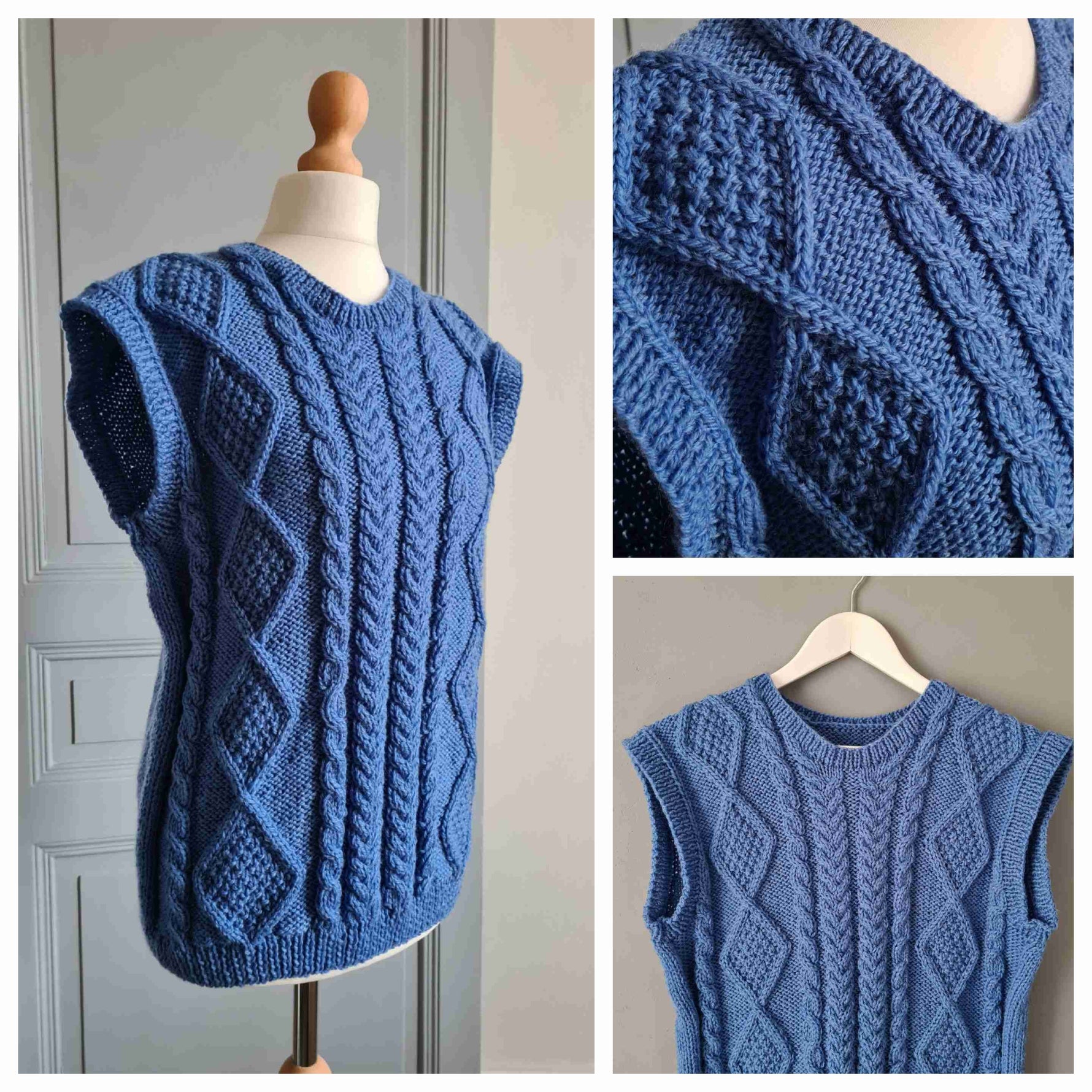 Prix unitaire parPull en laine majoritaire, sans manches, à torsades, bleu cobalt, épaules légèrement débordantes, encolure ronde.