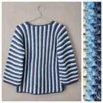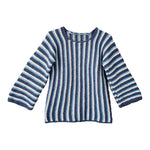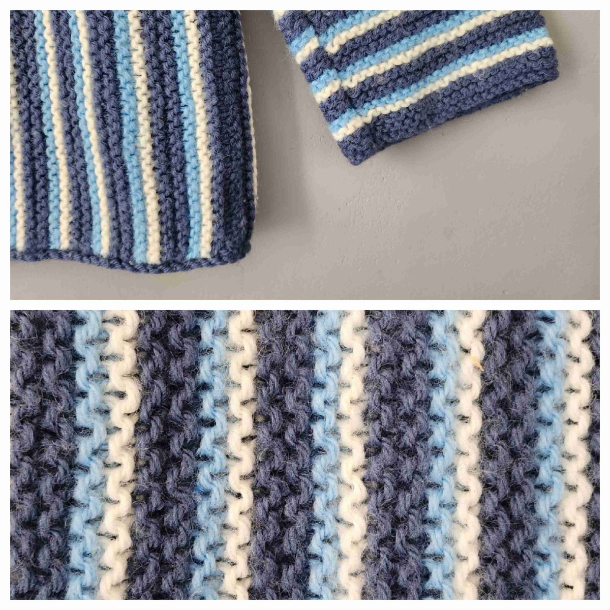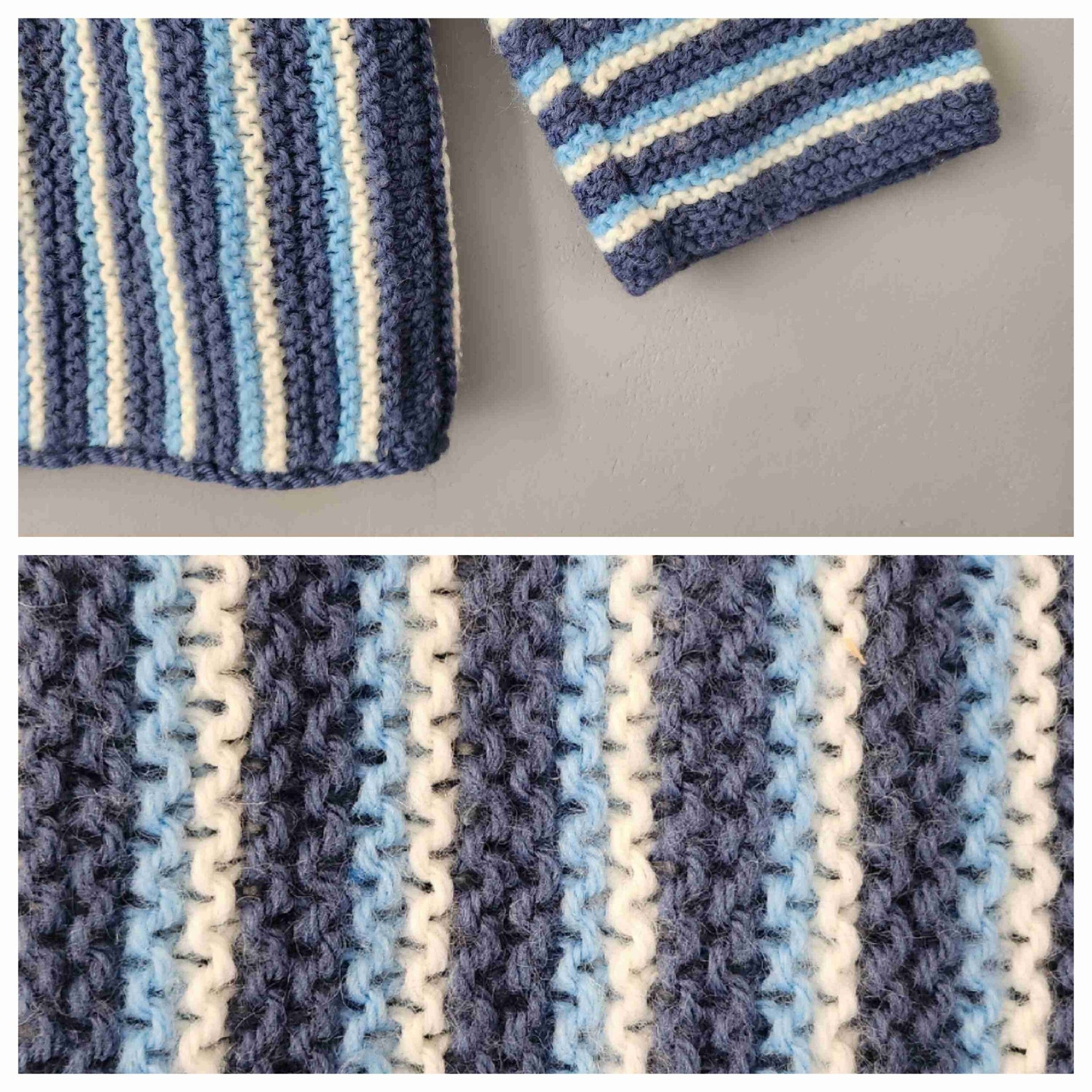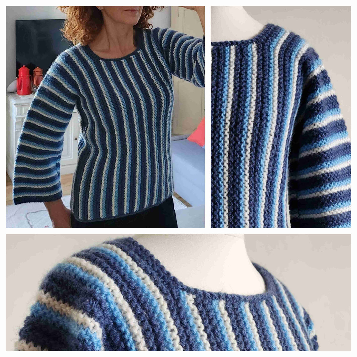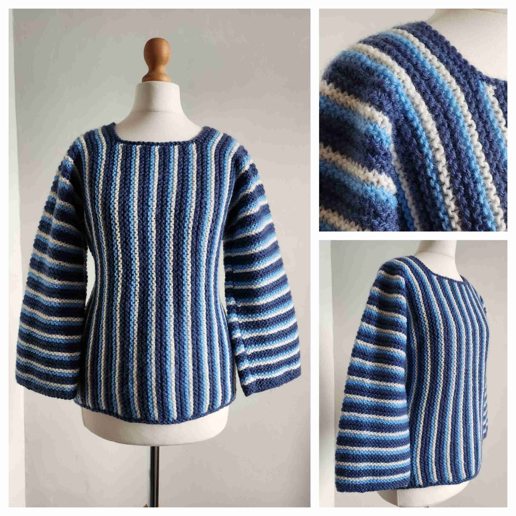 Pull 70's en laine à rayures bleu ciel, cobalt et blanc, près du corps, manches pagode 7/8ème, encolure carrée. Porté sur les photos par une personne T36. Point mousse tricoté à la main.