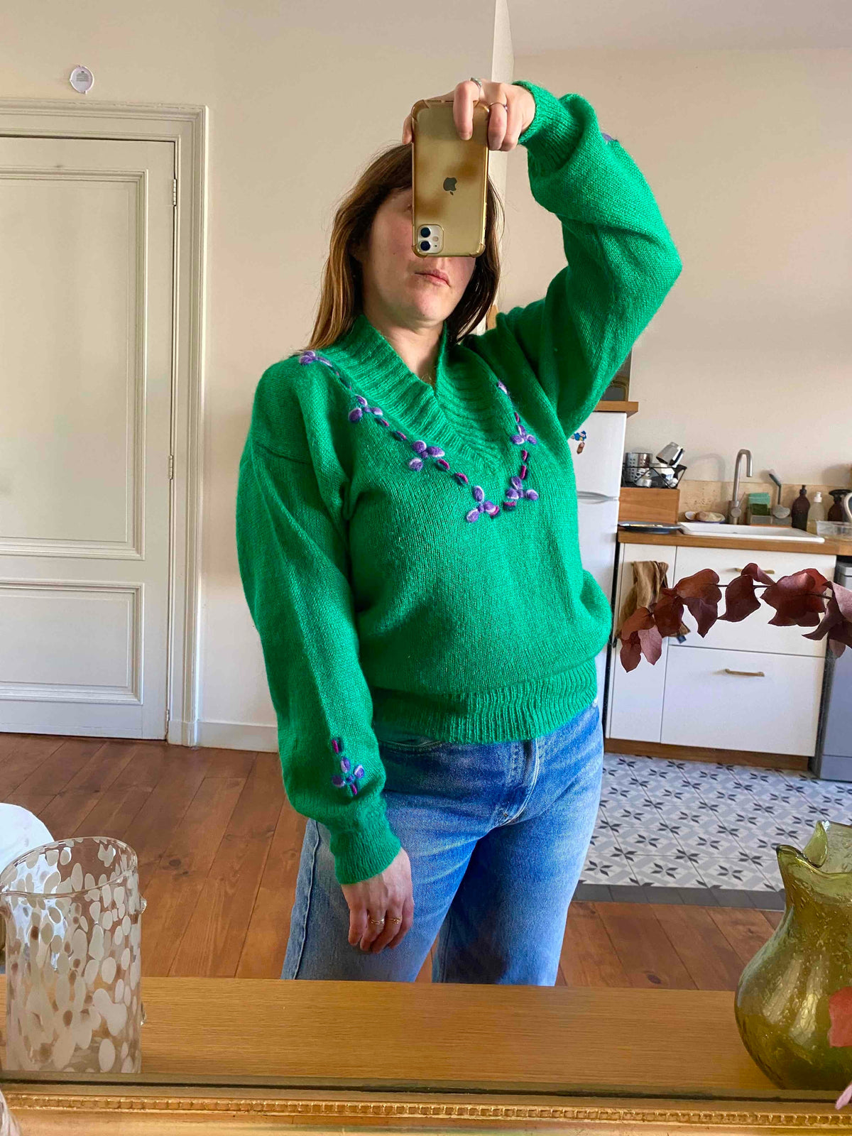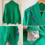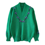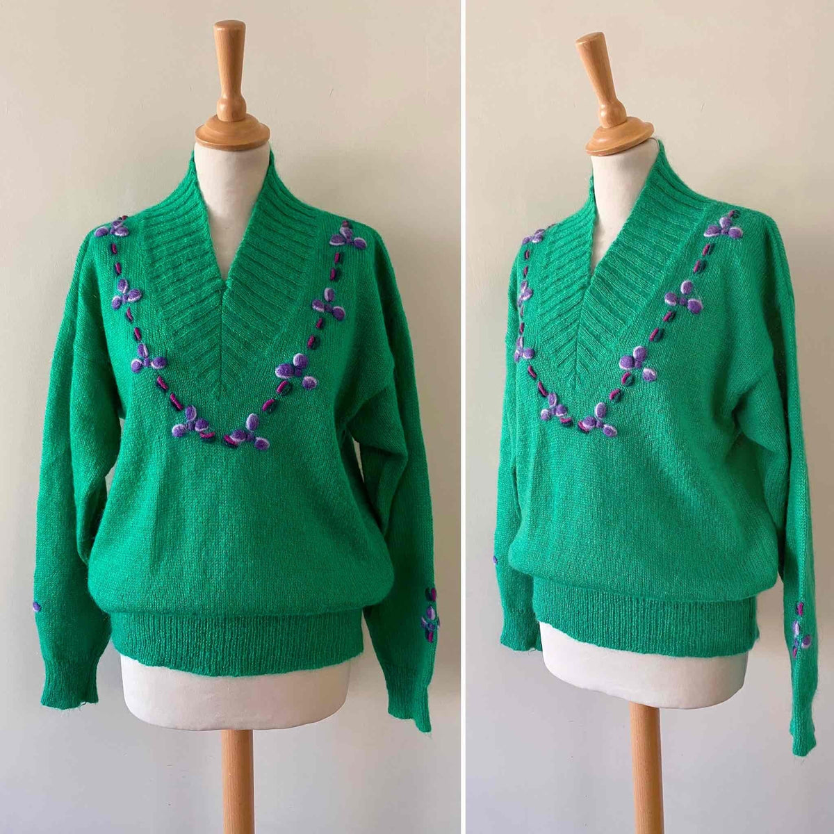 Prix unitaire parPull en Laine et Mohair vert chlorophylle brodé de fleurs violettes et lilas, col V châle, manches ballon, fabriqué en Italie, taille 38 porté ici sur un mannequin T36 et une personne T40.