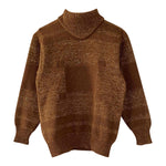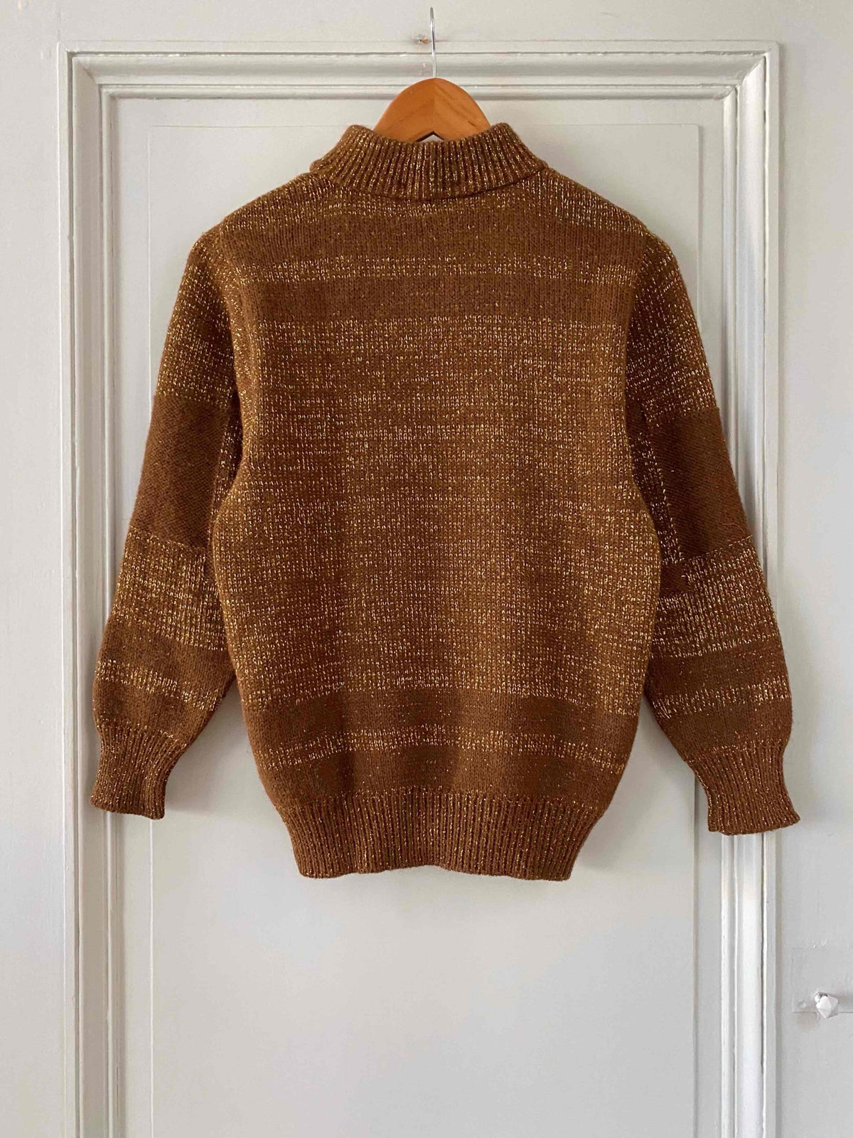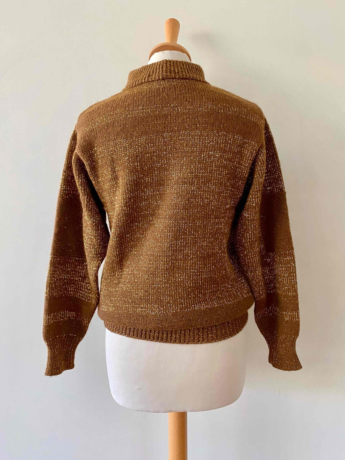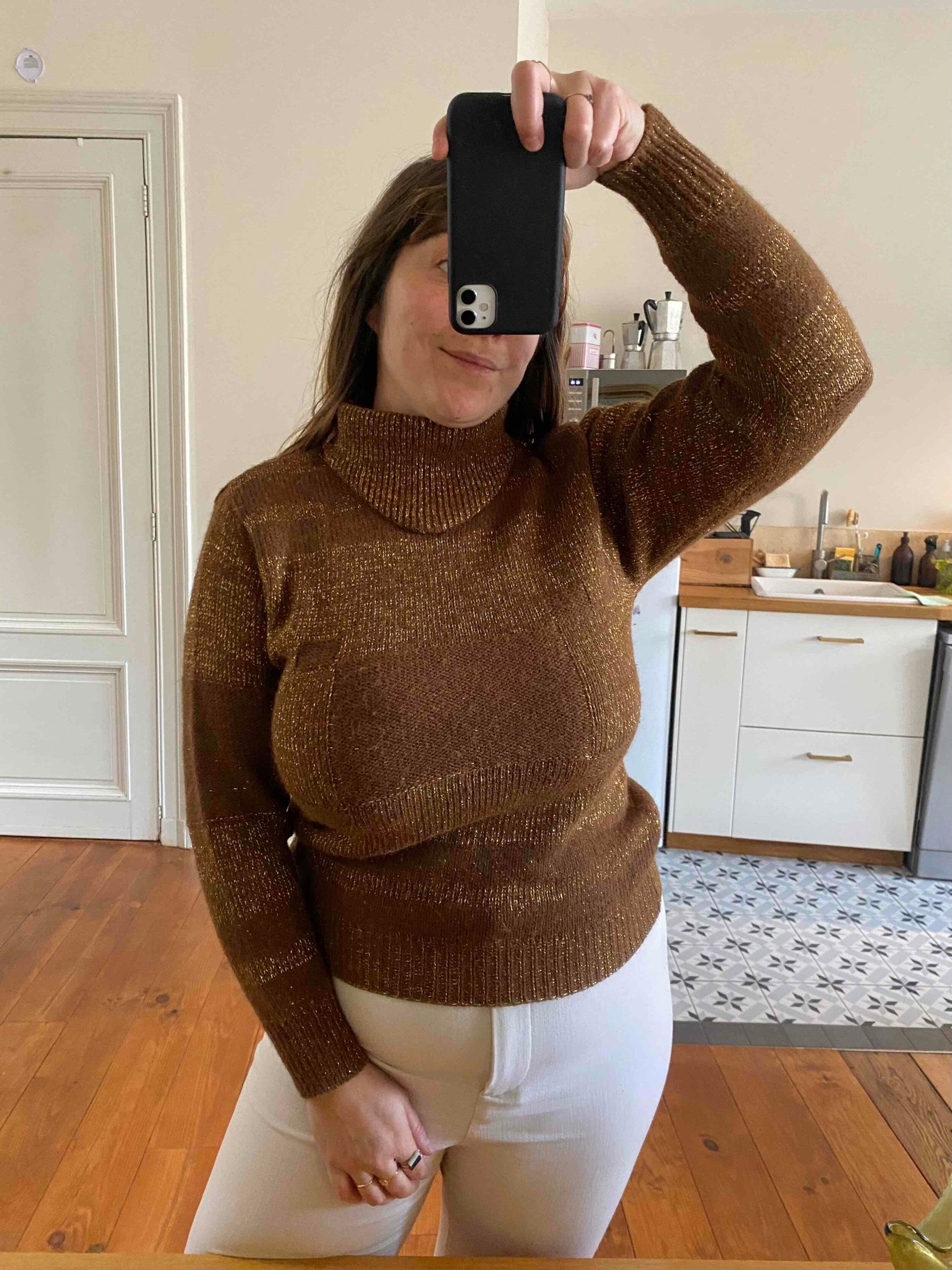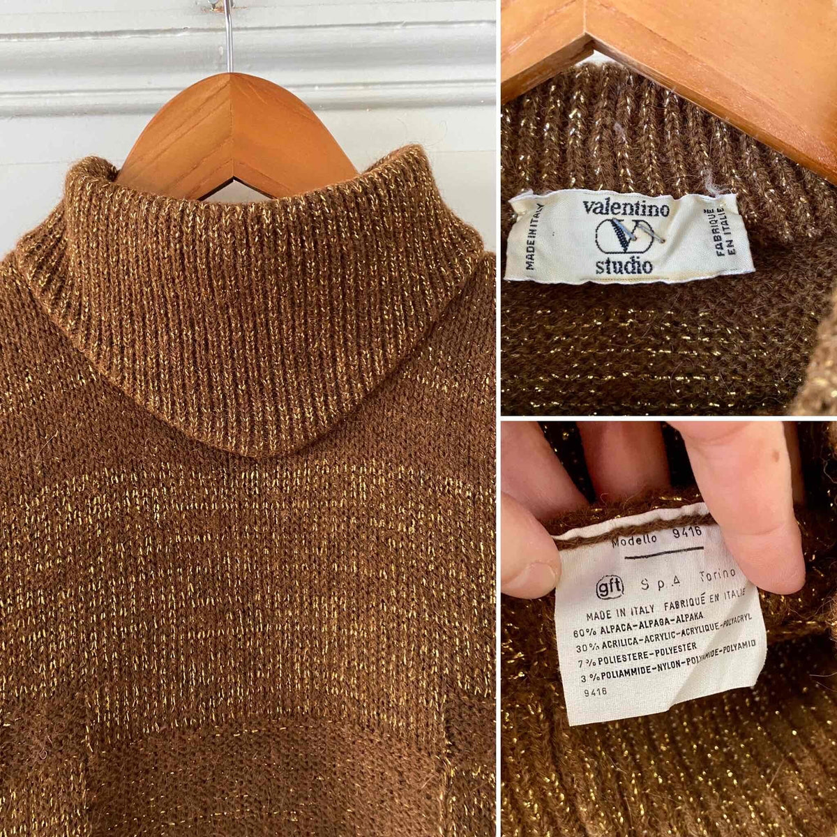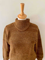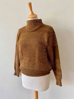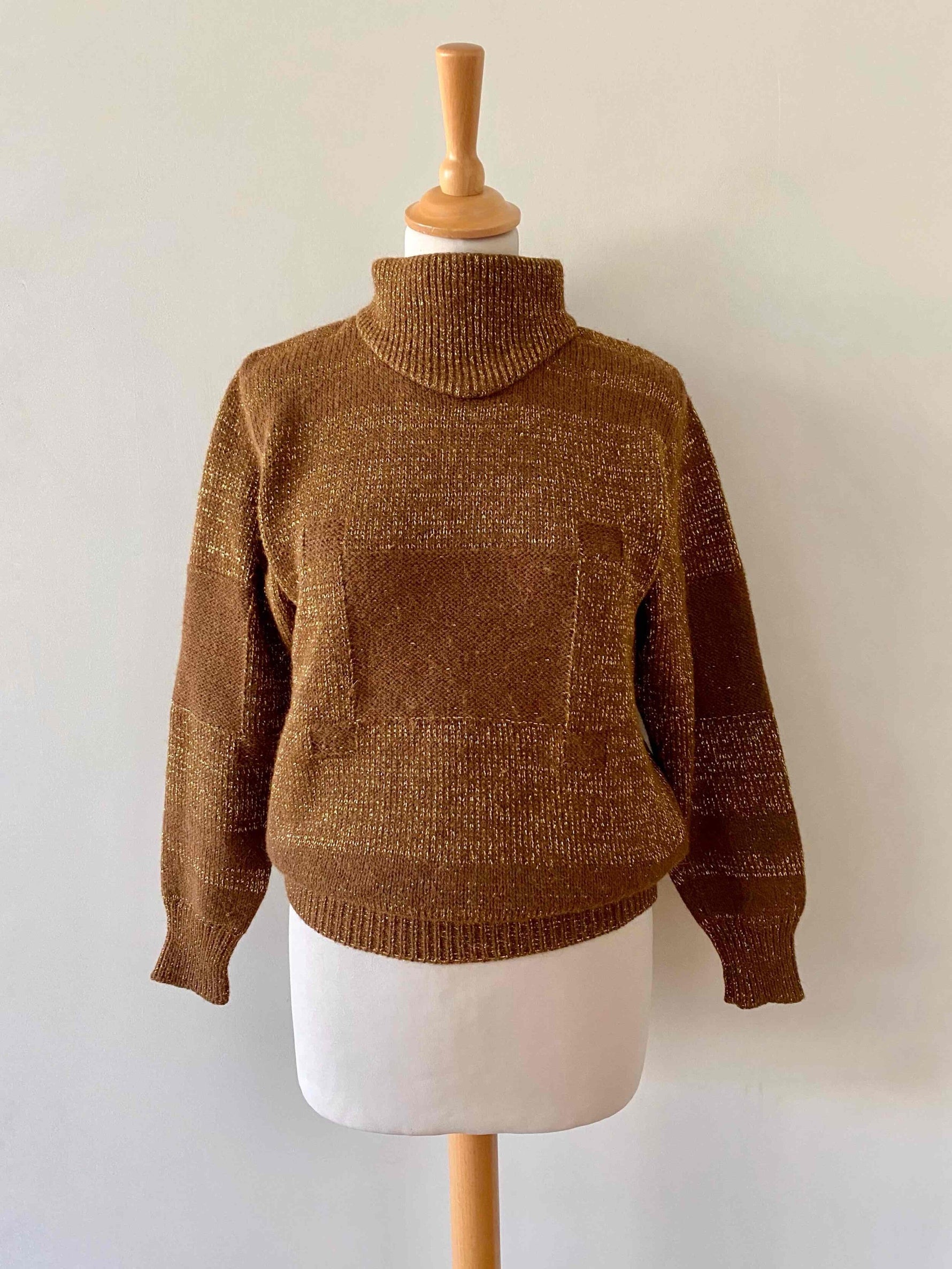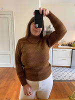 Prix unitaire parPull Valentino, en alpaca caramel et lurex doré, col montant, détails de tricot motifs géométriques, forme sewar manches ballons, fabriqué en Italie, taille 36 porté ici sur un mannequin T36 et serré sur une personne T40.