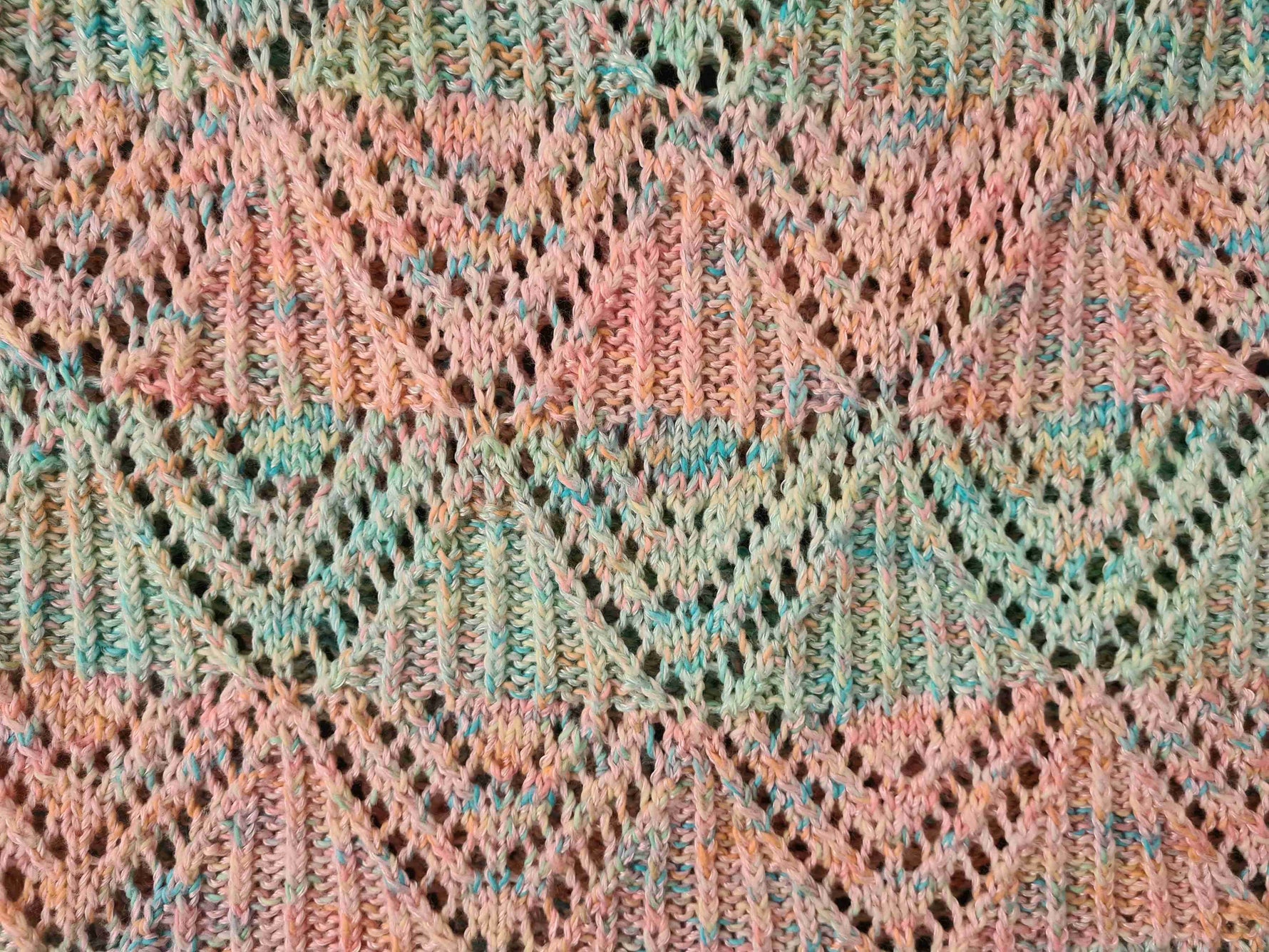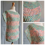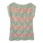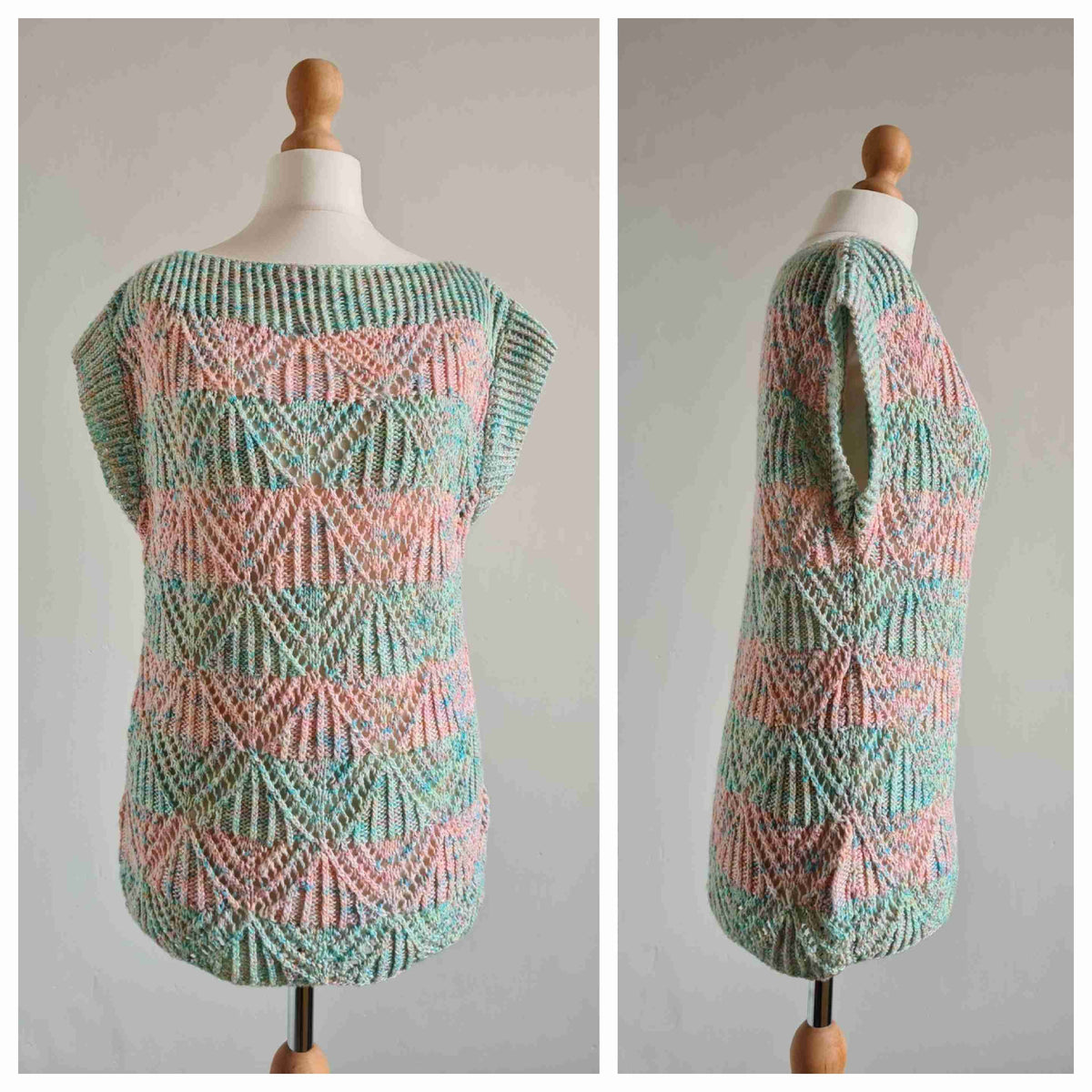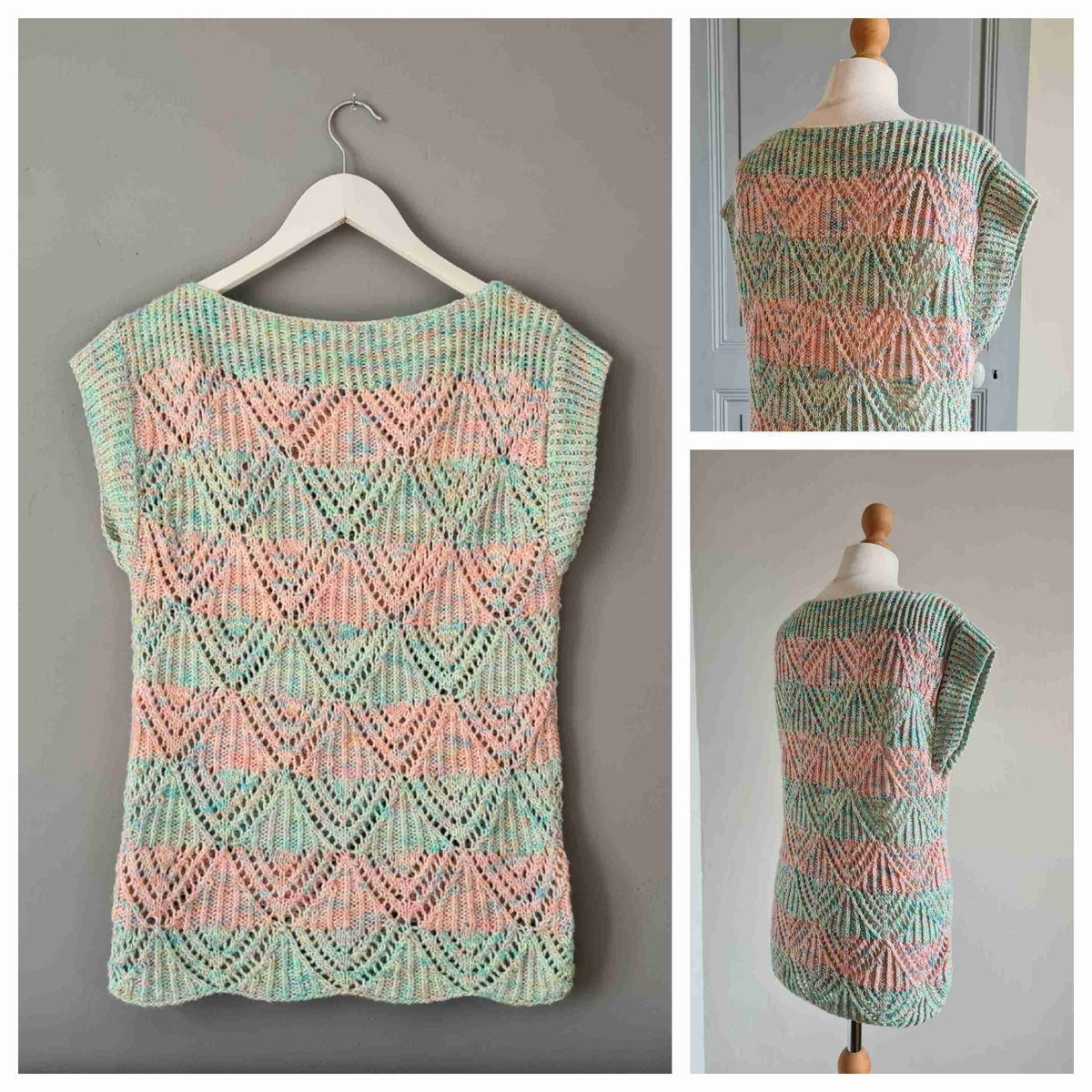 Prix unitaire parPull sans manches en maille coton à rayures, coloris pastel rose et turquoise chinés, col bateau, épaules légèrement débordantes, point ajouré, base vagues. Pièce unique tricotée à la main.