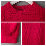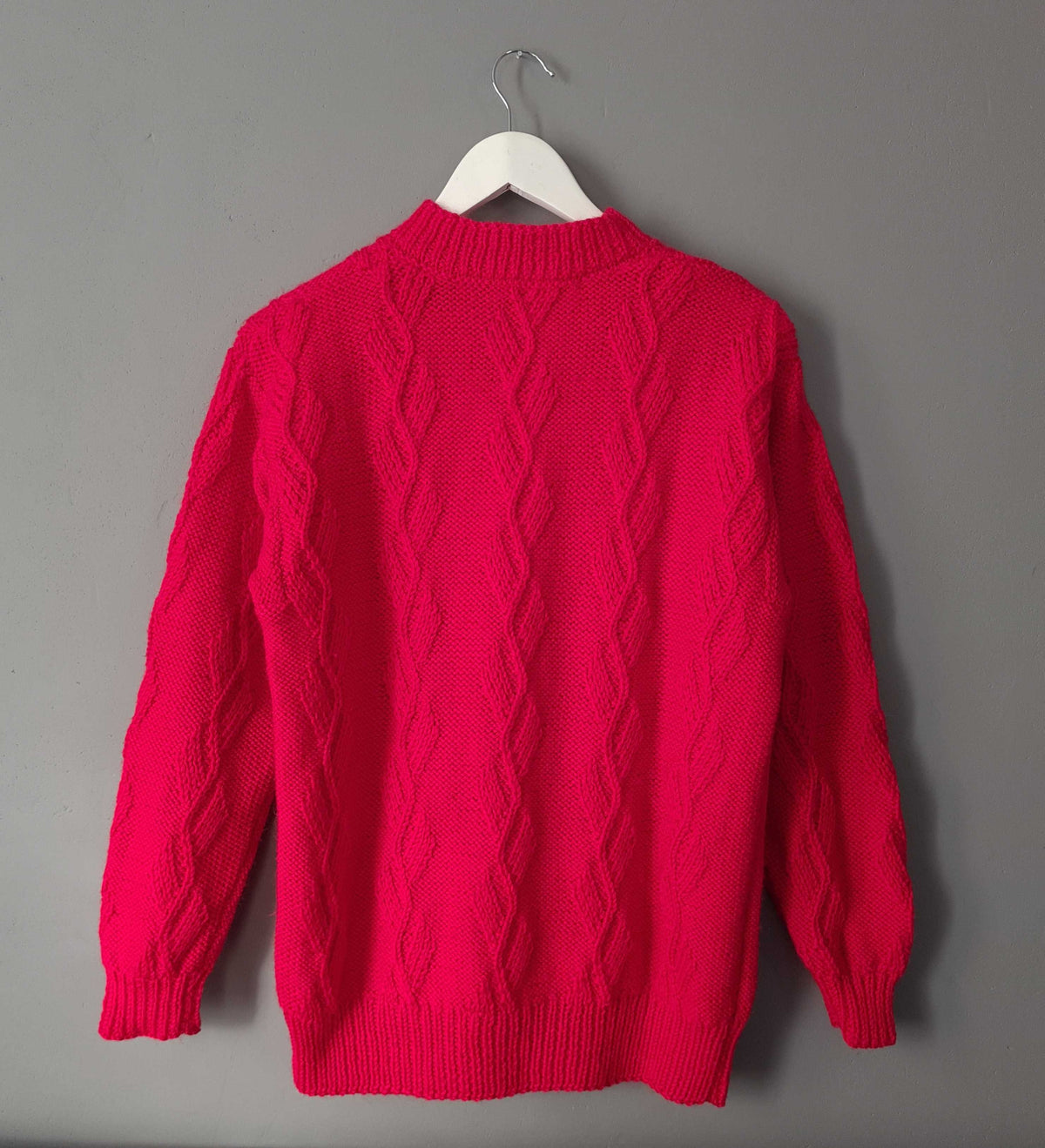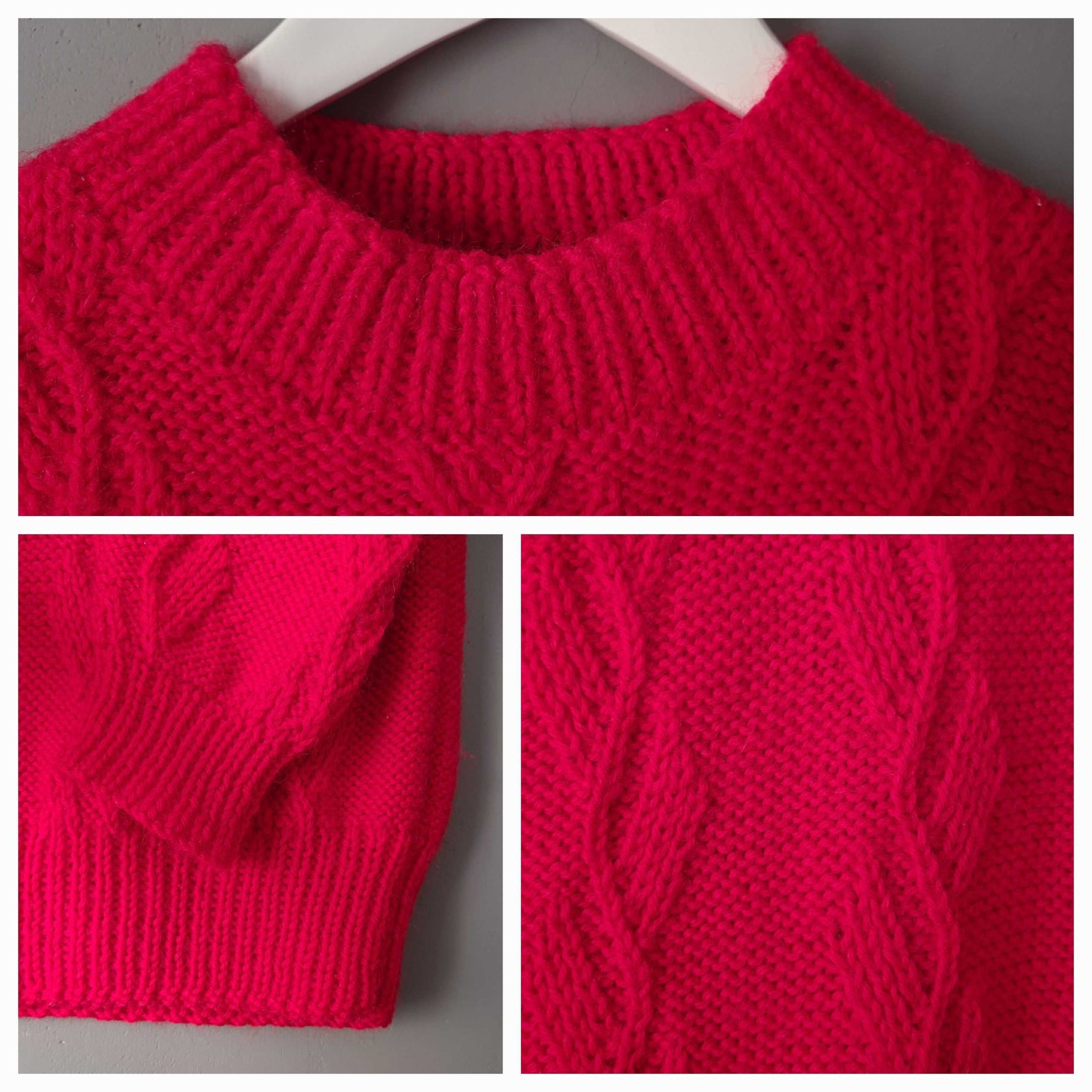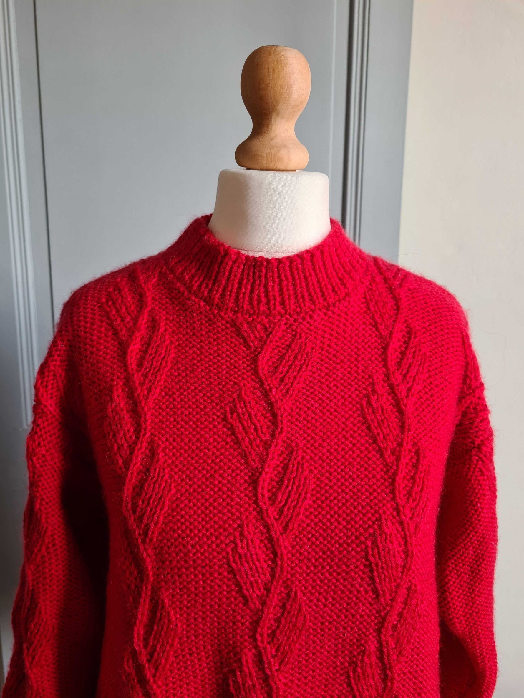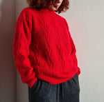 Pull à torsades en laine mélangée rouge cerise, col cheminée. Porté par une taille 36 sur les photos. Pièce unique tricotée à la main.