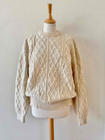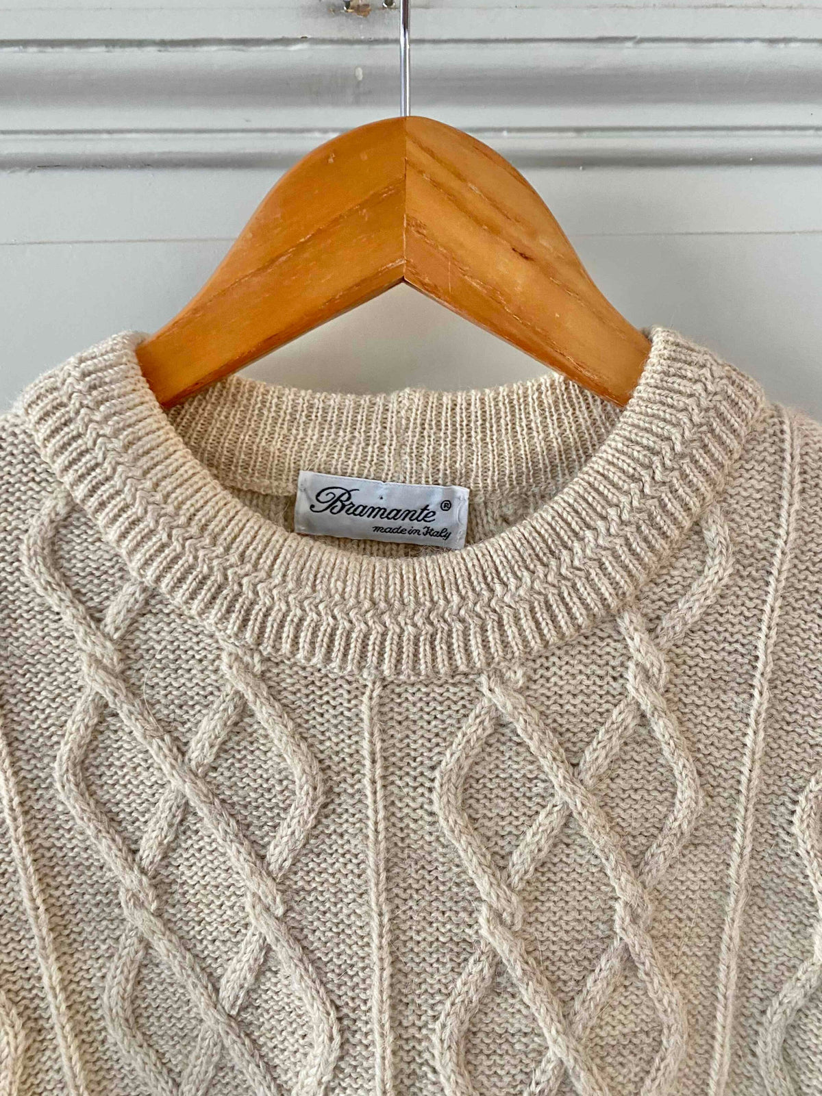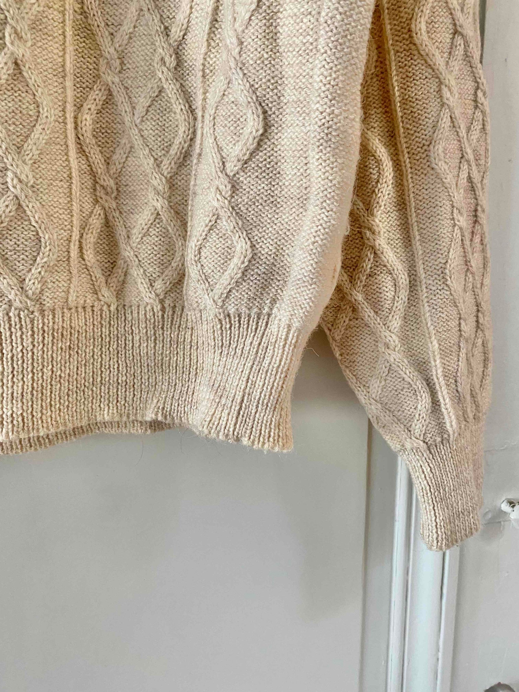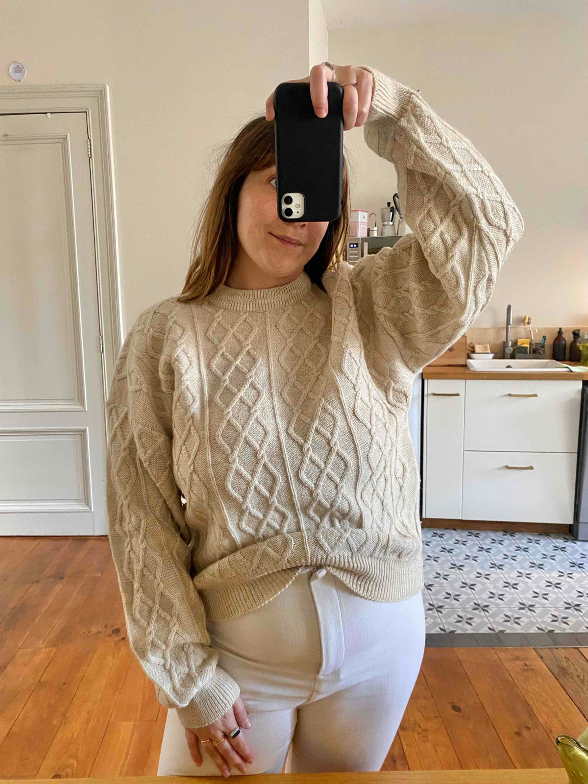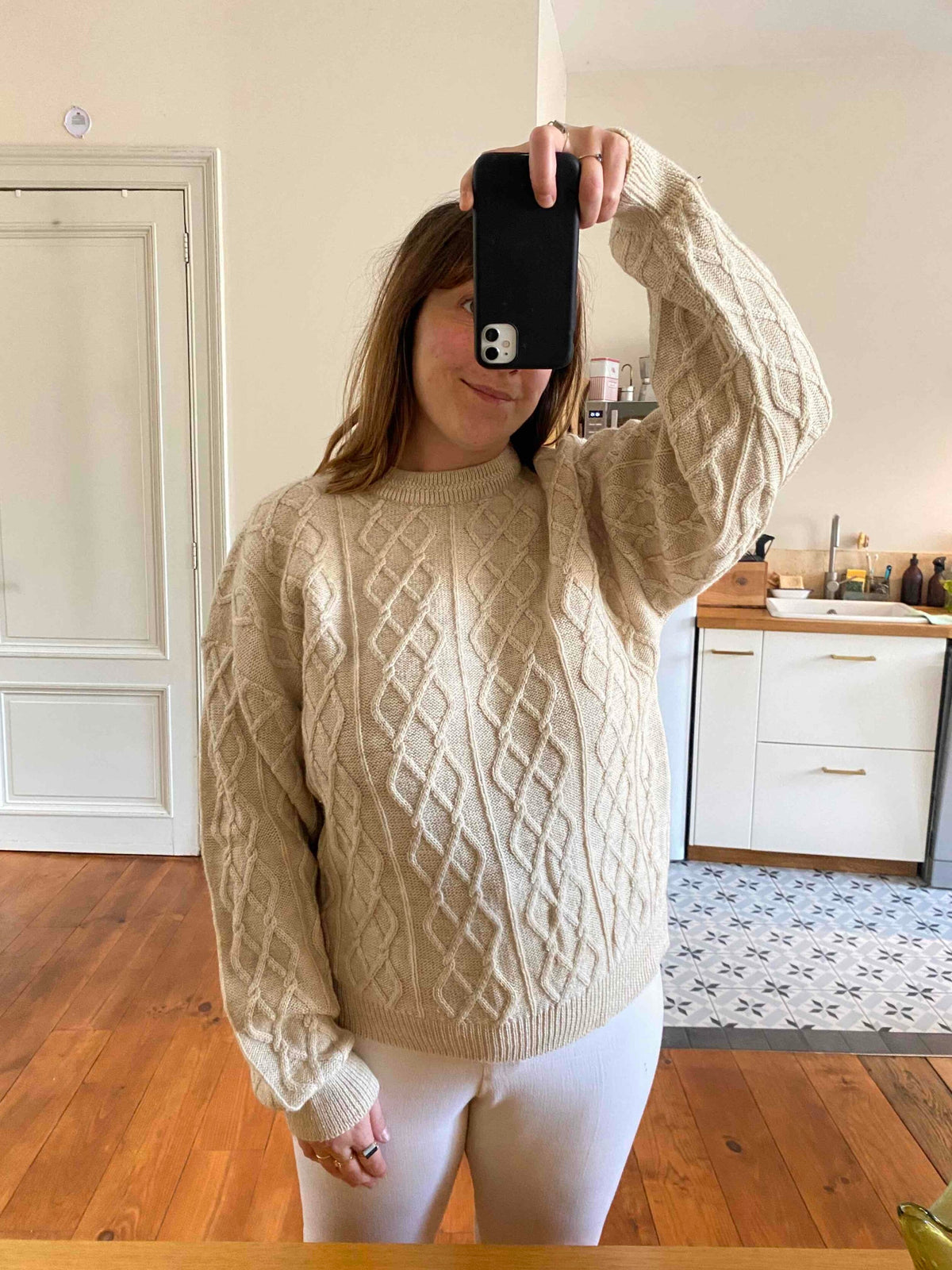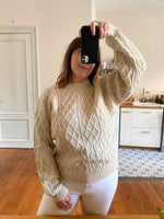 Pull Irlandais, en pure laine de mouton mérinos écrue chinée beige, tricot torsadé et joli point au col, fabriqué dans le tirol Italien, taille 38 et 40 porté ici sur un mannequin T36 et sur une personne T40.