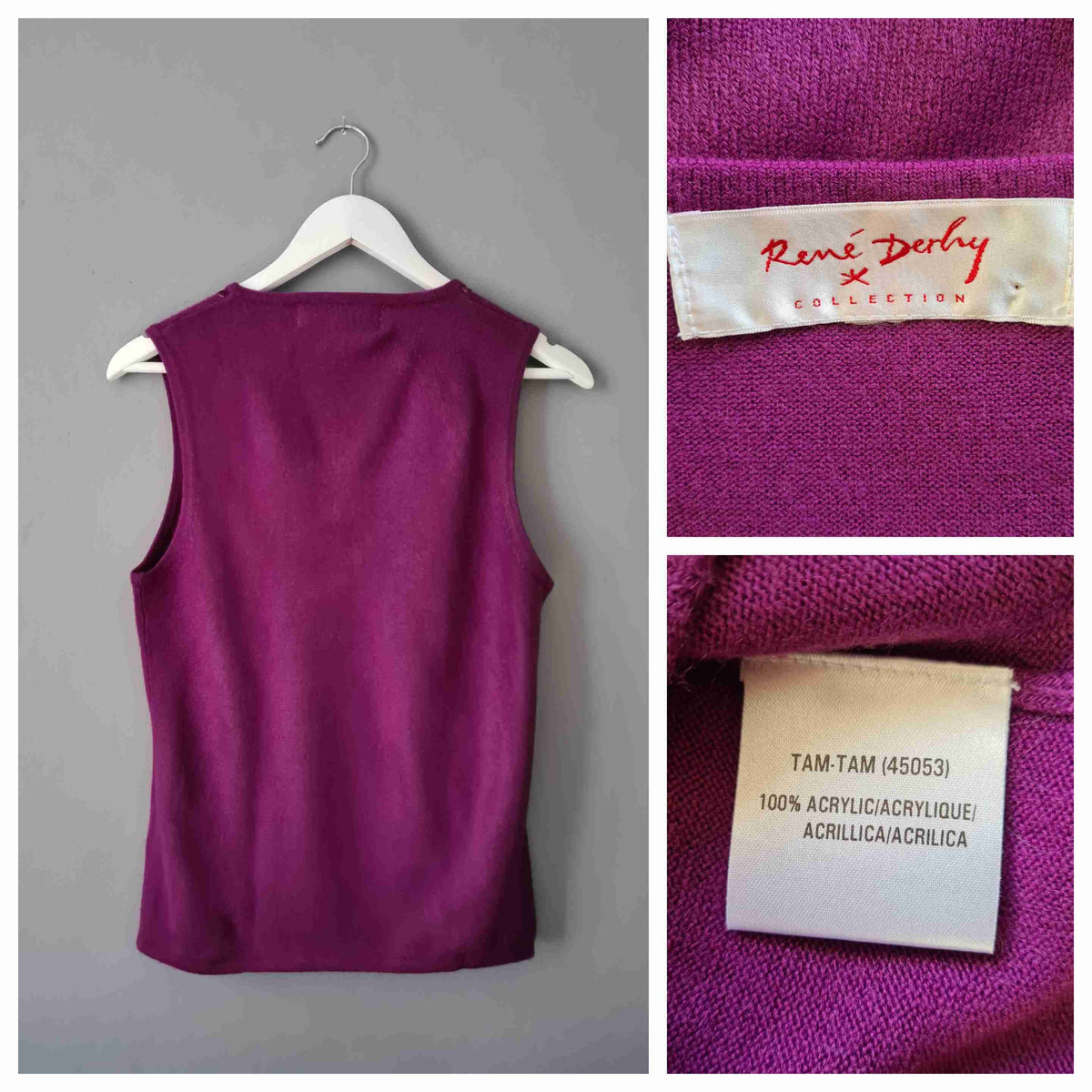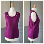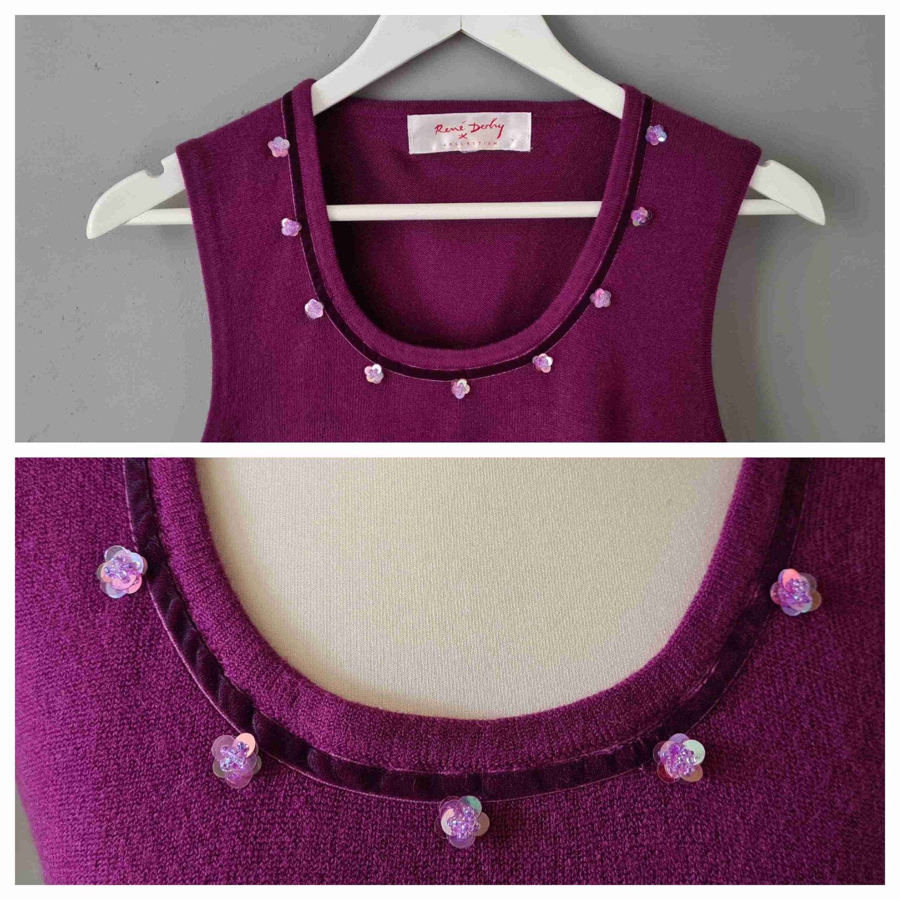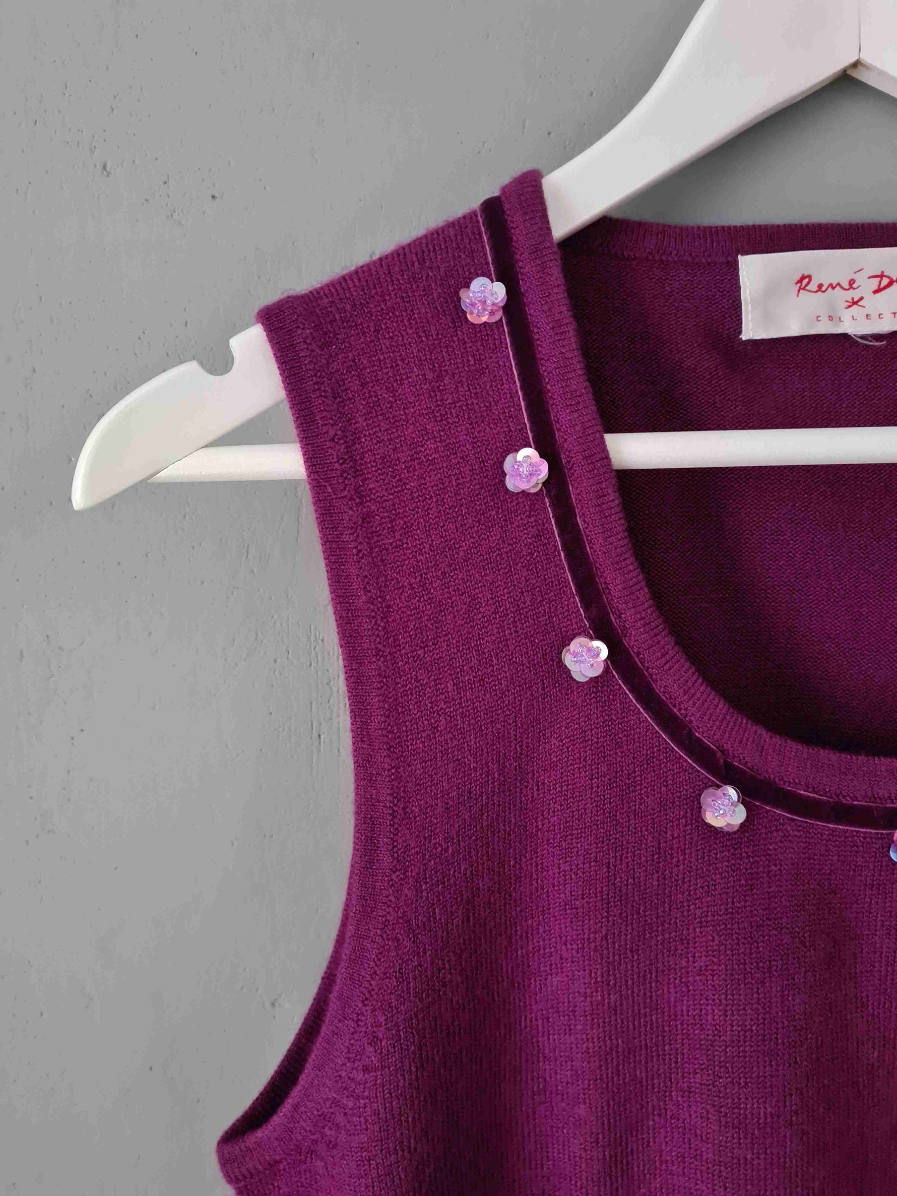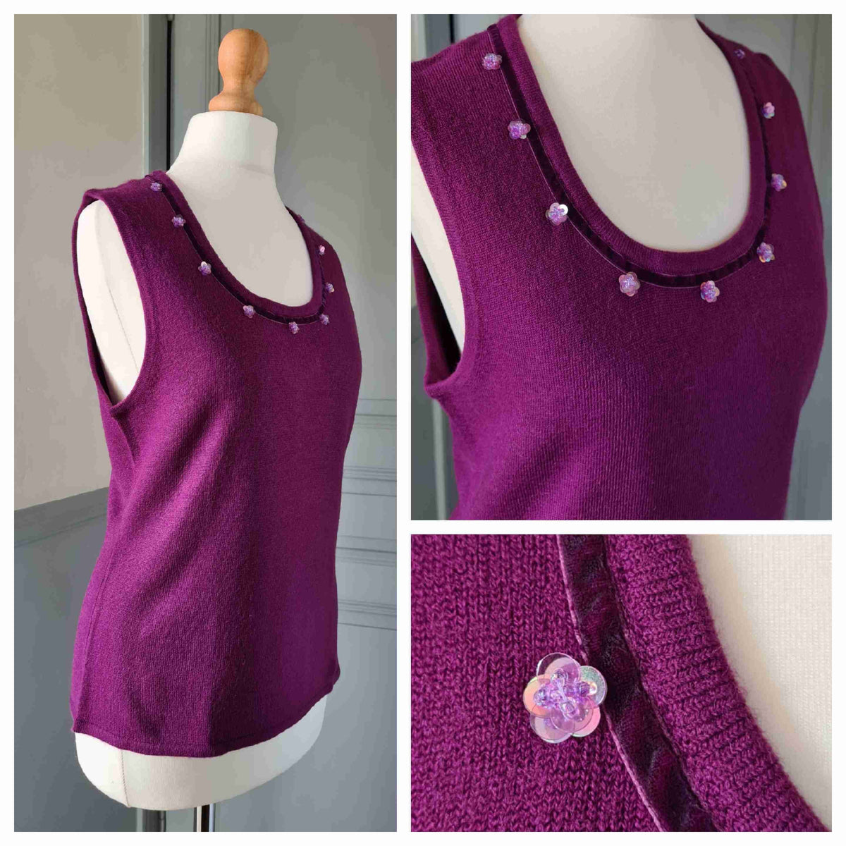 Prix unitaire parPull sans manches en maille coloris prune, encolure ronde bordée ruban velours et fleurs en perles et sequins. Marque René Derhy.