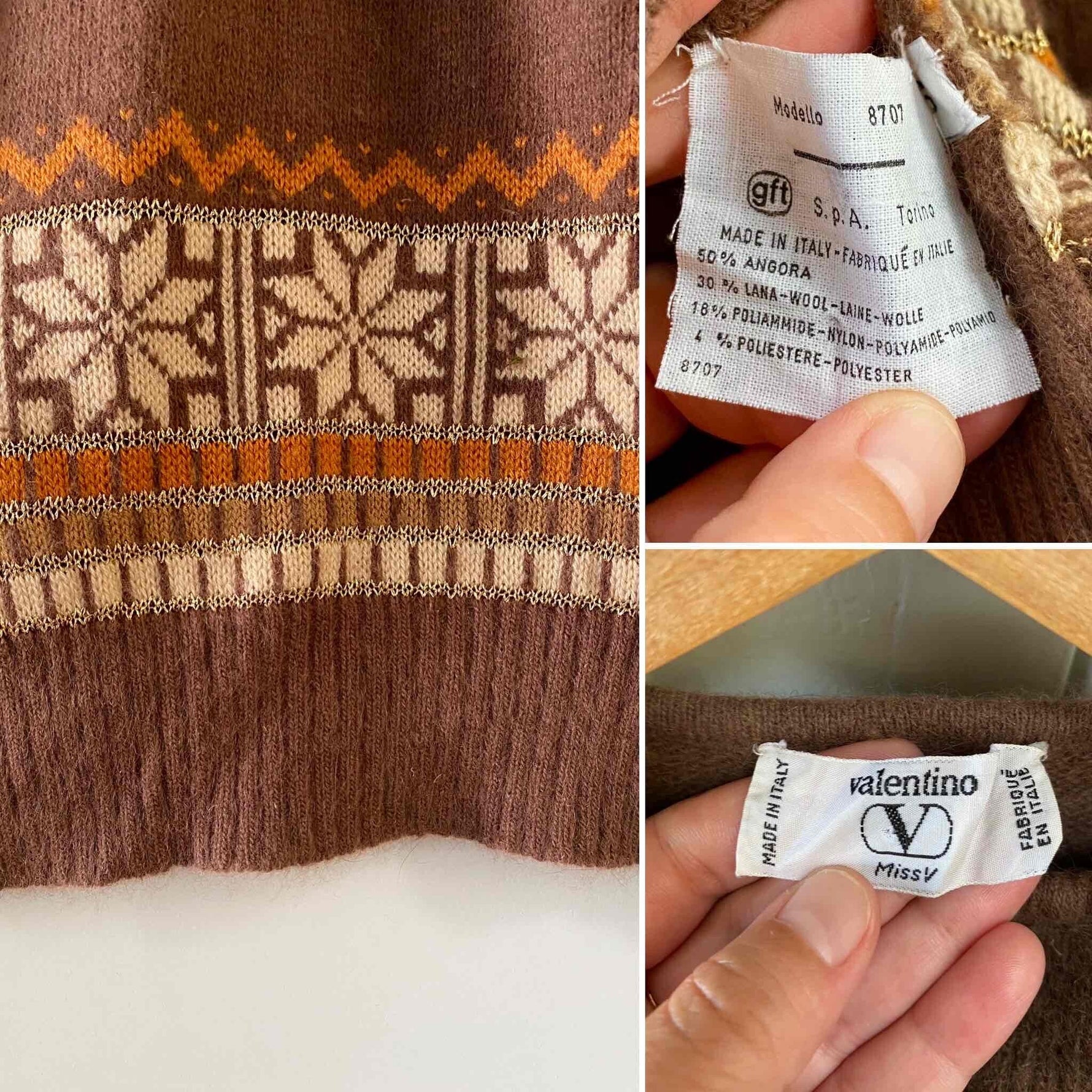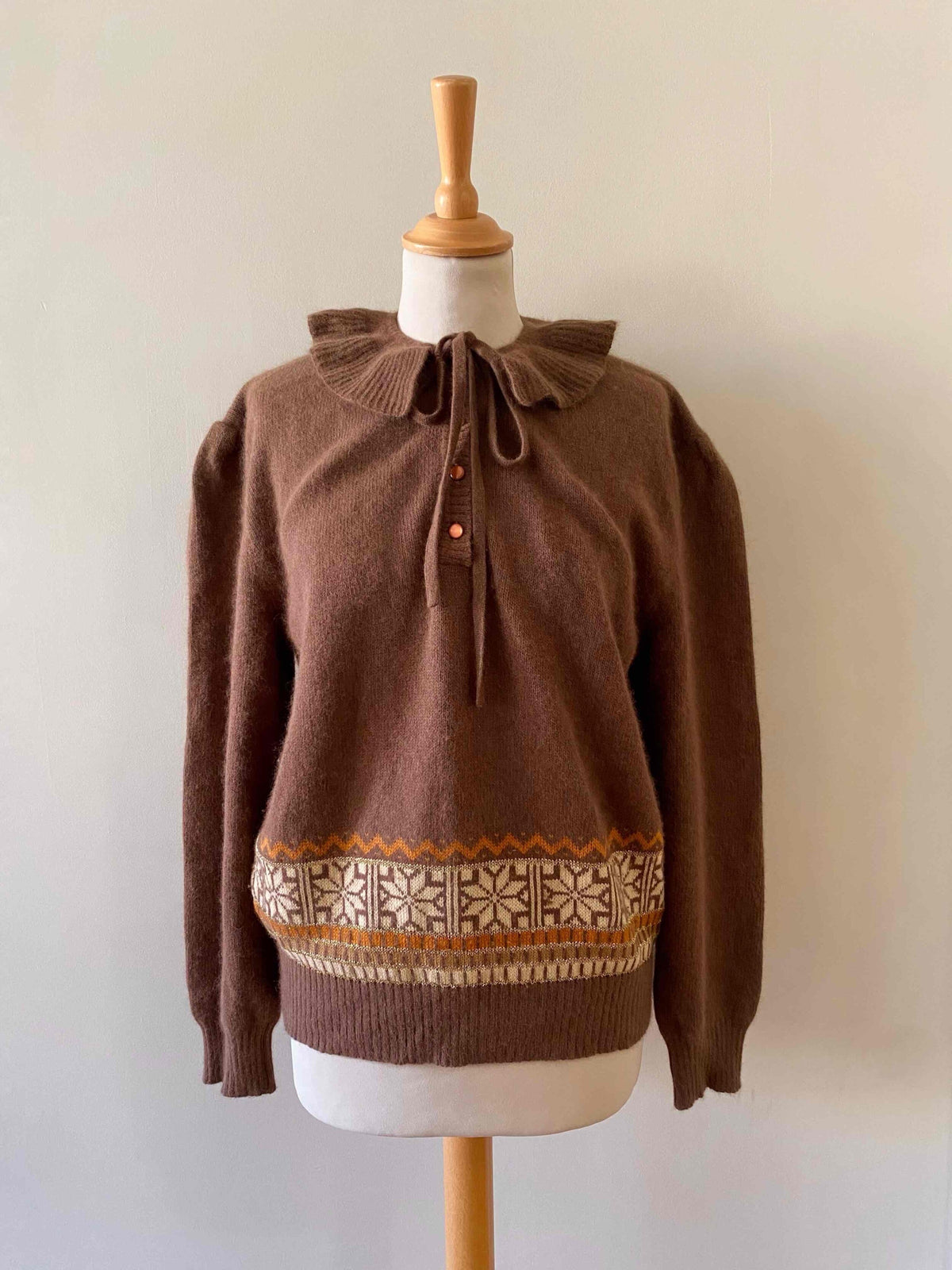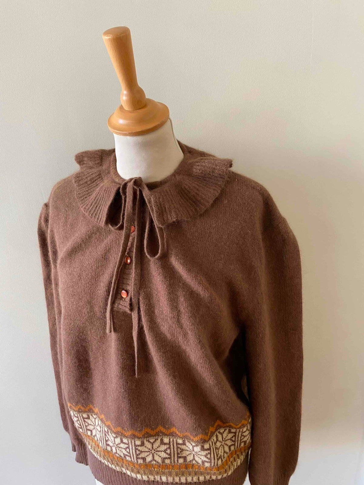 Pull Valentino, en laine et angora, chocolat, collerette à nouer et boutons, frise en jacquard lurex doré et orange en bas motifs flocons de neige, fabriqué en Italie, taille 36 et 38 porté ici sur un mannequin taille 36.