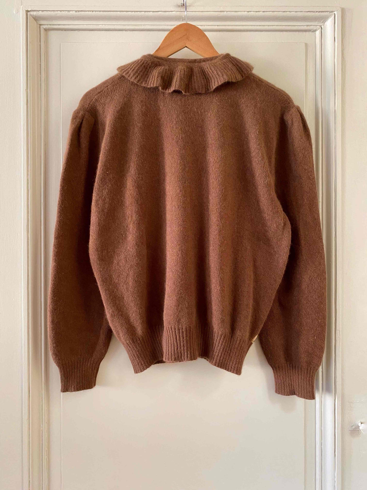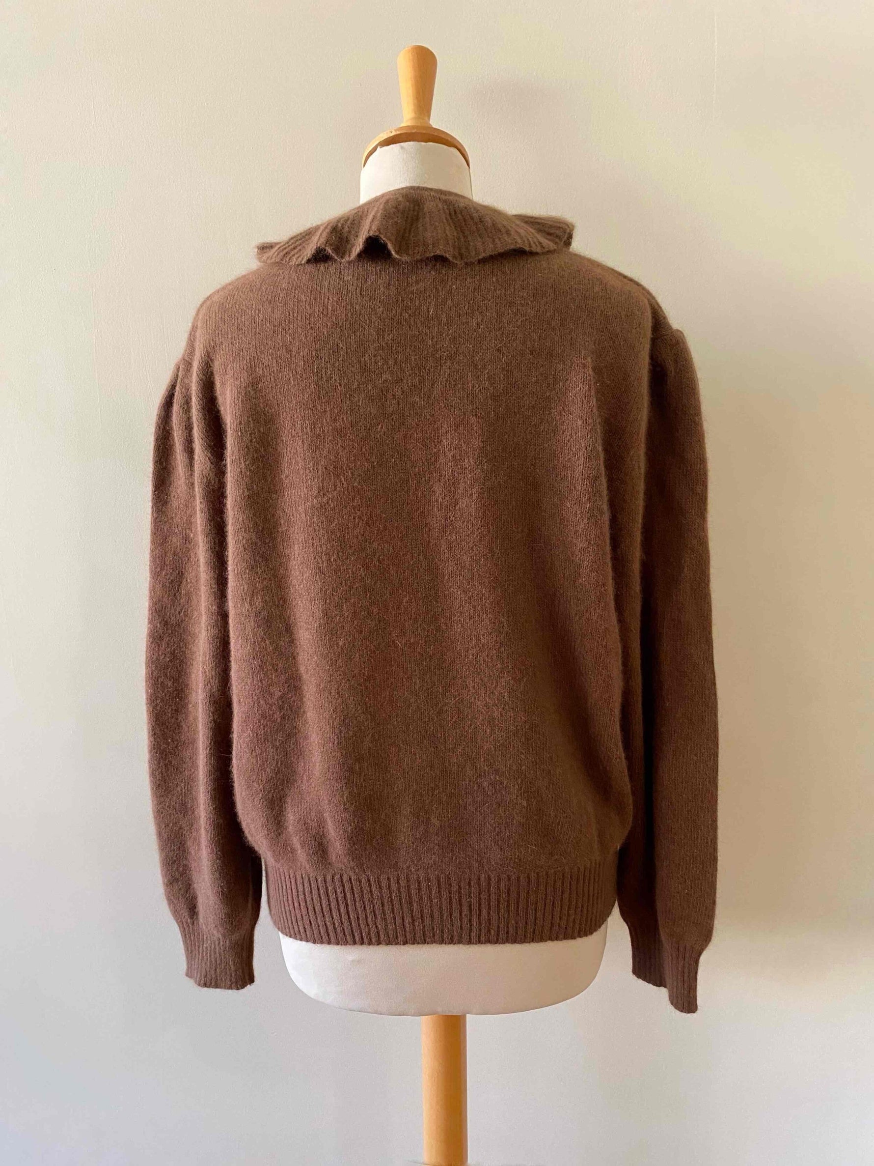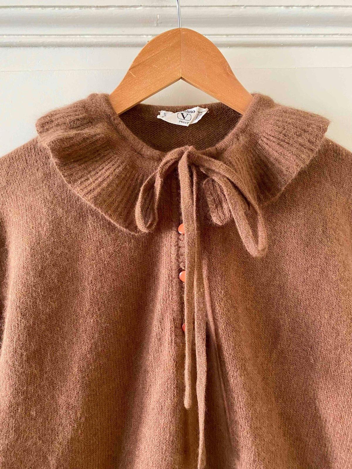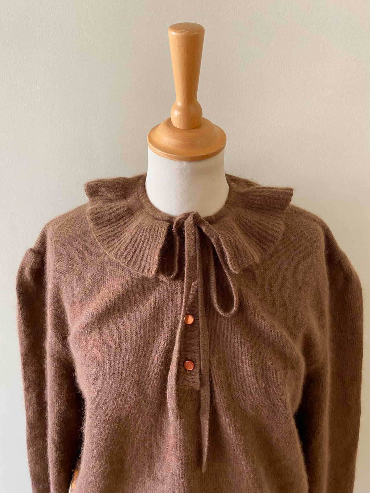 Pull Valentino, en laine et angora, chocolat, collerette à nouer et boutons, frise en jacquard lurex doré et orange en bas motifs flocons de neige, fabriqué en Italie, taille 36 et 38 porté ici sur un mannequin taille 36.