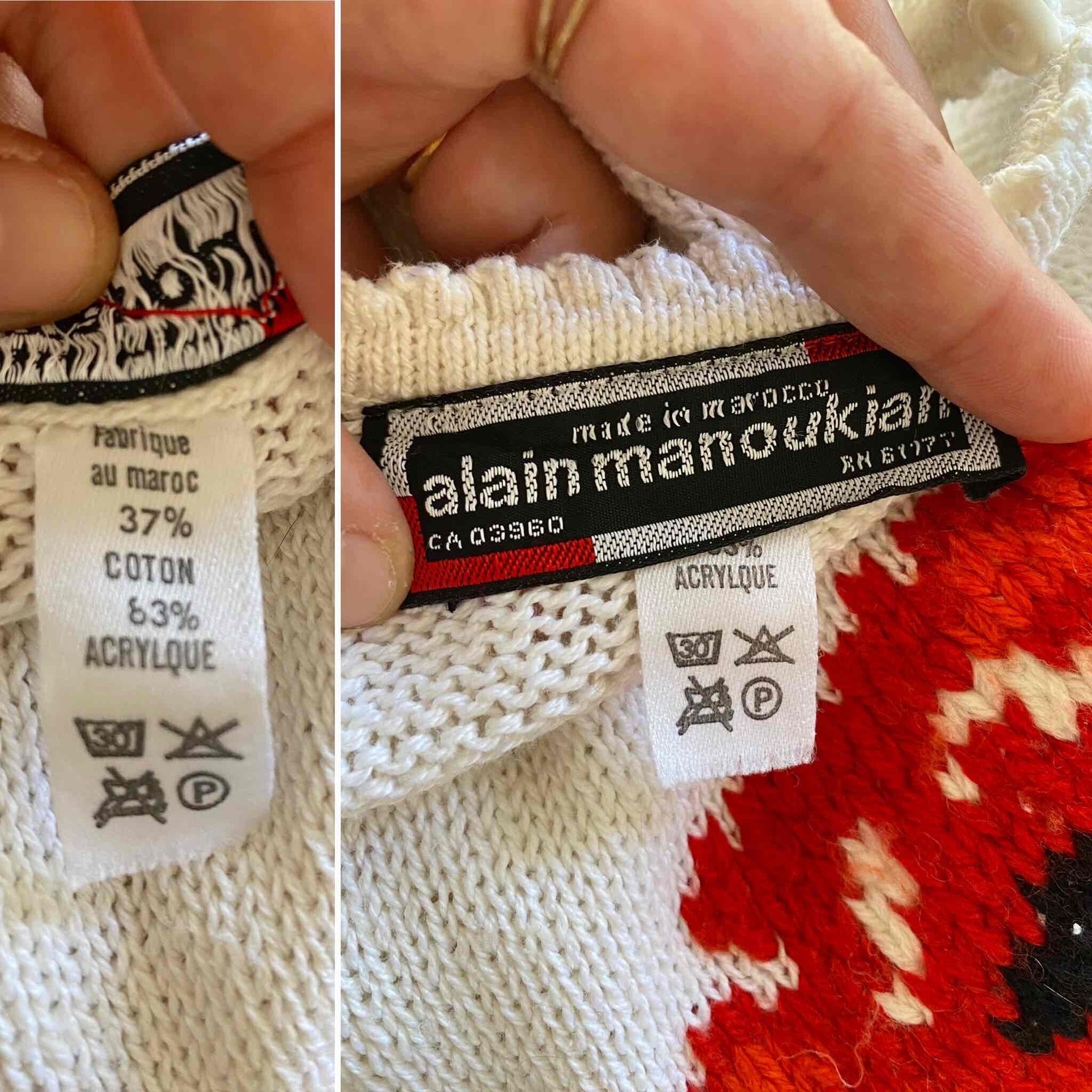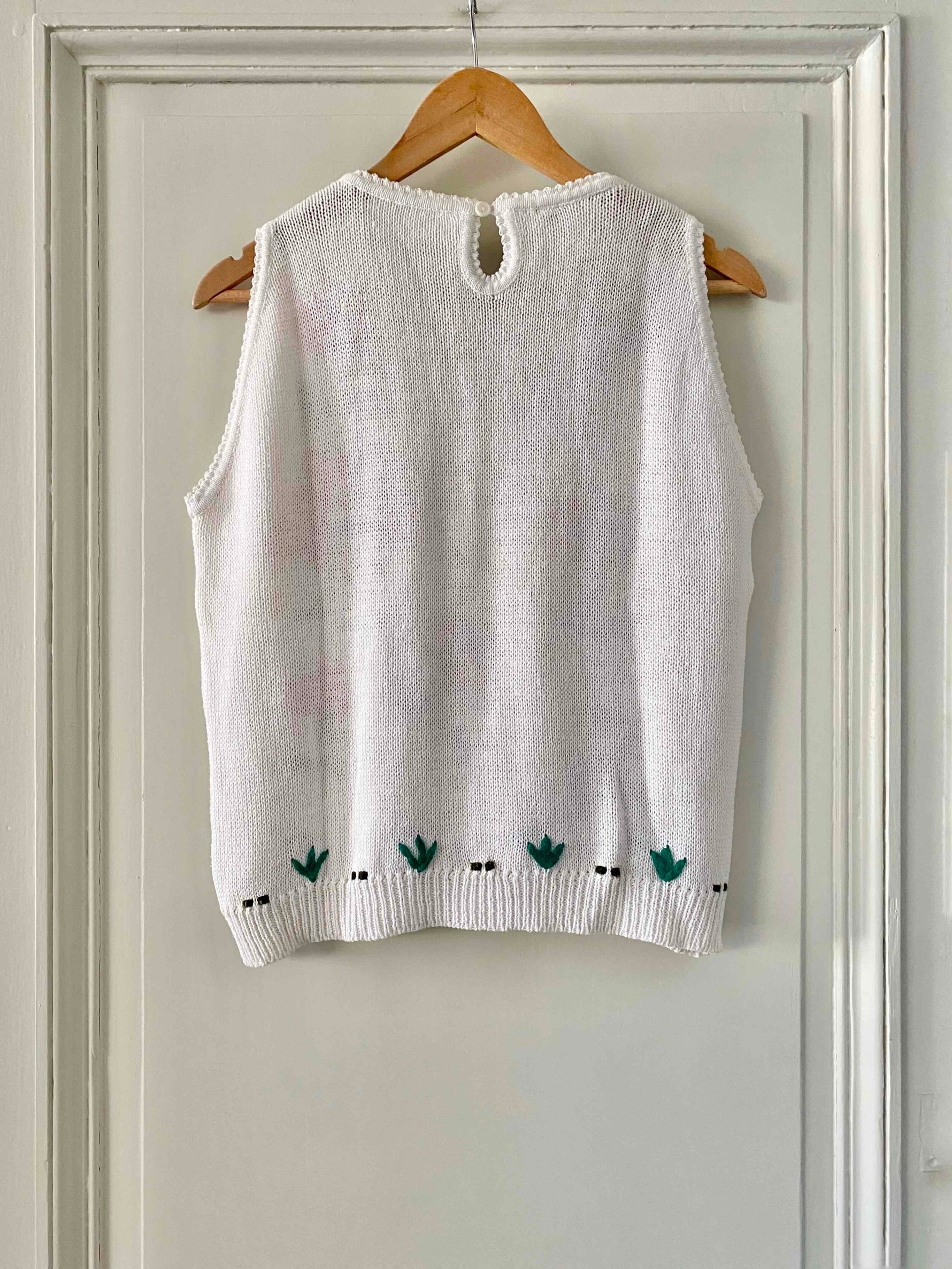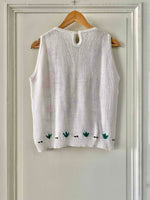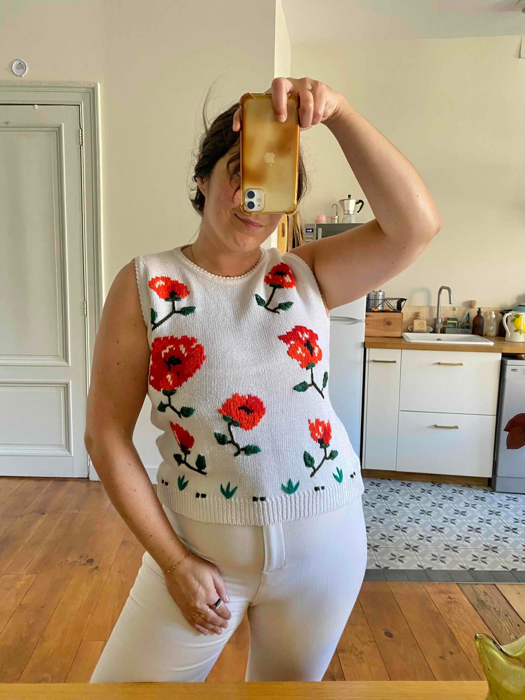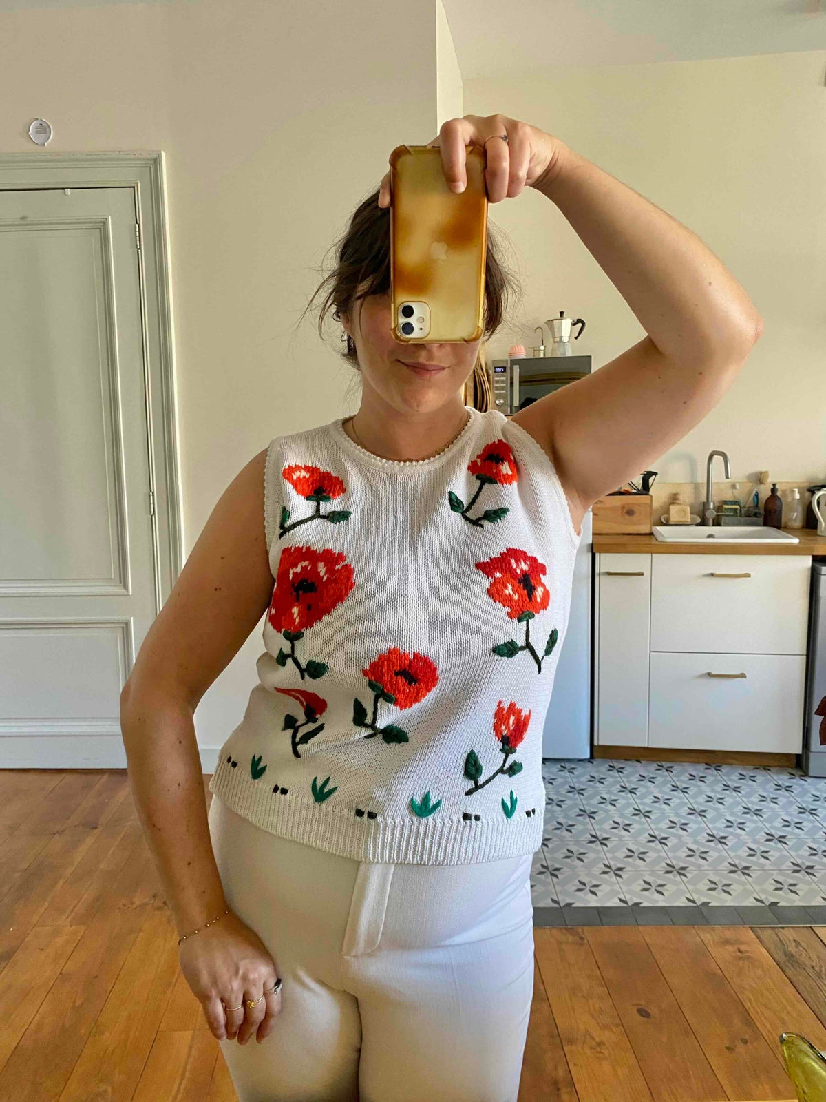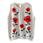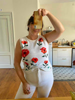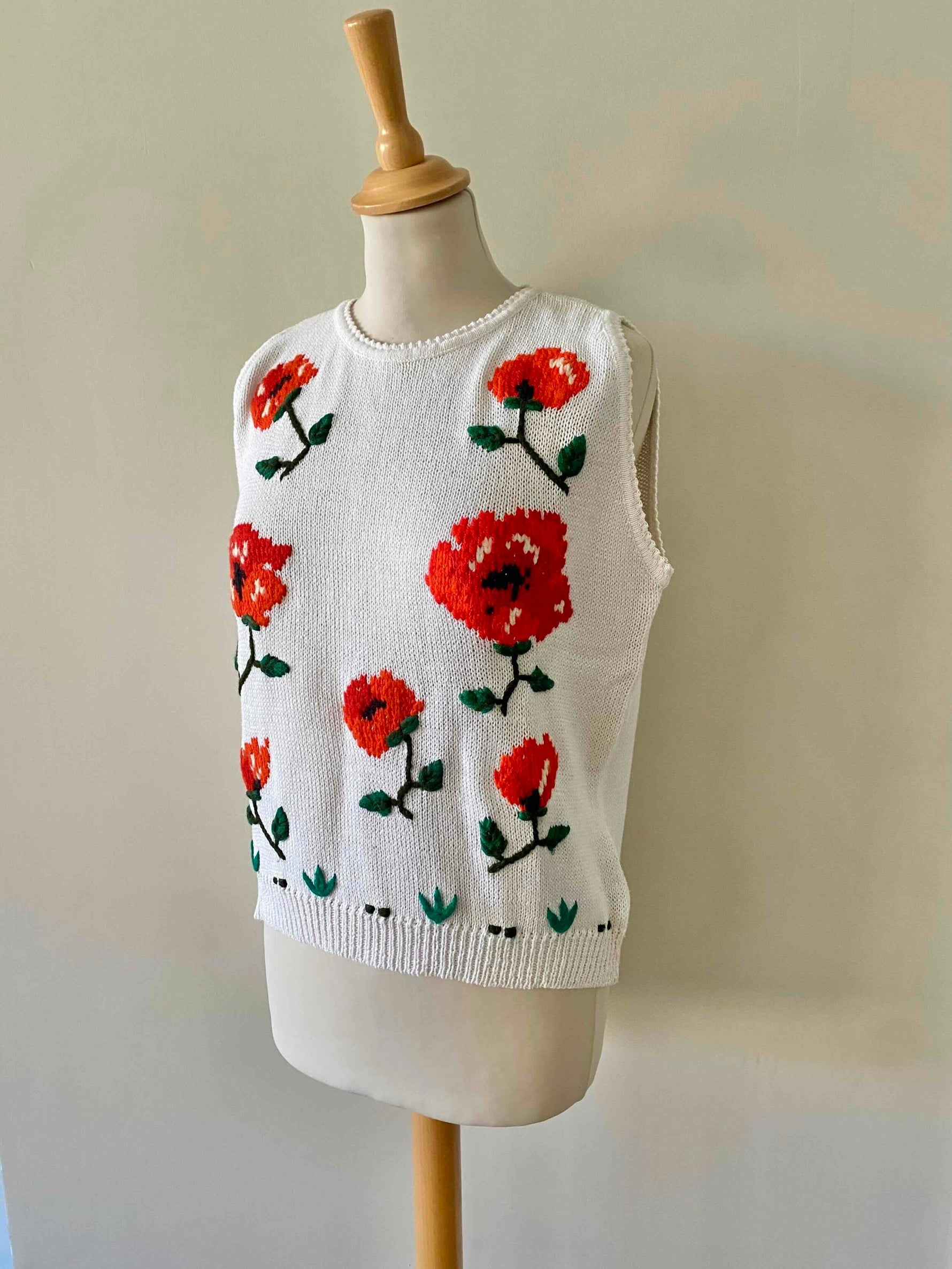 Prix unitaire parTop brodé en maille, coton acrylique blanc, pull sans manches rebrodé de roses rouges et vertes, col ras de cou à bouton dos, Alain Manoukian 80’s, fabriqué au Maroc, taille 38 et 40 porté ici sur un mannequin T36 et sur une personne T40.
