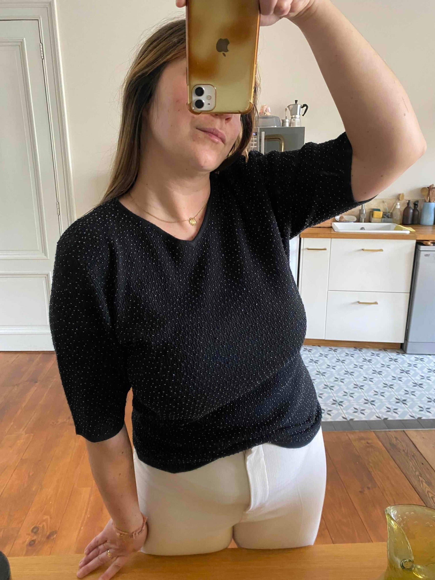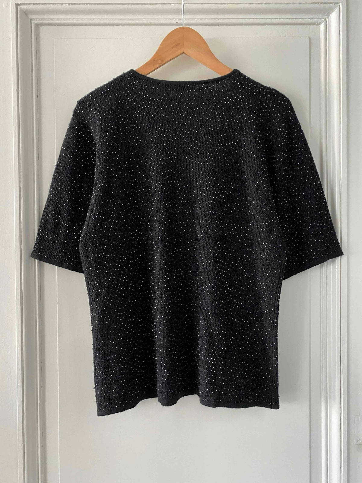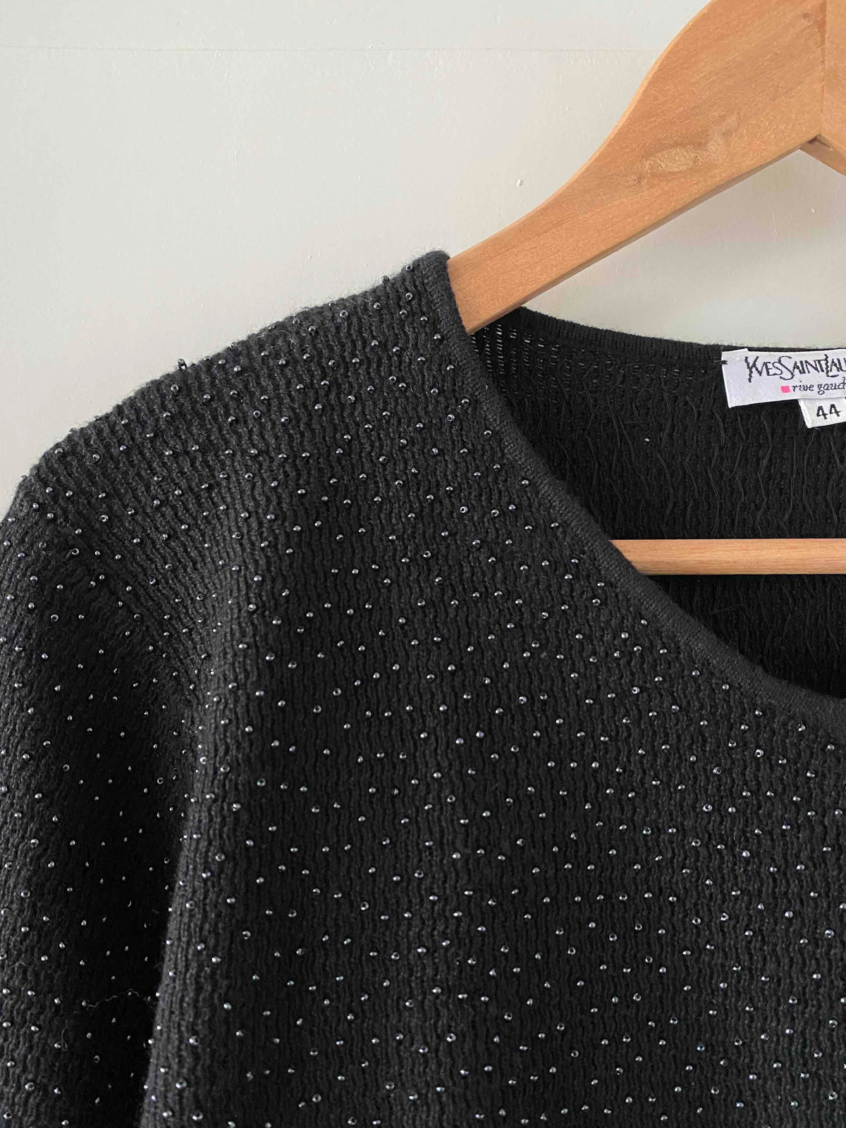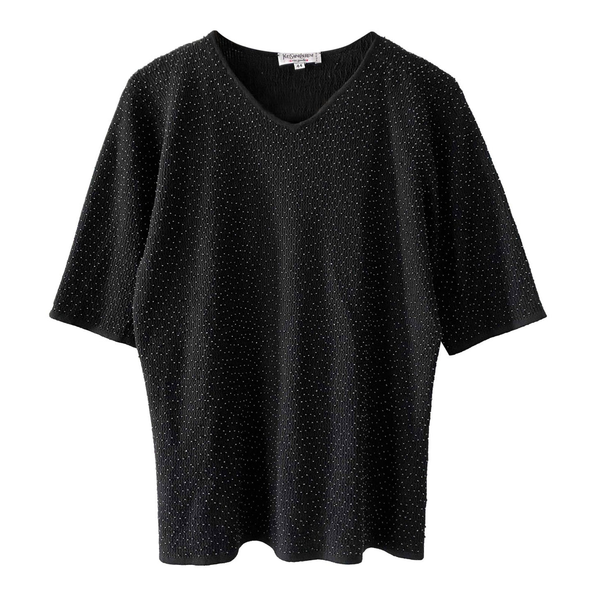 Prix unitaire parTop Yves Saint Laurent en maille de soie et cachemire entièrement brodé de minis perles noires ton sur ton, fabriqué en France, y2k, taille 38 et 40 porté ici sur une personne T40.