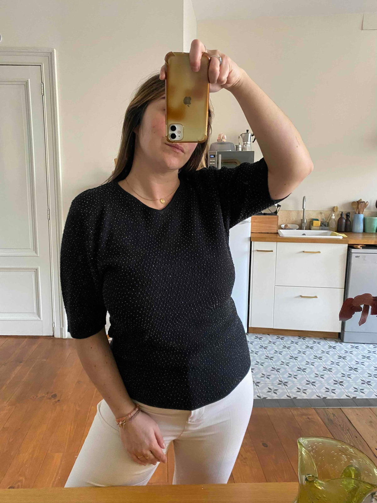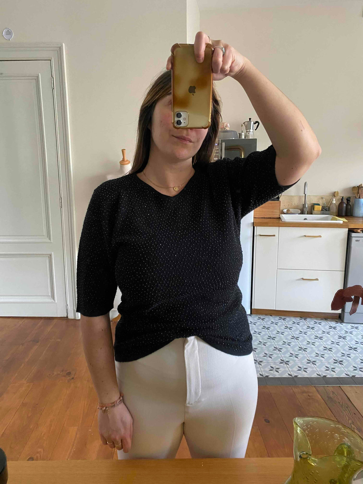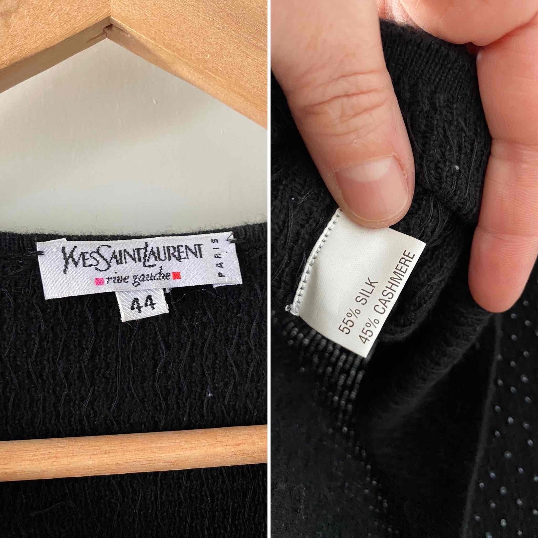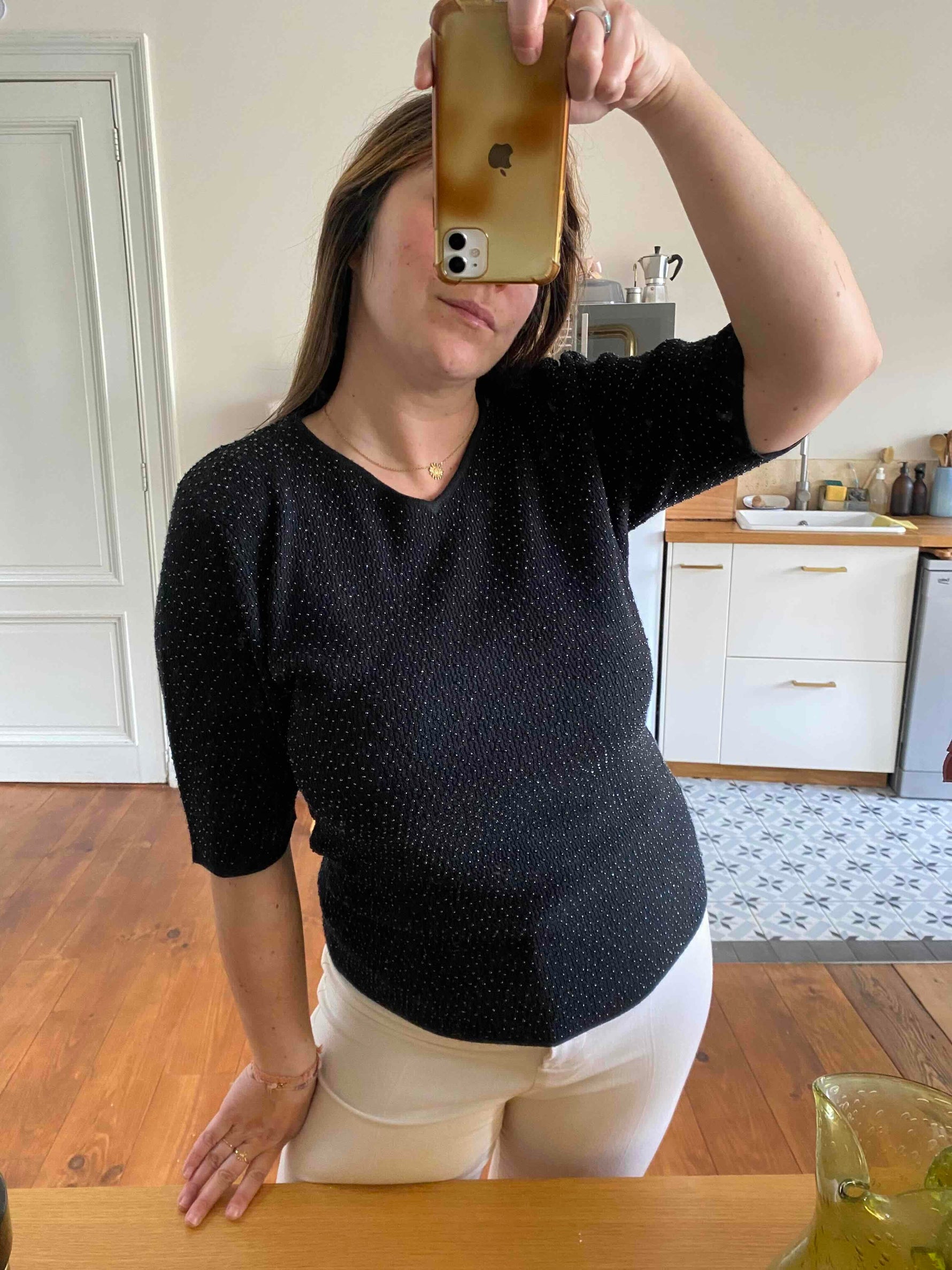 Prix unitaire parTop Yves Saint Laurent en maille de soie et cachemire entièrement brodé de minis perles noires ton sur ton, fabriqué en France, y2k, taille 38 et 40 porté ici sur une personne T40.