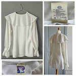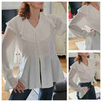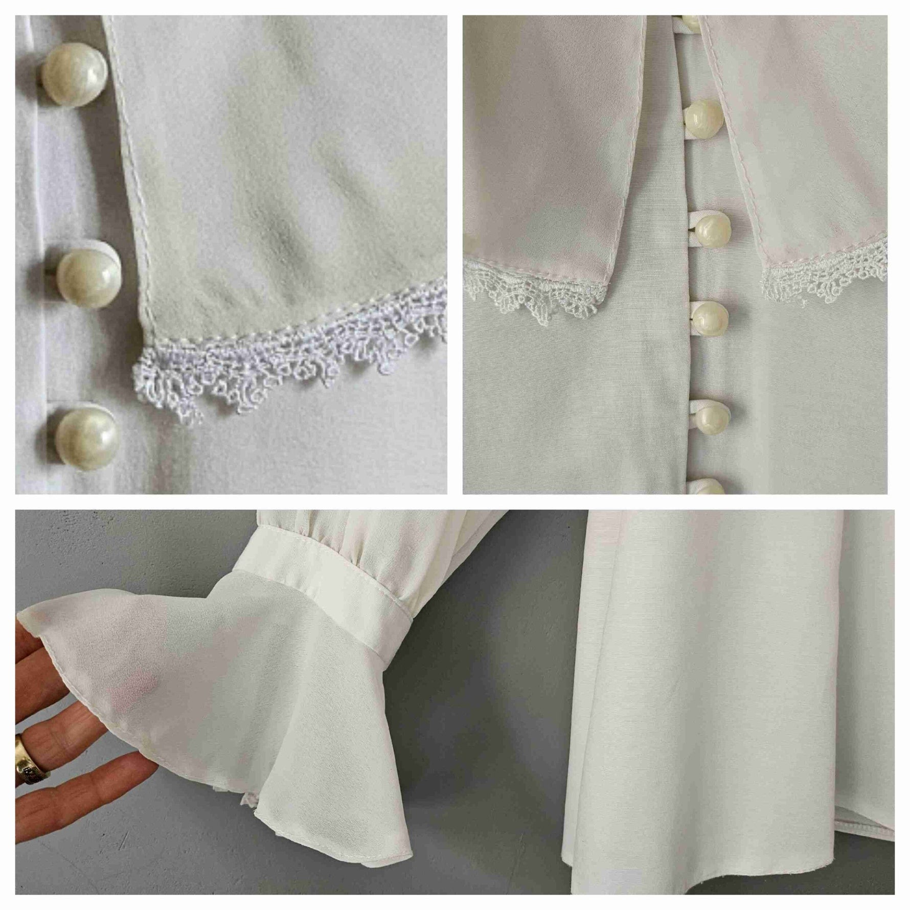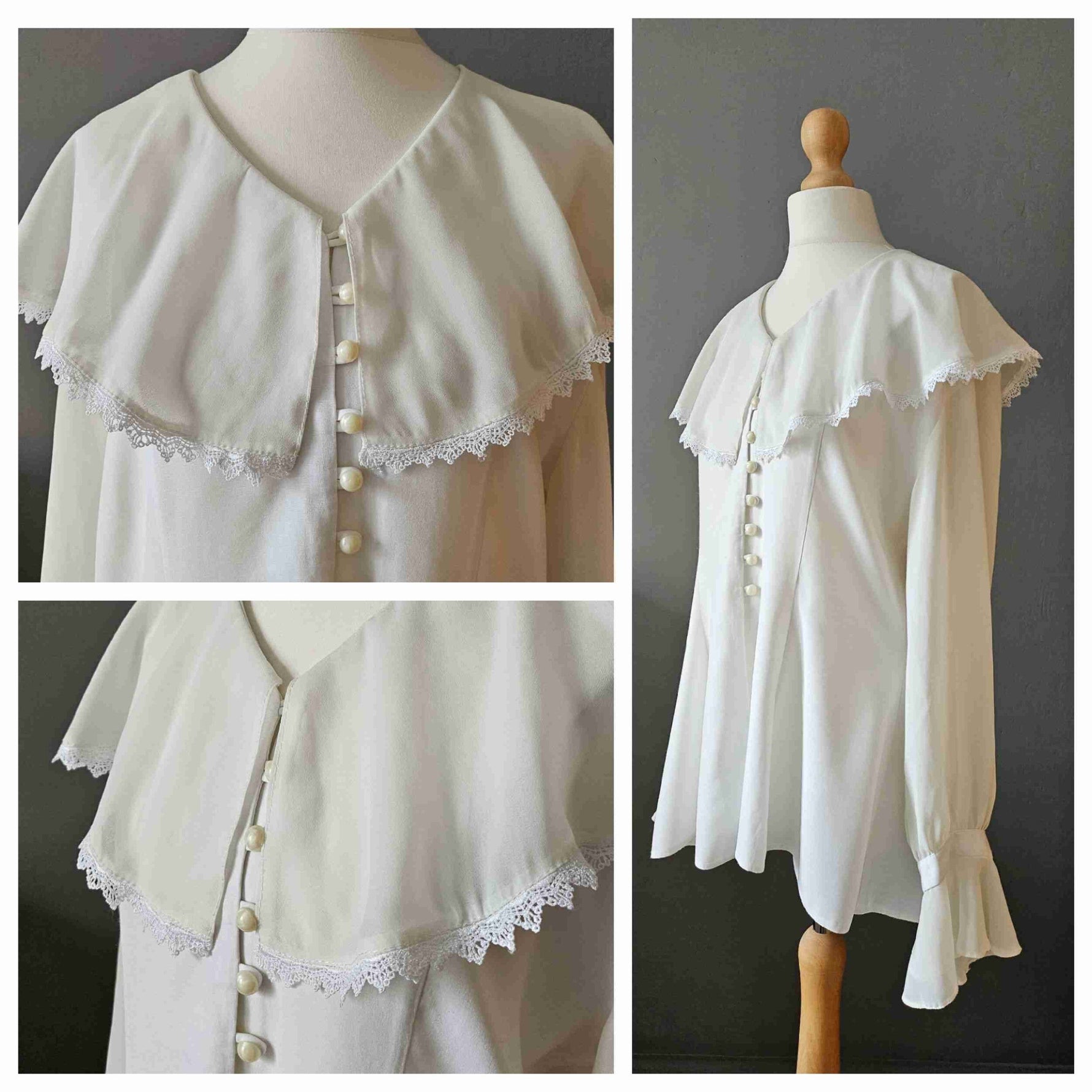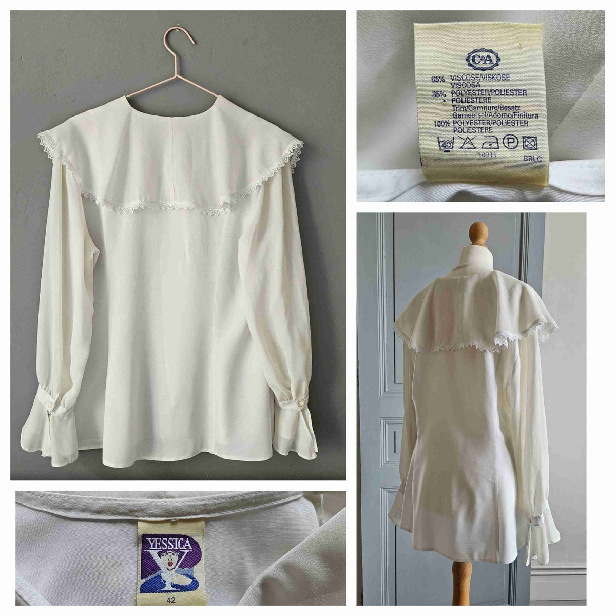 Prix unitaire parChemise en viscose à grand col bordé de dentelle, manches à poignets boutonnés volantés (col et manches en synthétique écru), coupe à empiècements, légèrement cintrée base ondulante, boutonnière bride nacrée. Porté sur les photos par une personne T36.