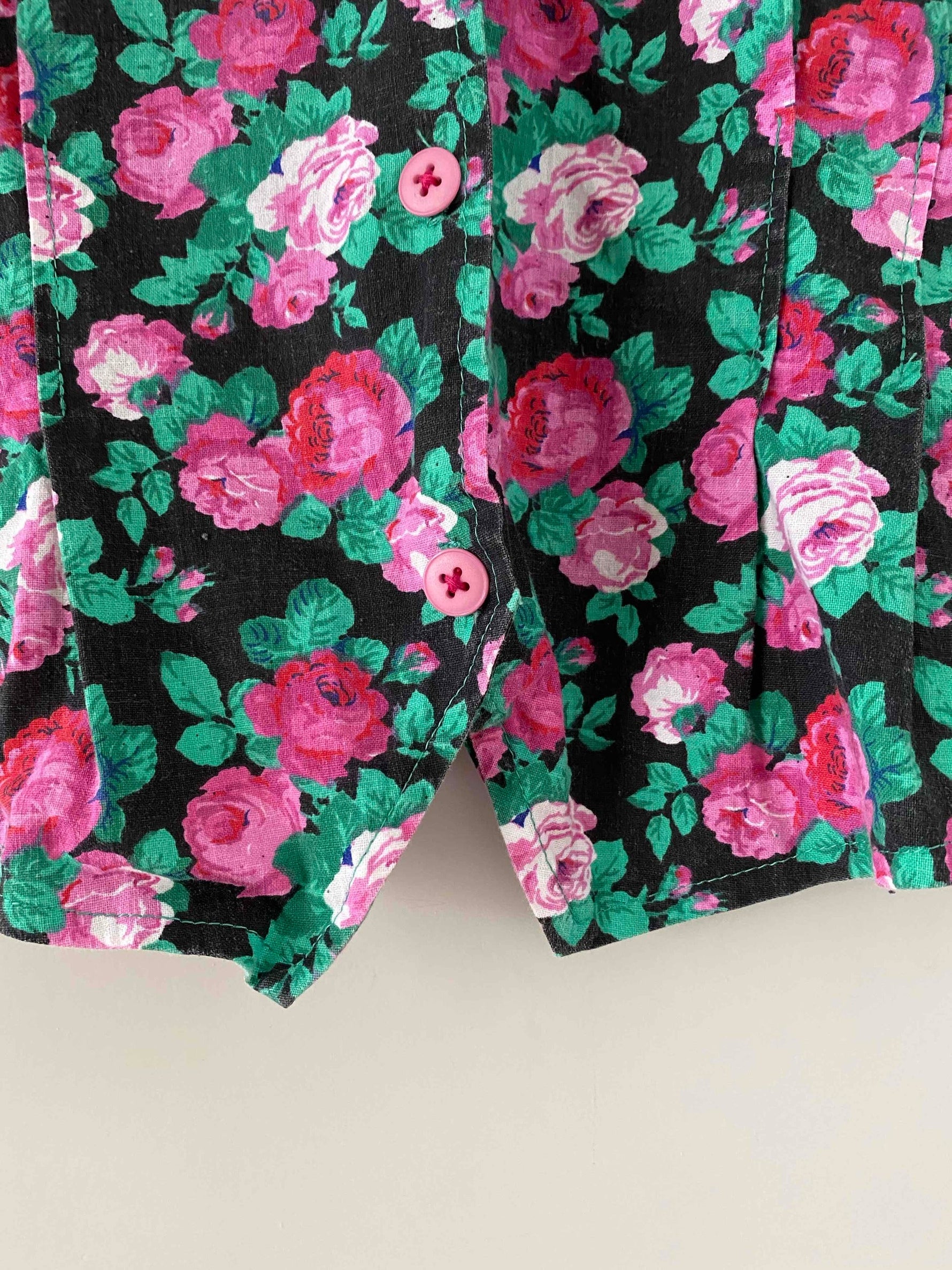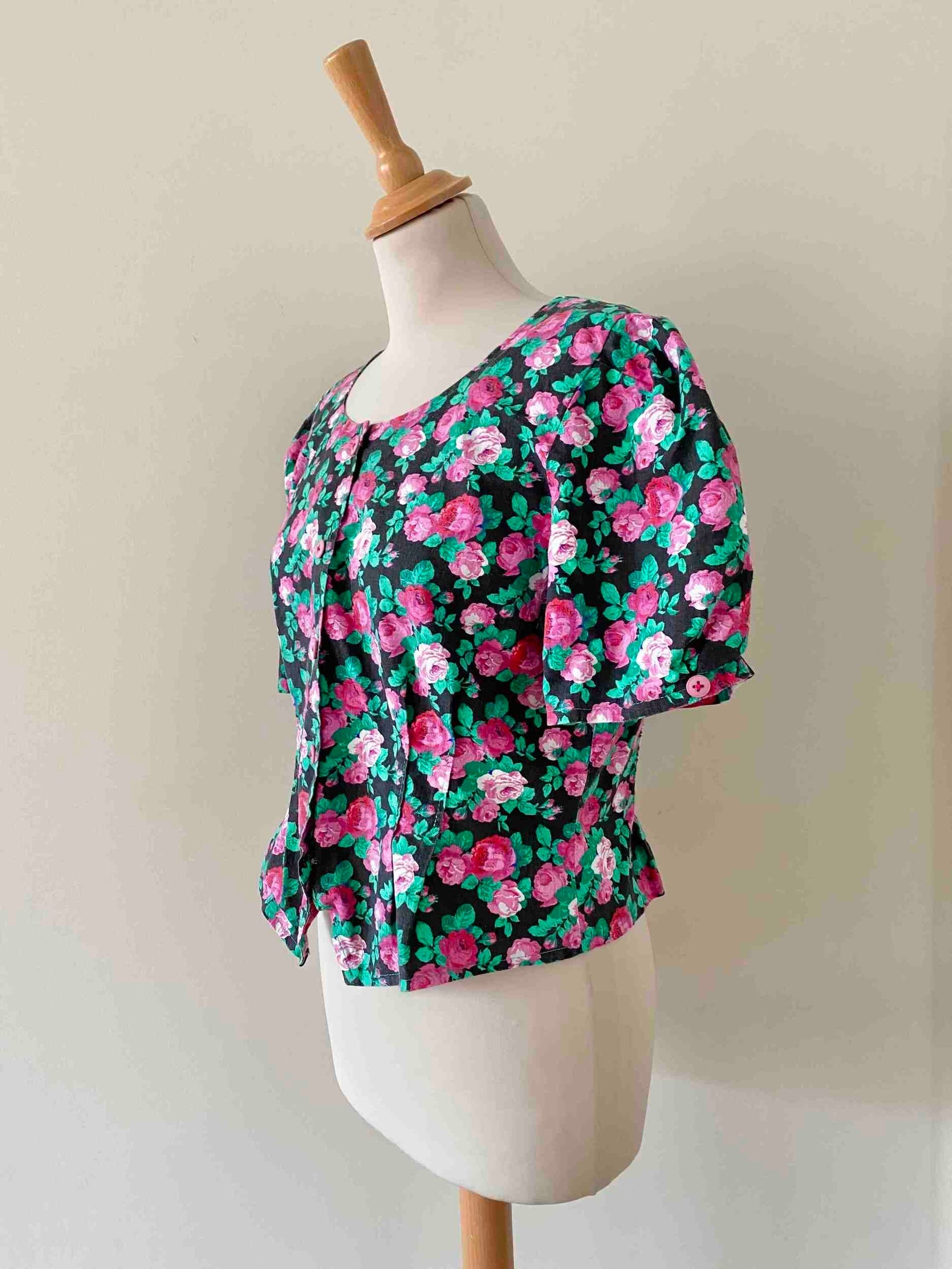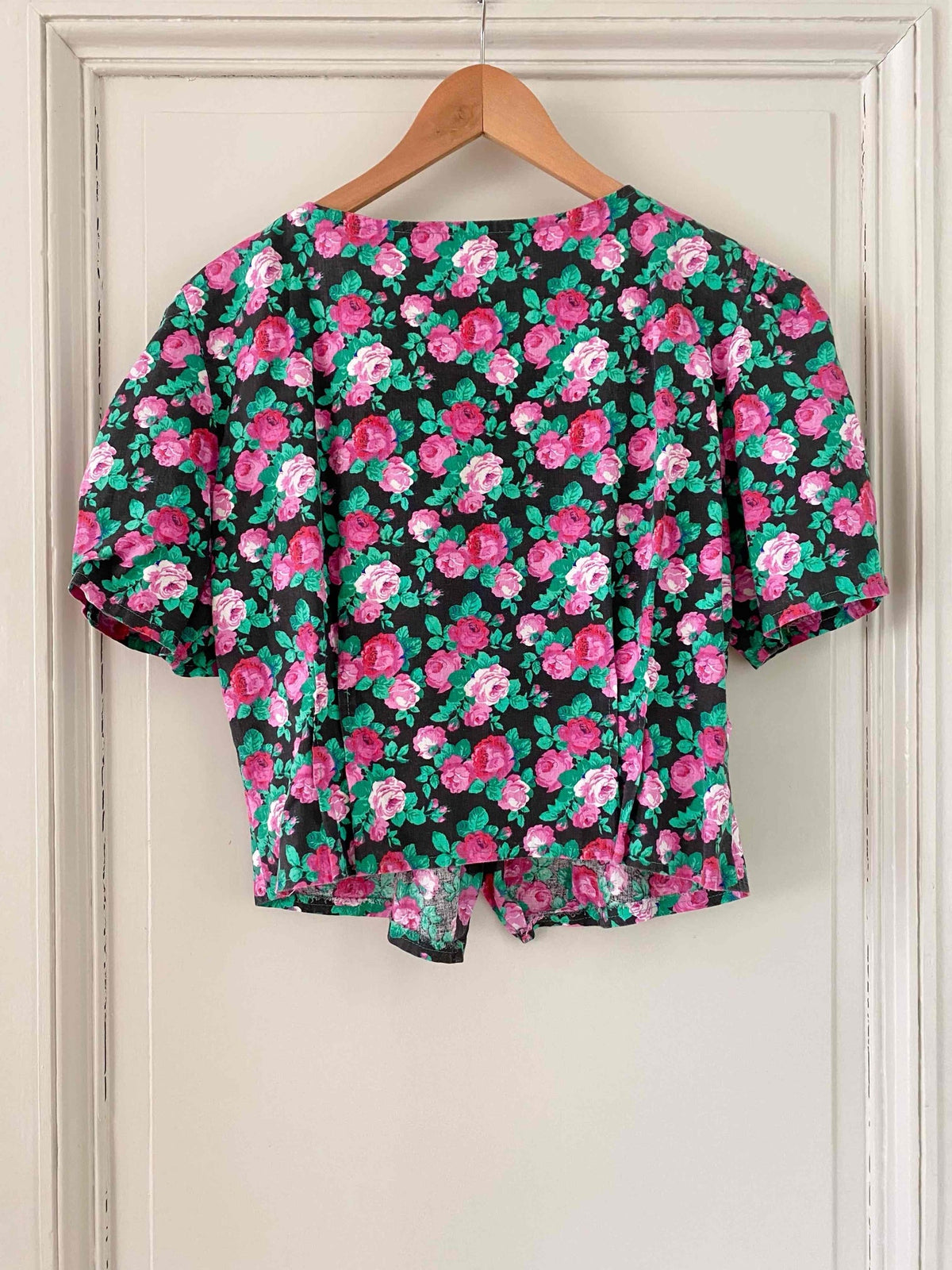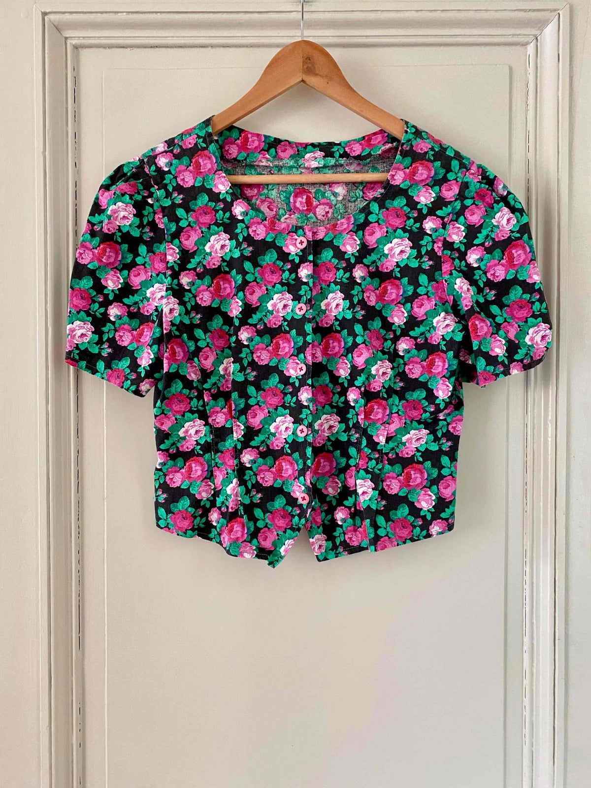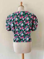Prix unitaire parBlouse Crop à Fleurs en coton noir imprimé fleurs roses fuschia et vertes, manches ballons, taille haute ceintrée, boutonnée.