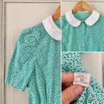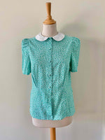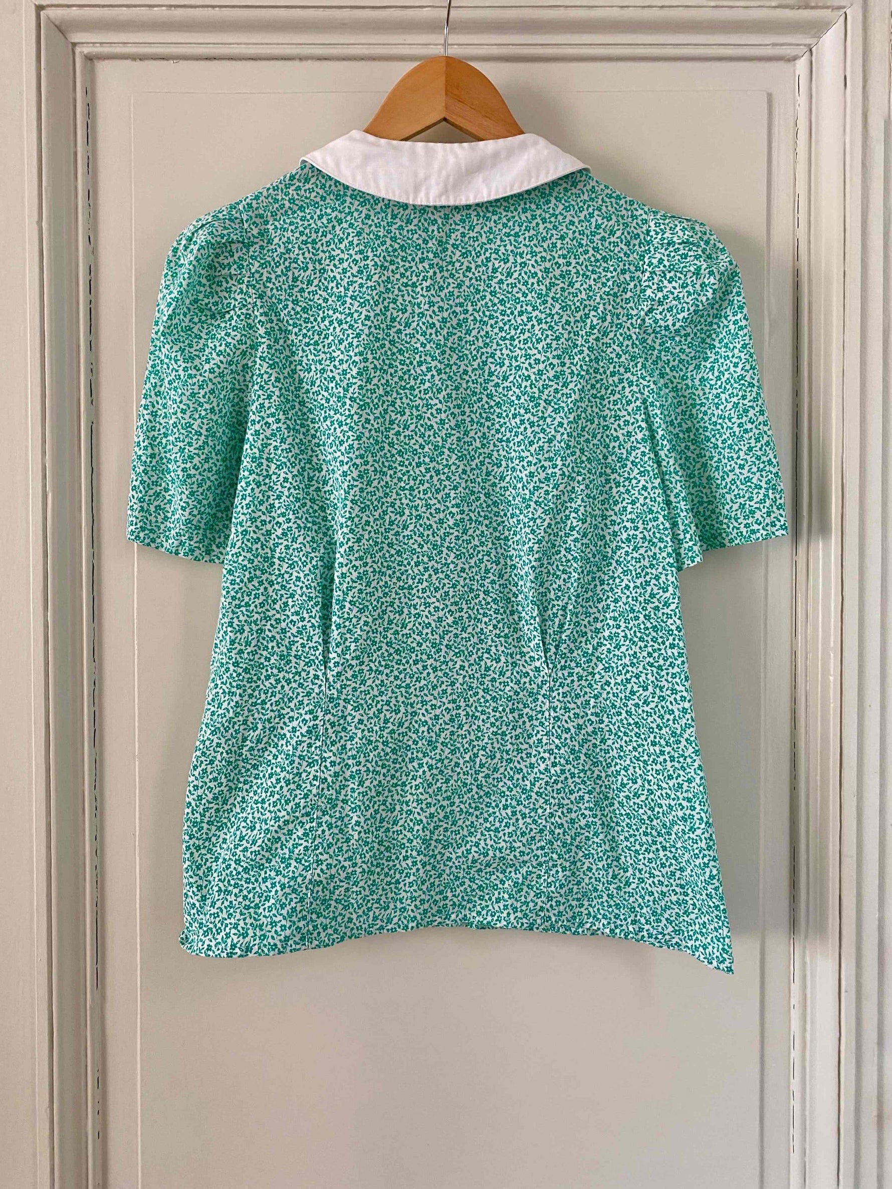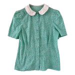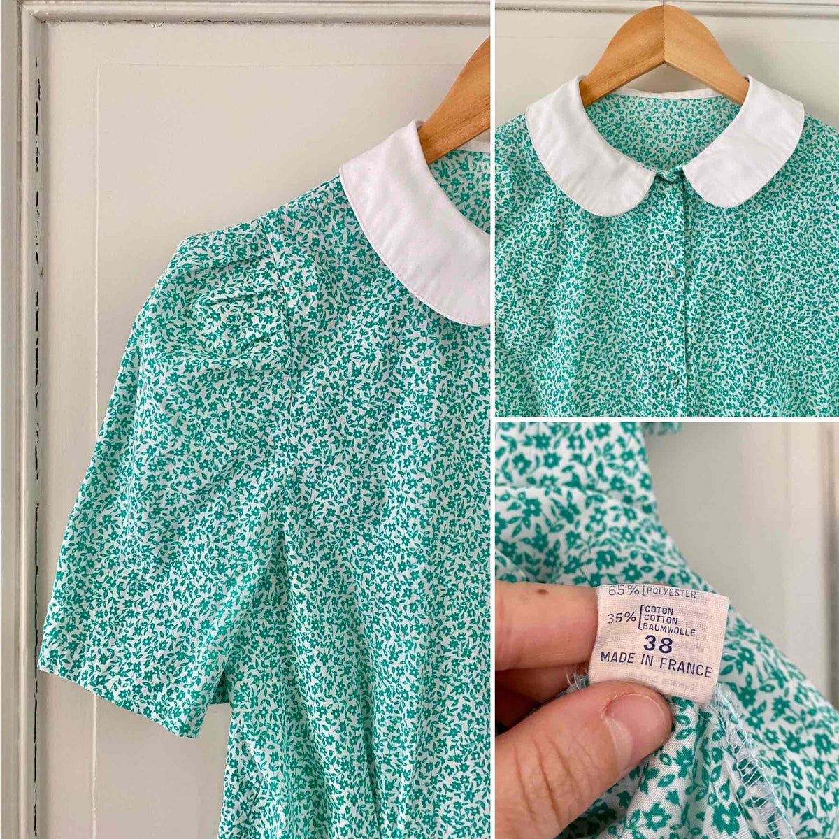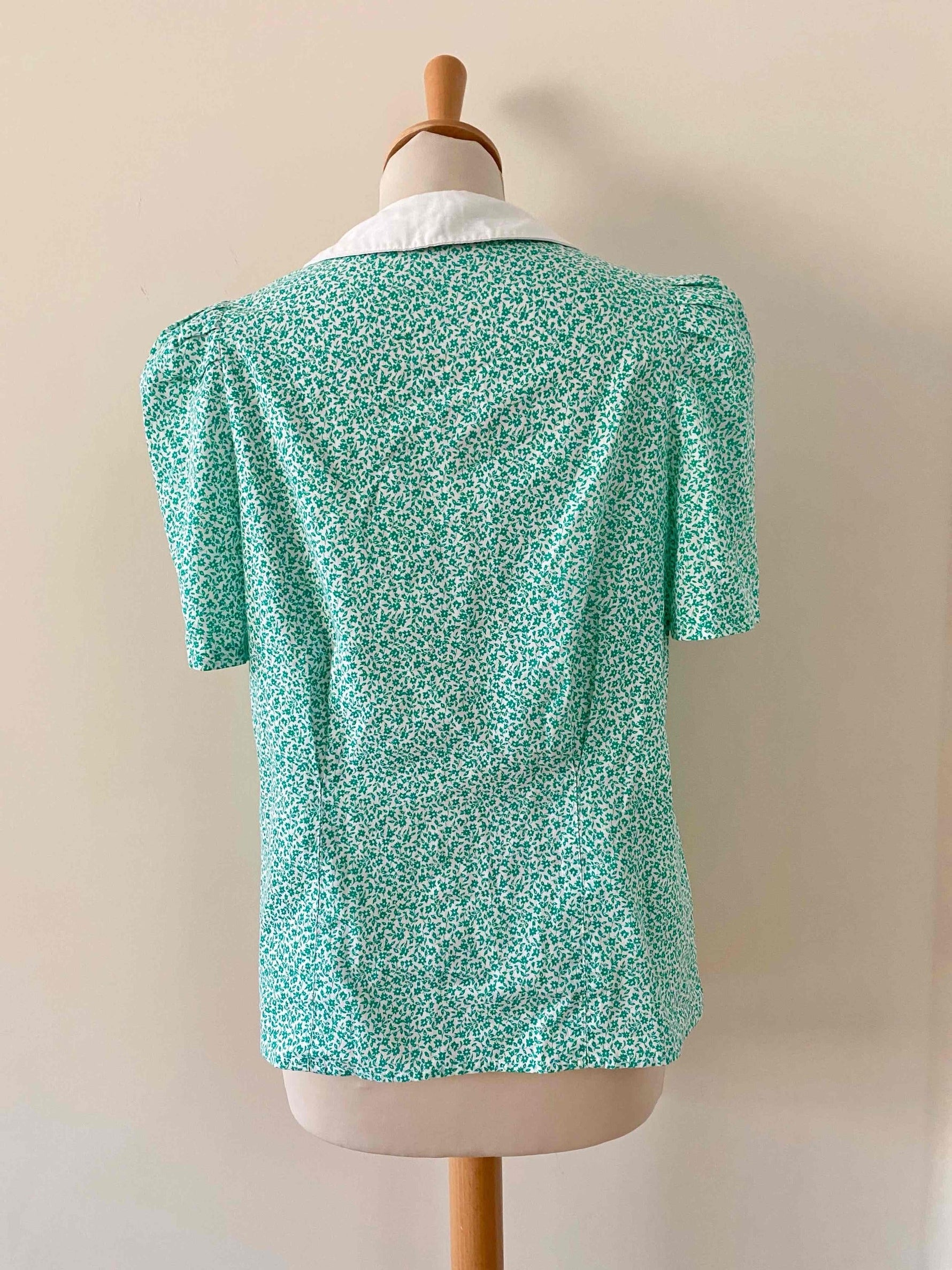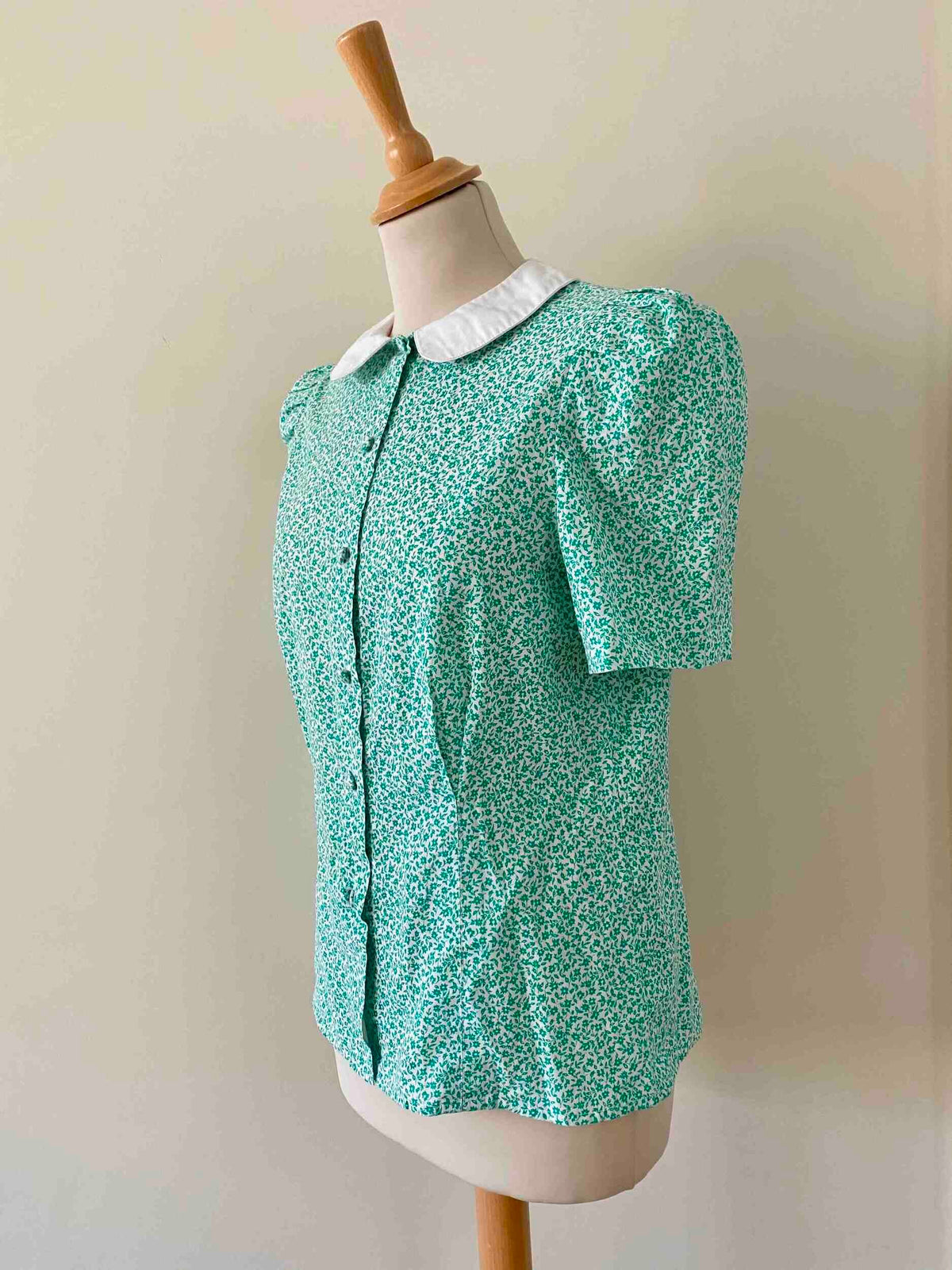 Prix unitaire parBlouse à fleurs Col Claudine contrasté blanc, imprimé mini fleurs vertes, manches ballon, en coton mélangé, fabriquée en France.