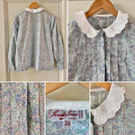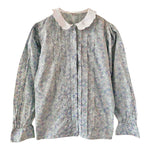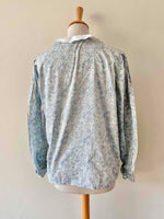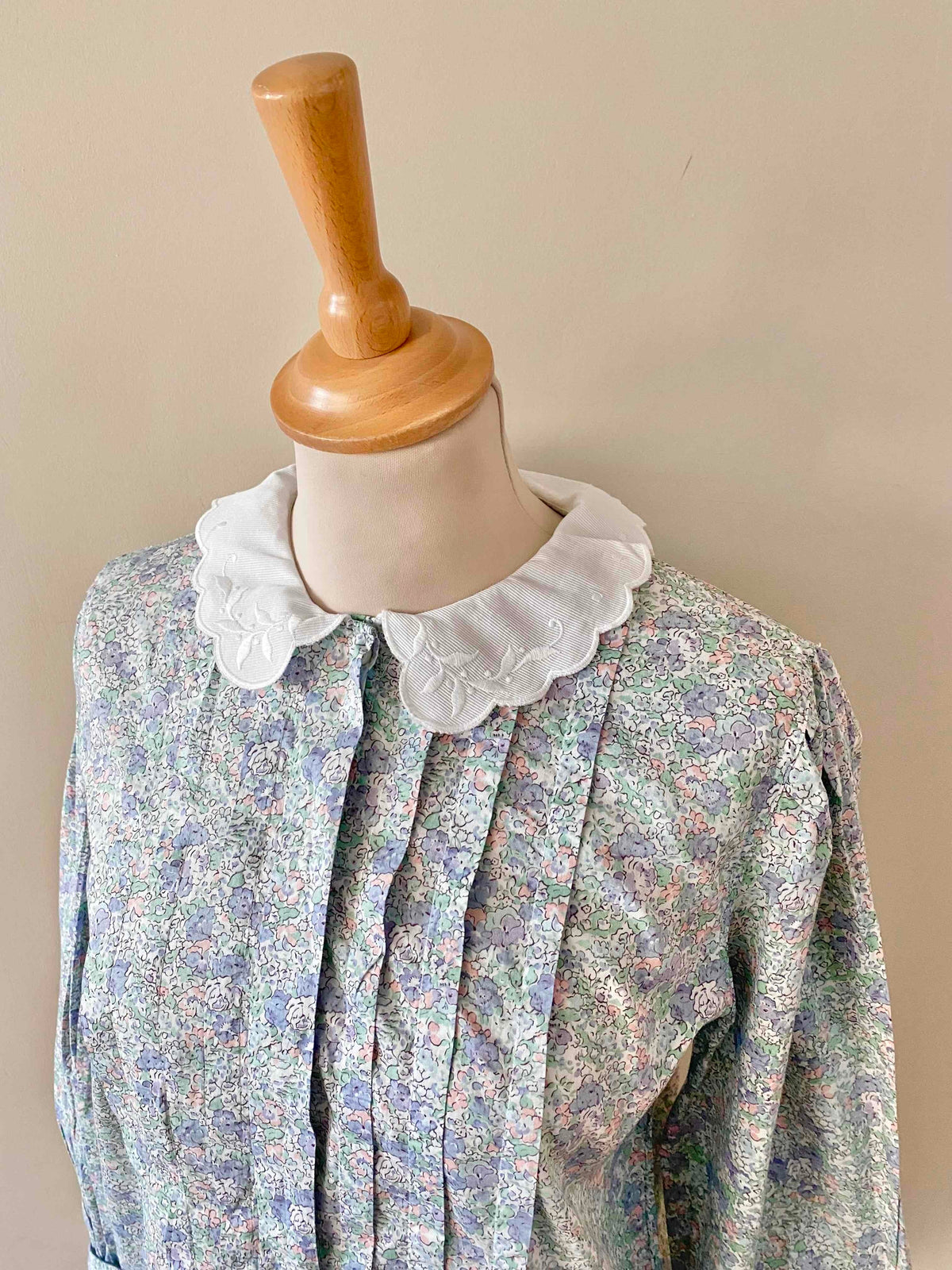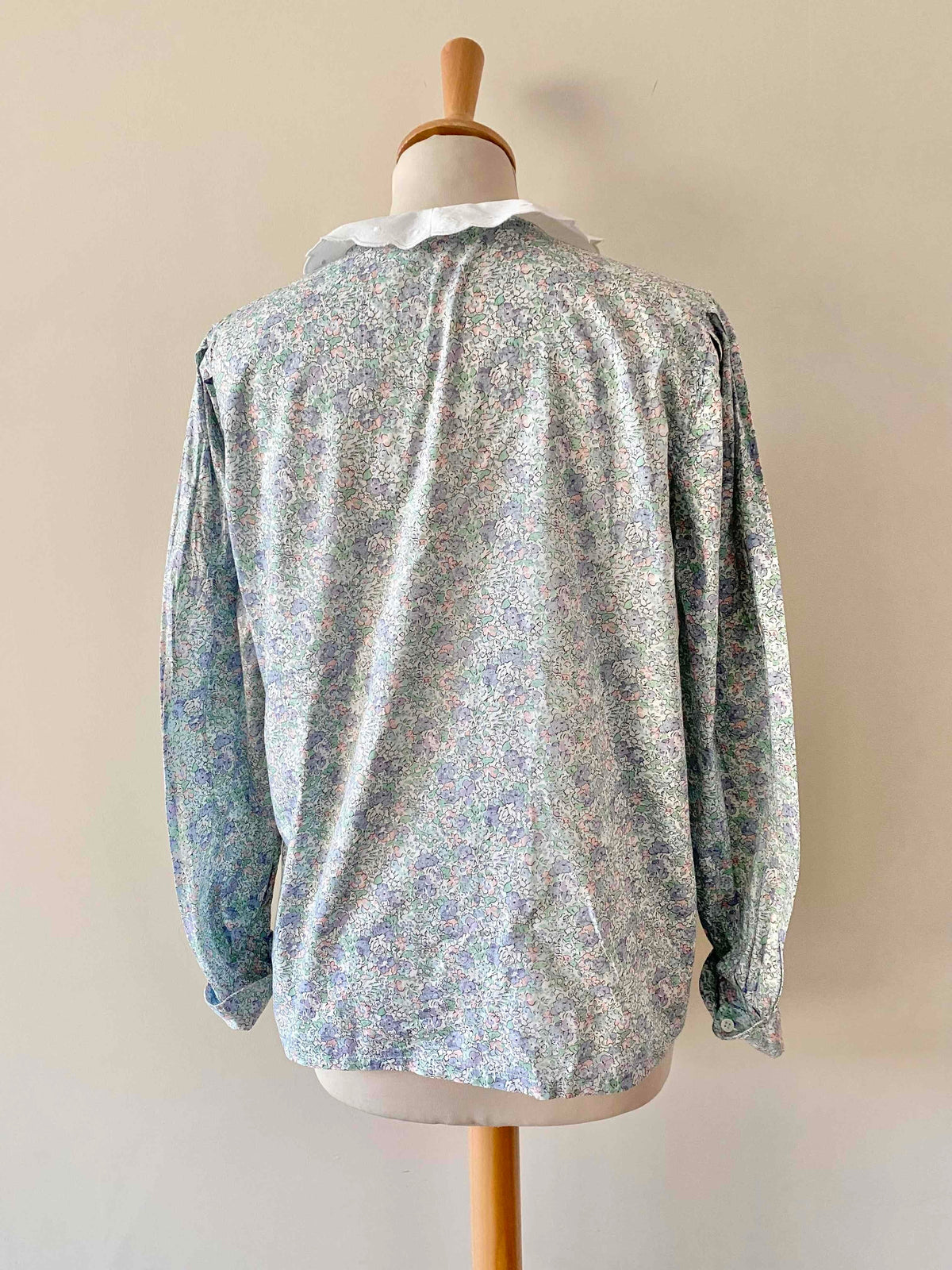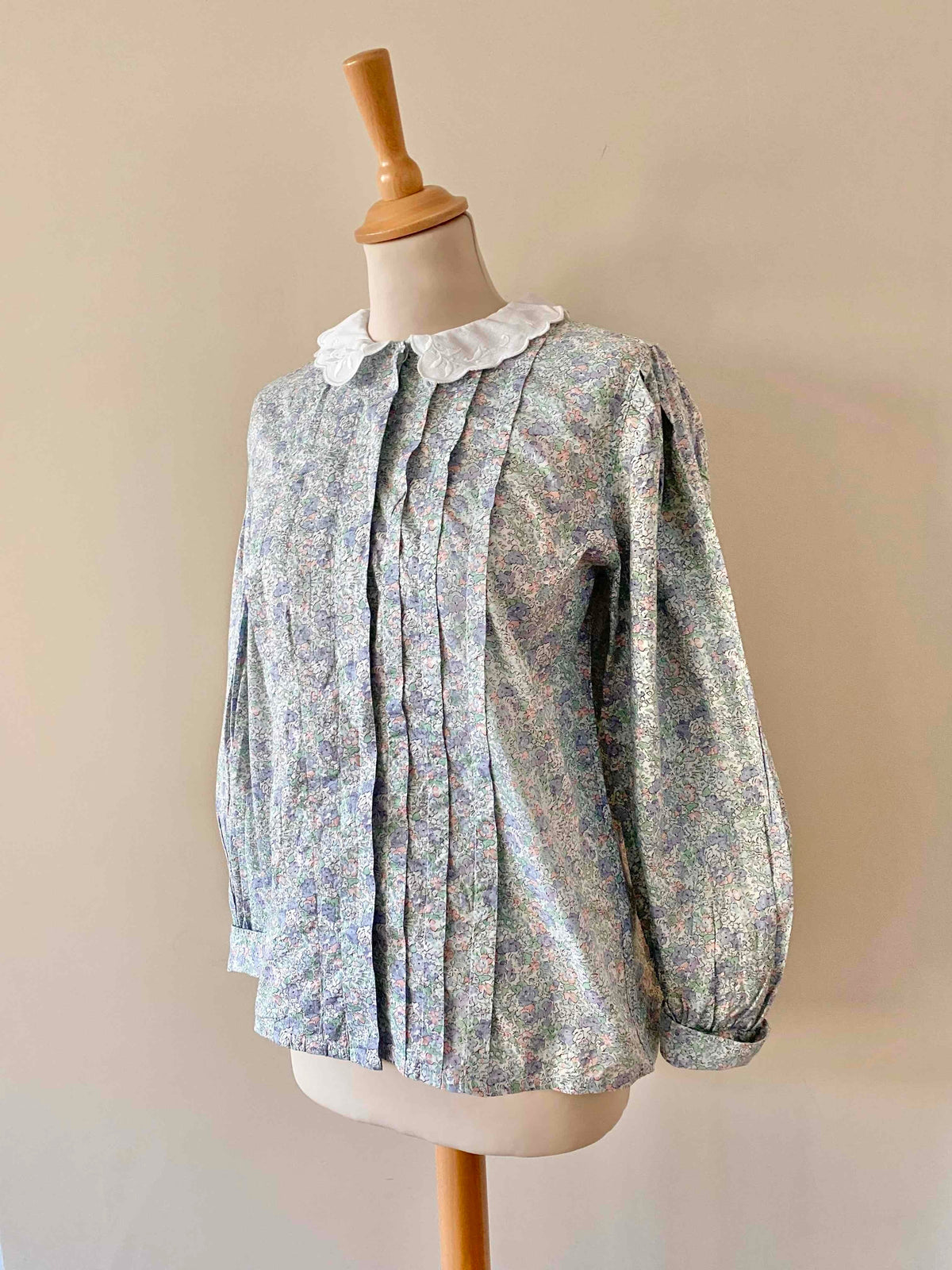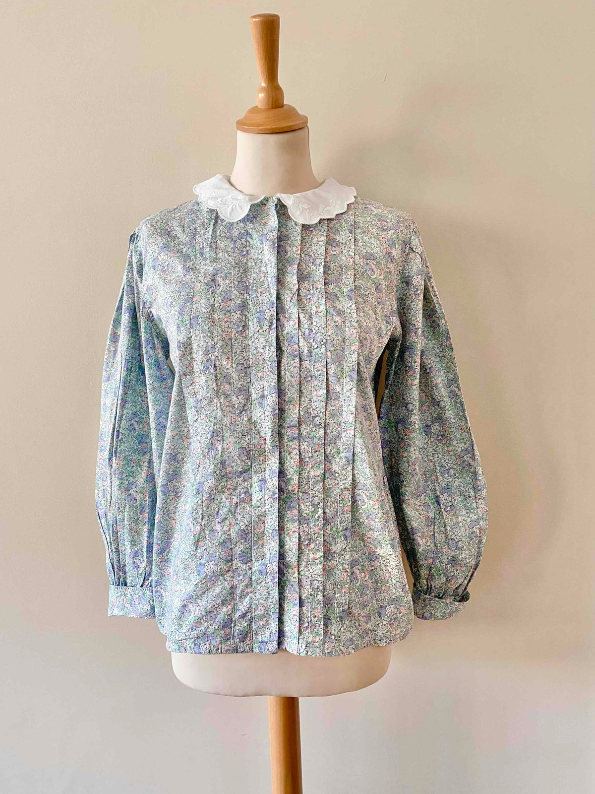 Prix unitaire parBlouse Col Brodé en coton imprimé fleurs liberty pastels, plastron plissé boutonné, manches ballons, poignets revers, Renatto Nucci, fabriqué en France, années 80’s.