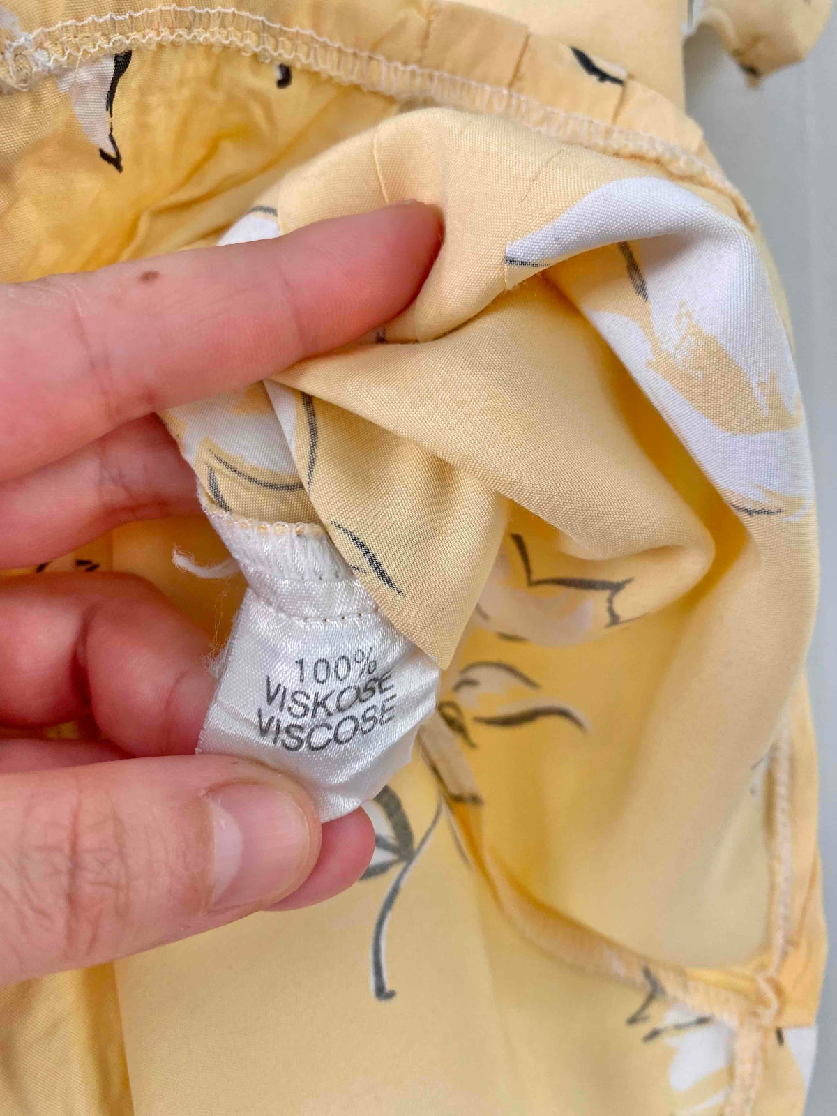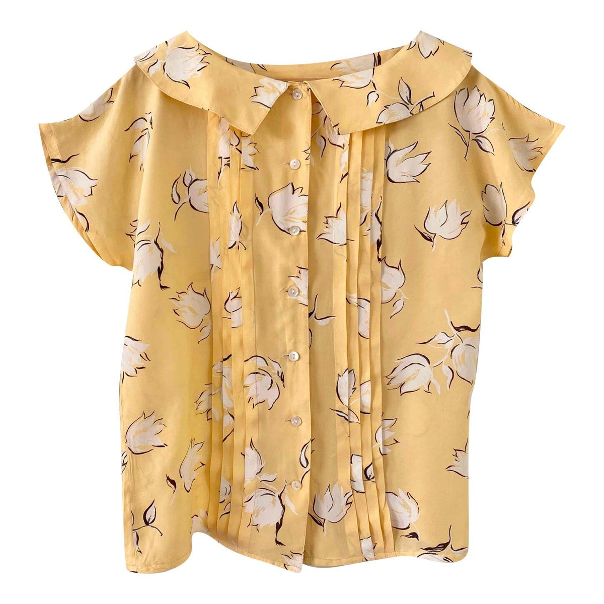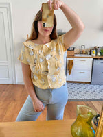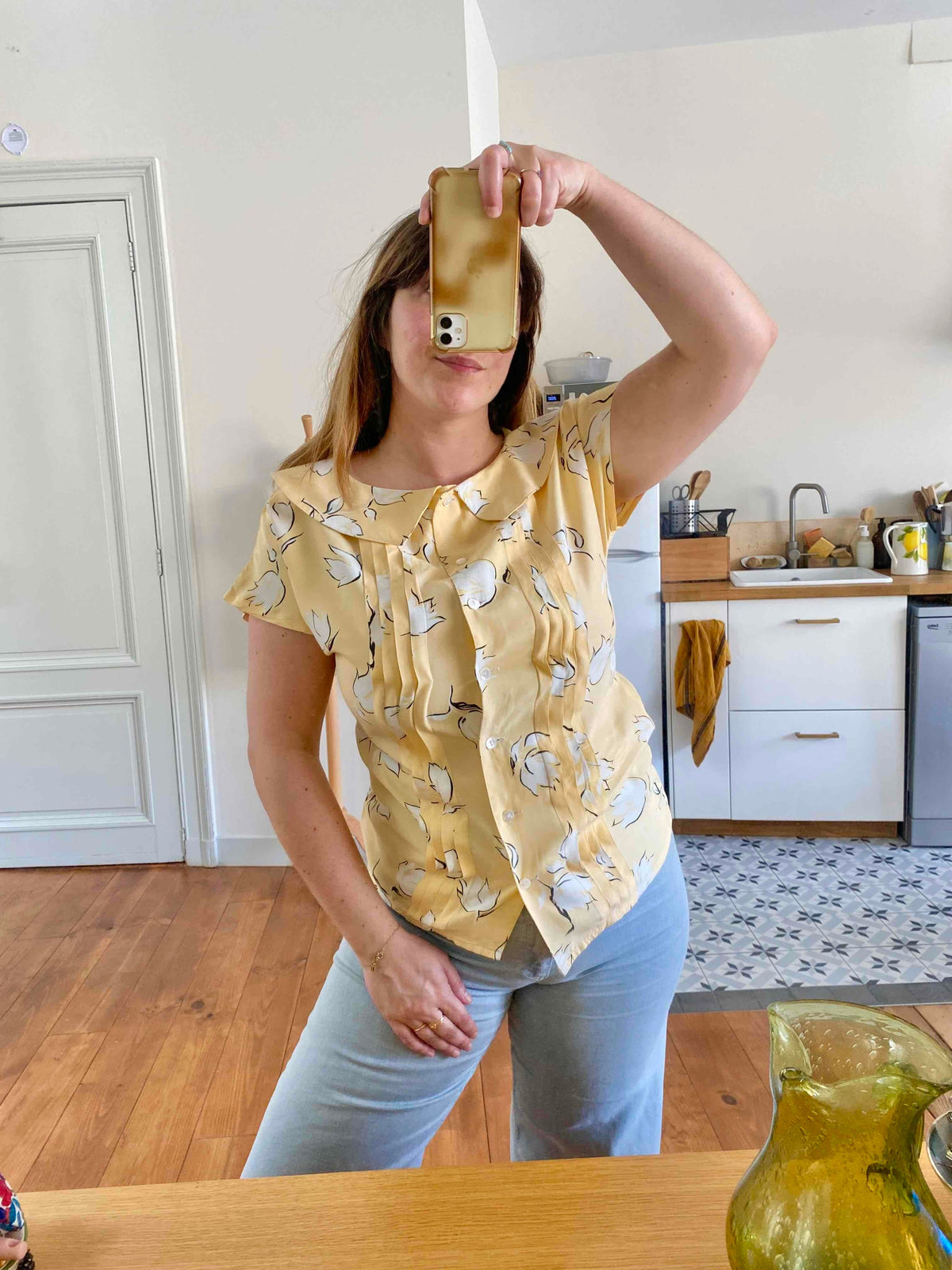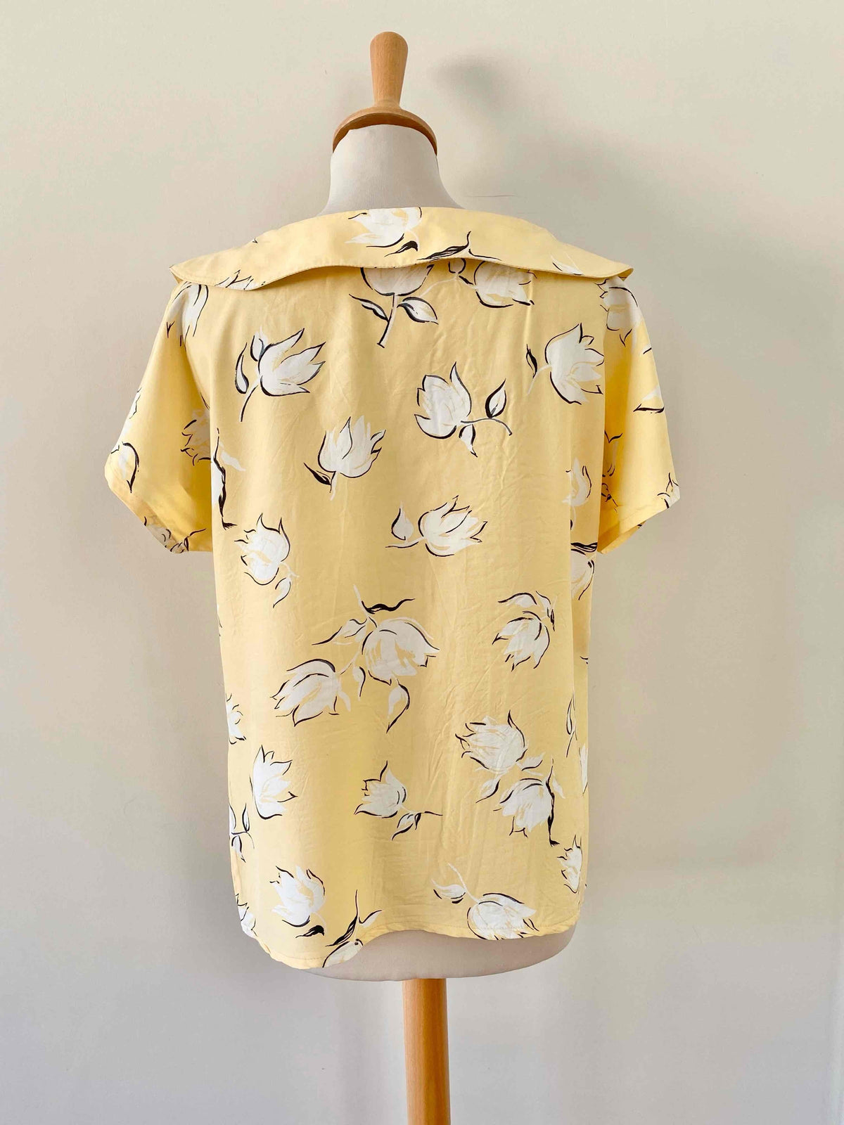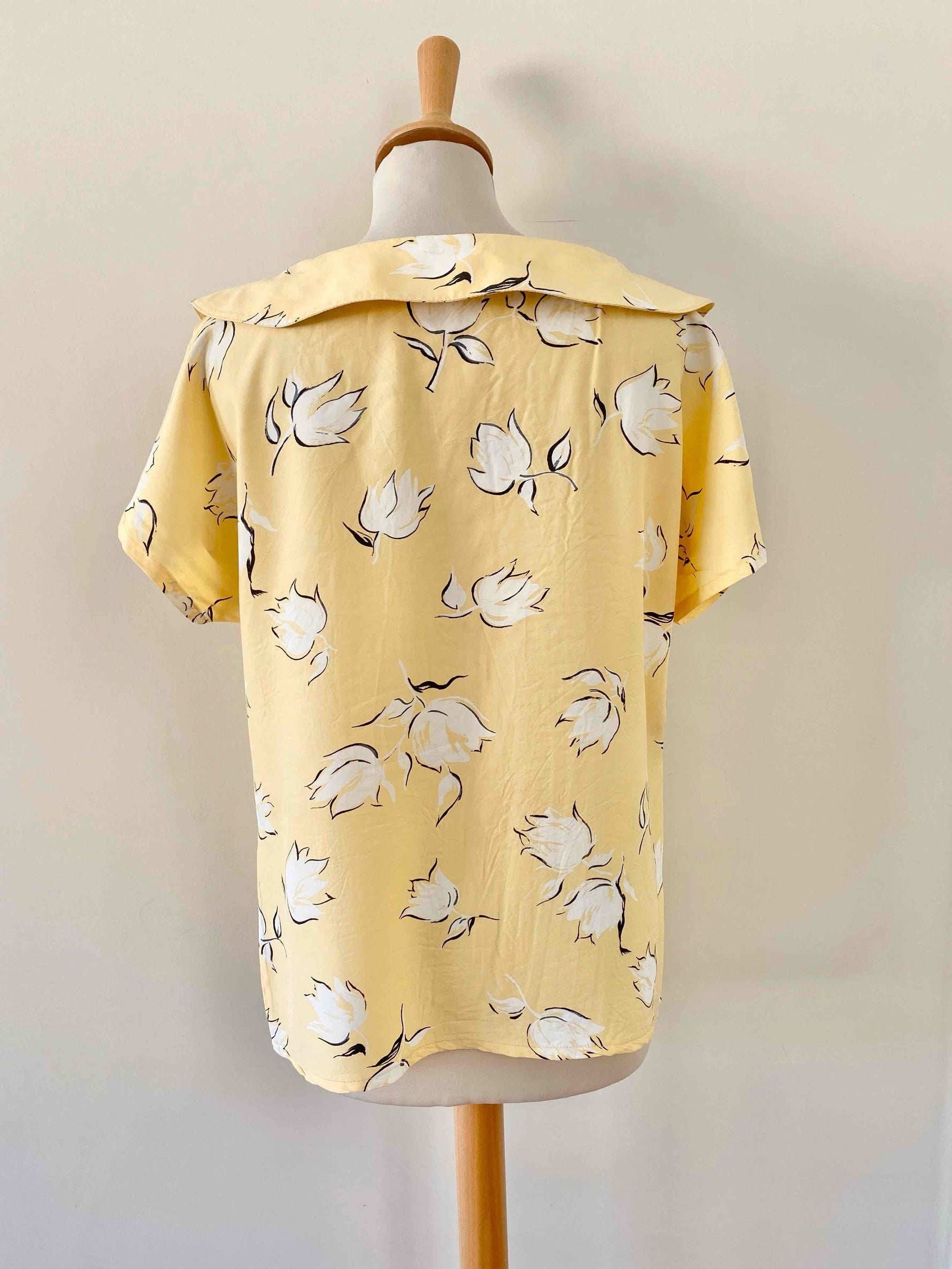 Prix unitaire parBlouse à Fleurs en viscose jaune pastel imprimé tulipes blanches, grand col claudine, devant plissé, taille 38 porté ici sur un mannequin T36 et une personne T40.