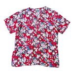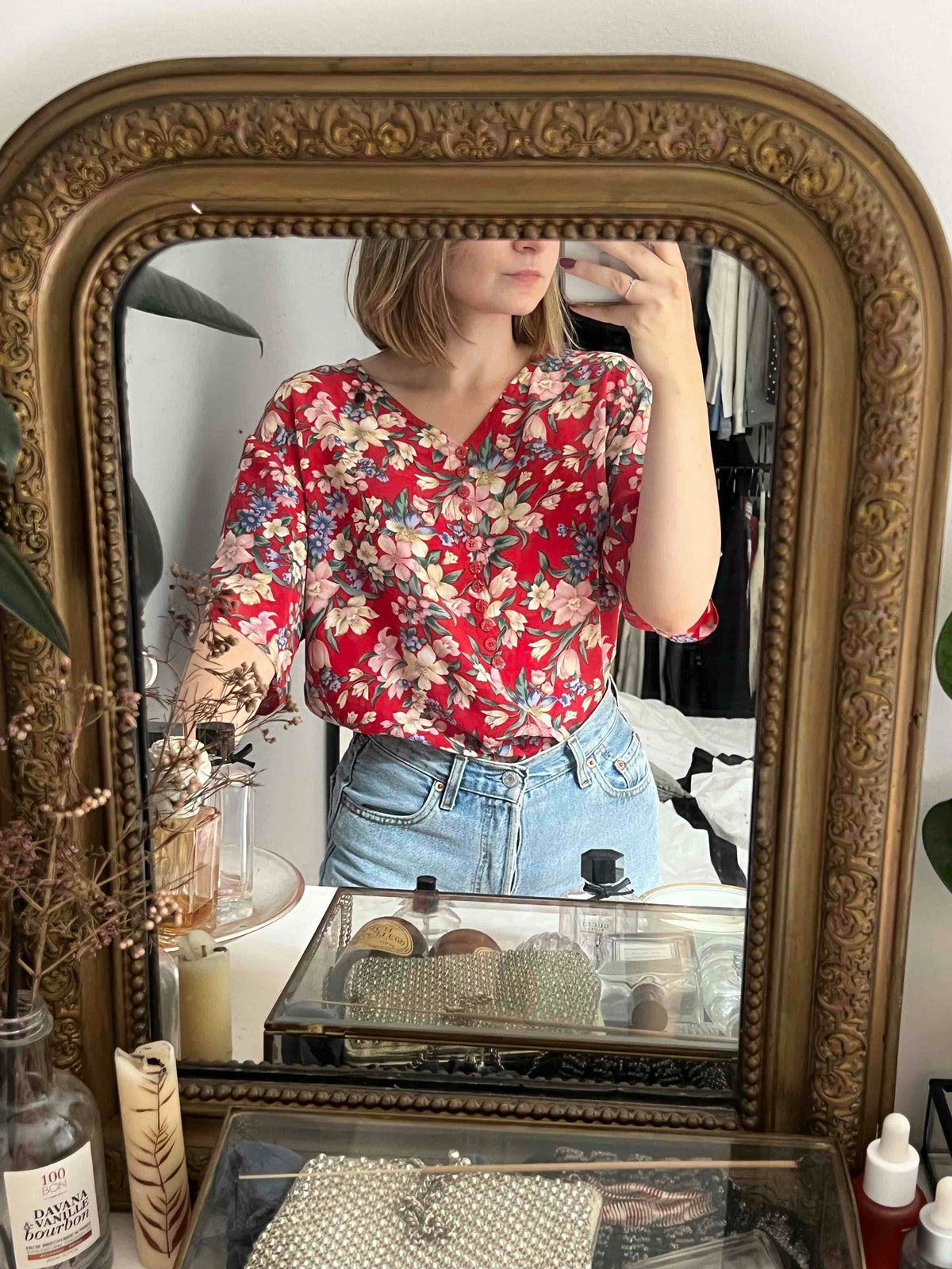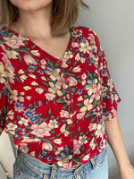 Prix unitaire parBlouse à manches courtes fluide en soie rouge à motif de fleurs. Détails de boutons travaillés au col. Taille 38/40. Années 90s. Excellent état.