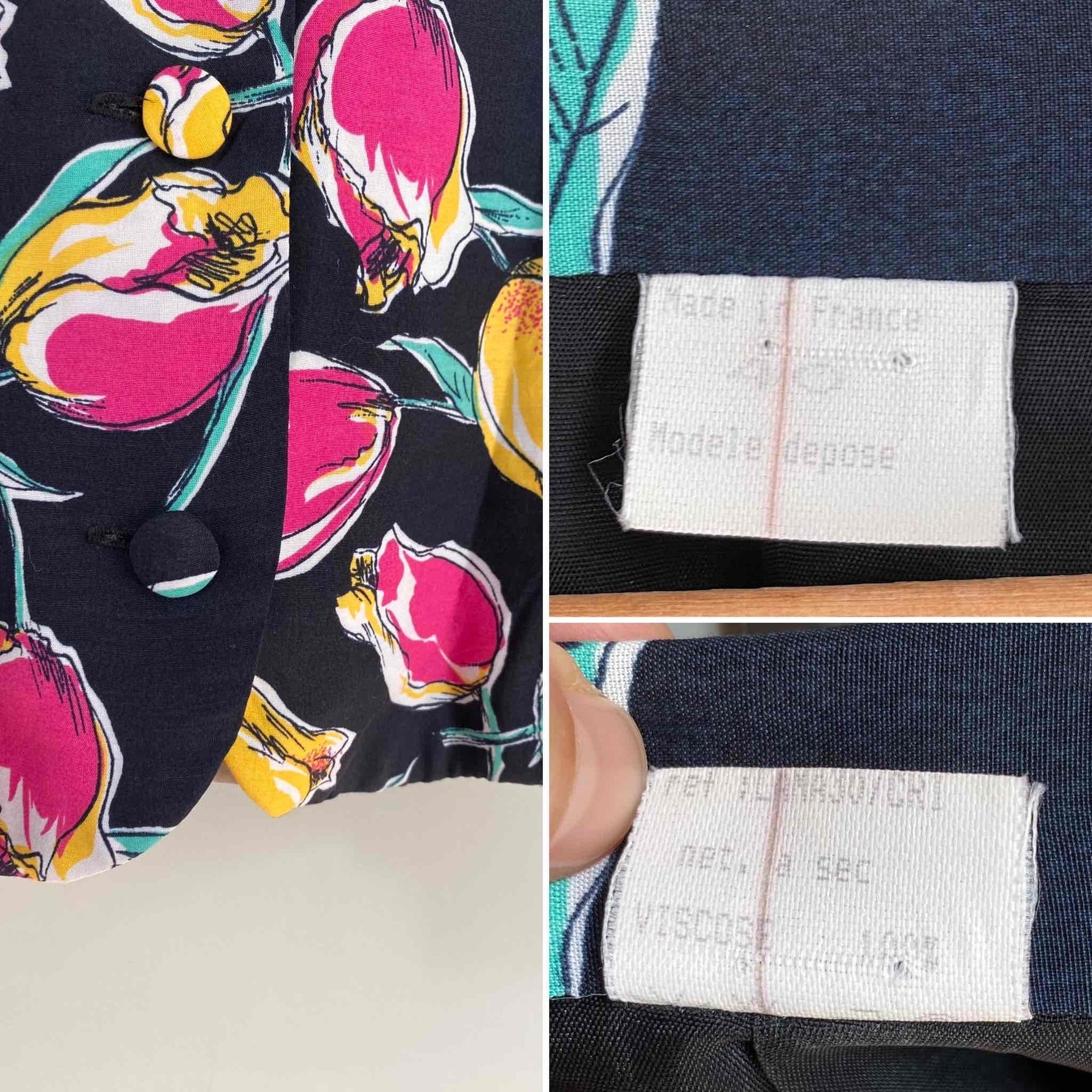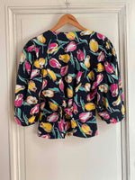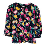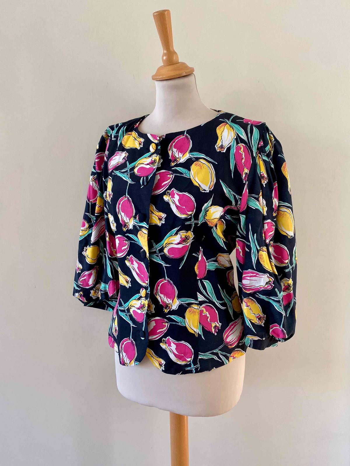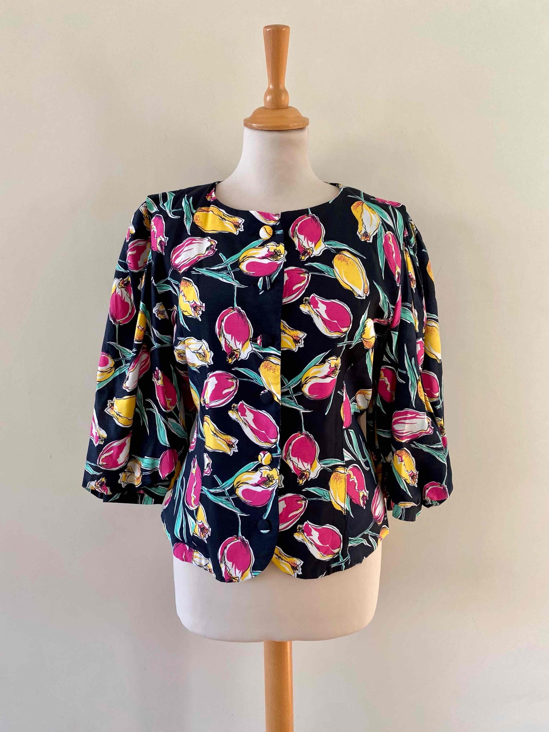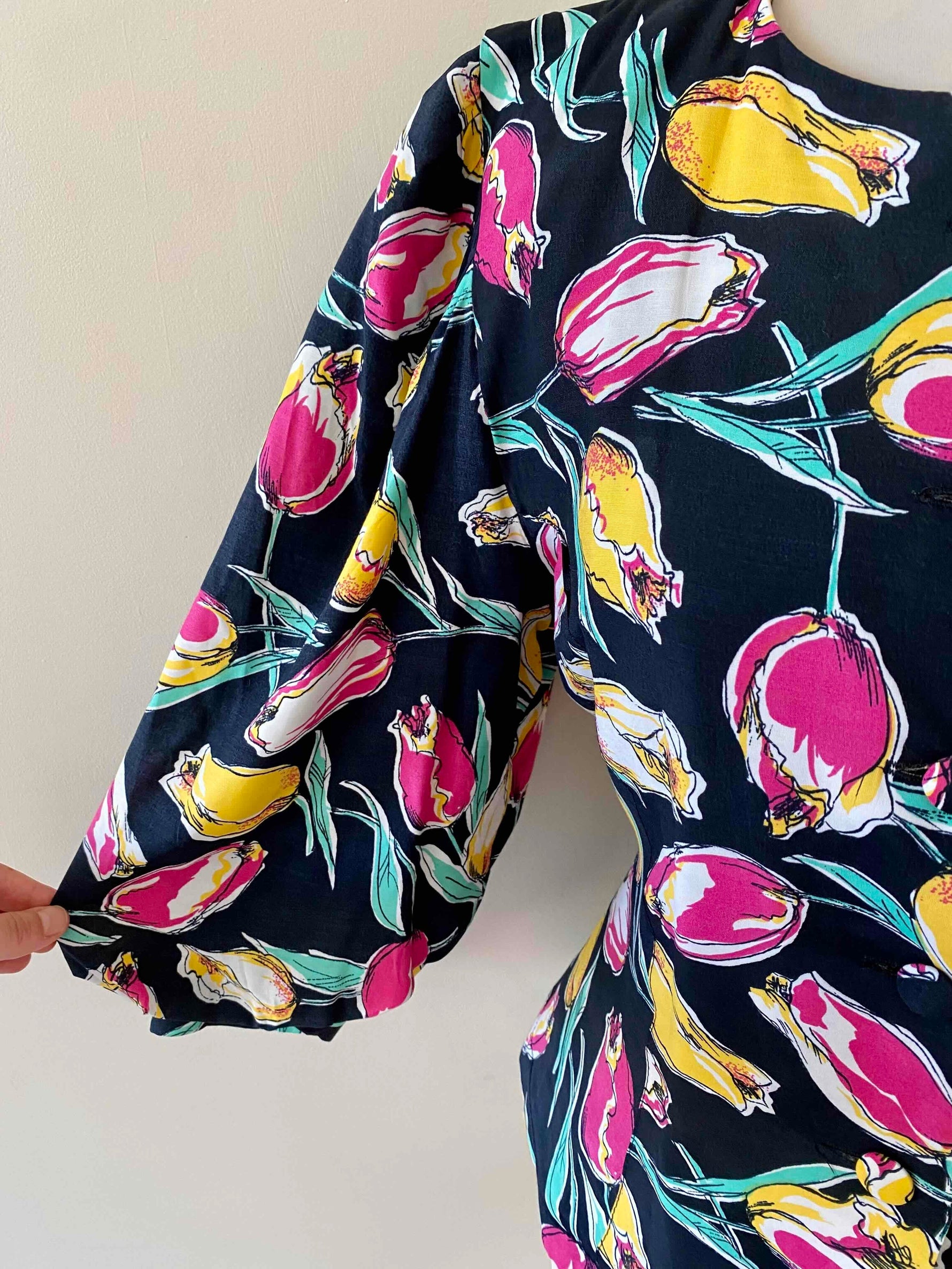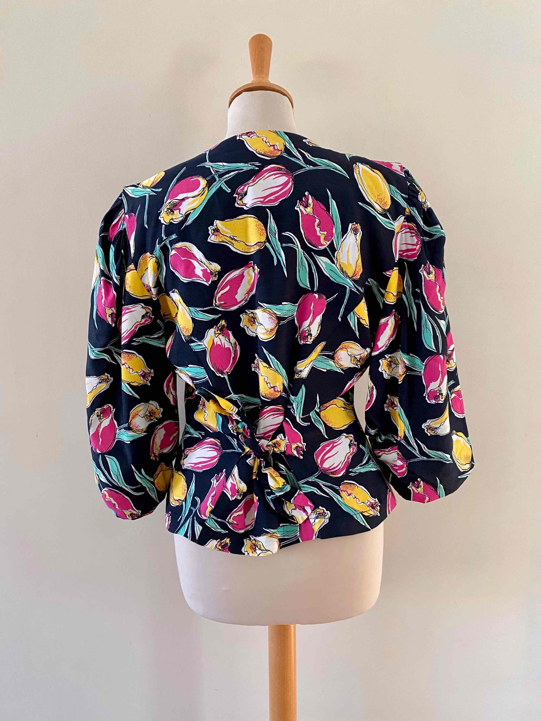 Blouse à fleurs en viscose noire imprimée tulipes roses fuschias, jaunes et vert menthe, manches ballons 3/4, boutons recouverts, taille dos à nouer, fabriquée en France, superbe coupe corsage, taille 36 et 38 portée ici sur un mannequin T36.