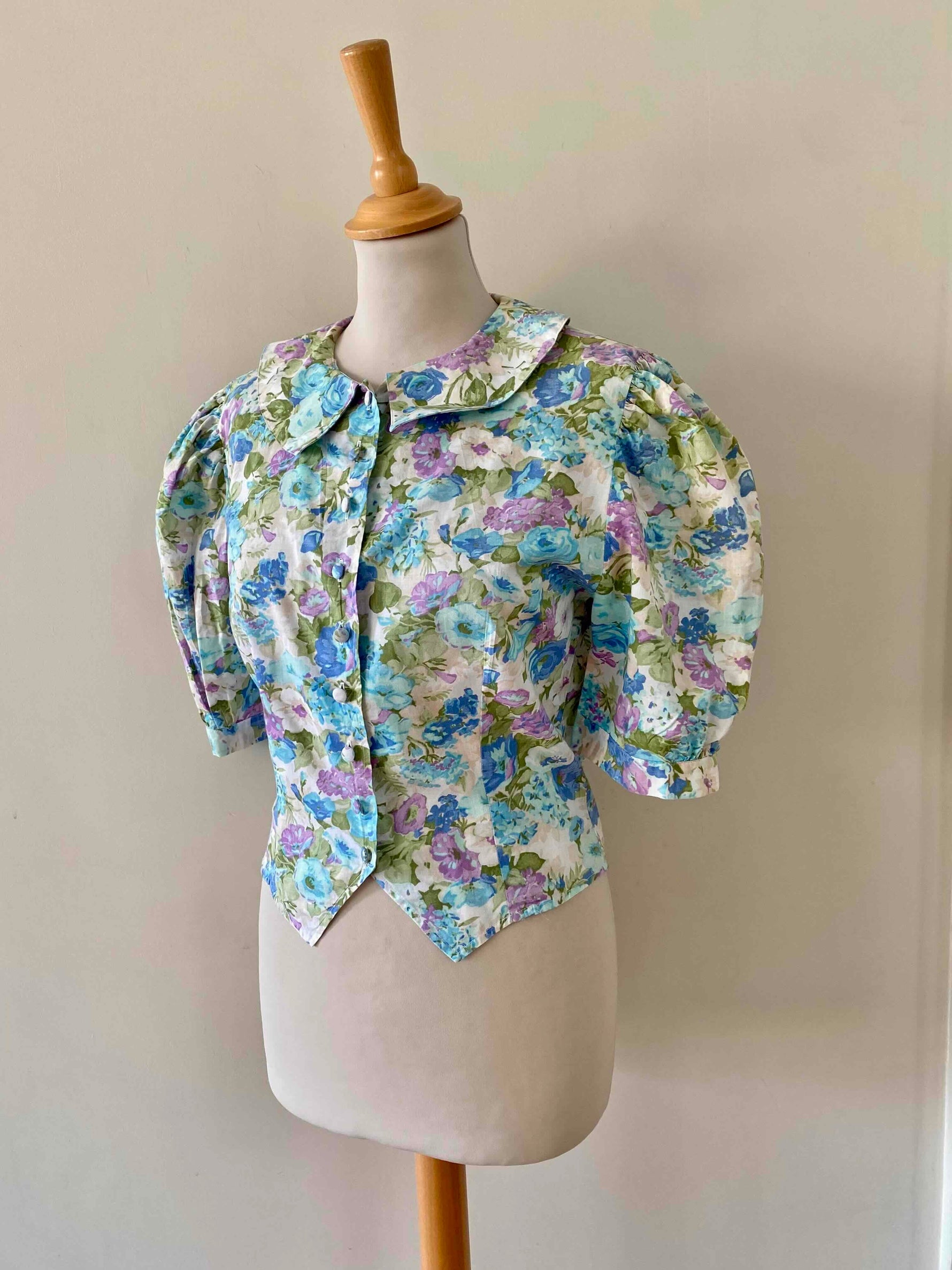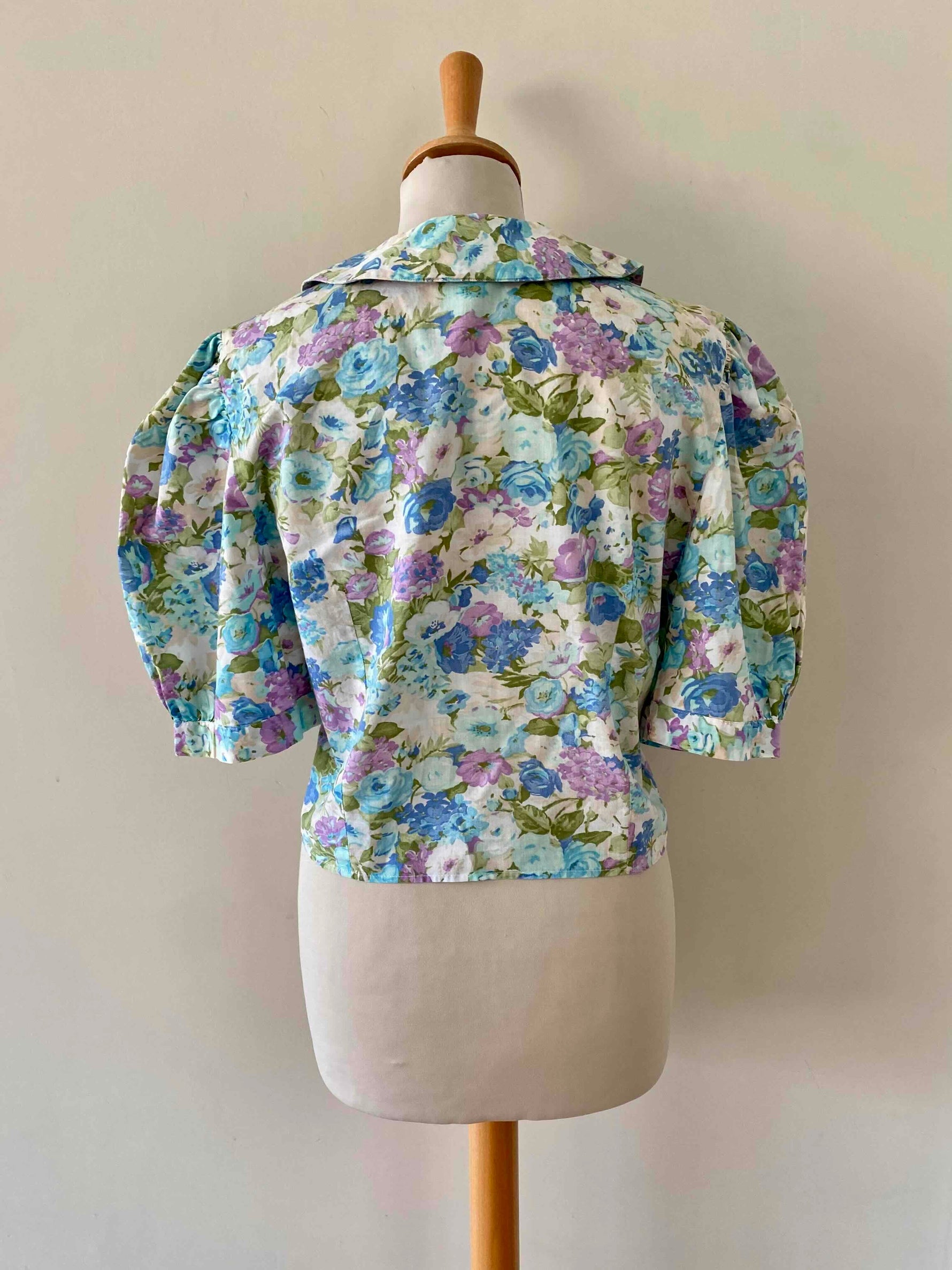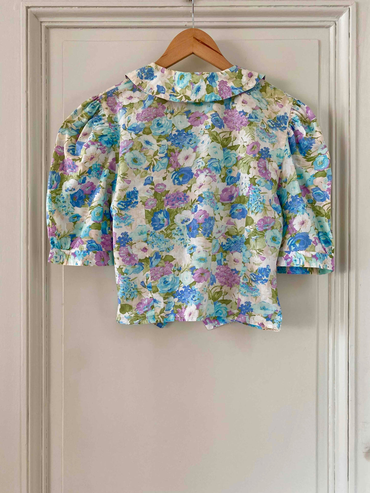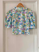 Blouse cropped à fleurs, en 100% coton blanc imprimée fleurs bleues ciel, vertes et lilas, col claudine, manches ballons coudes, taille ceintrée esprit corsage, fabriquée en France, taille 34 et 36 portée ici sur un mannequin T36.