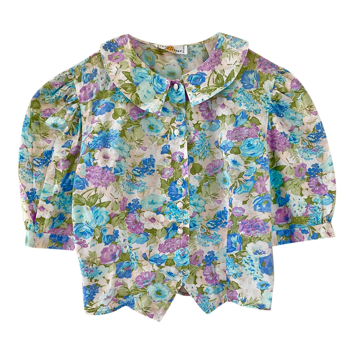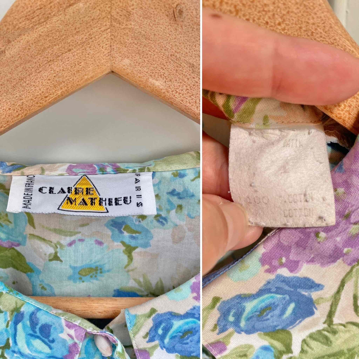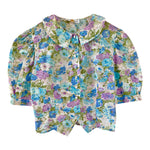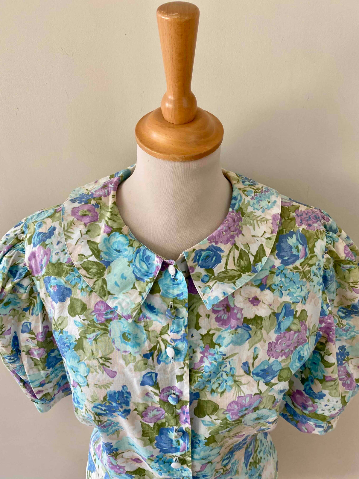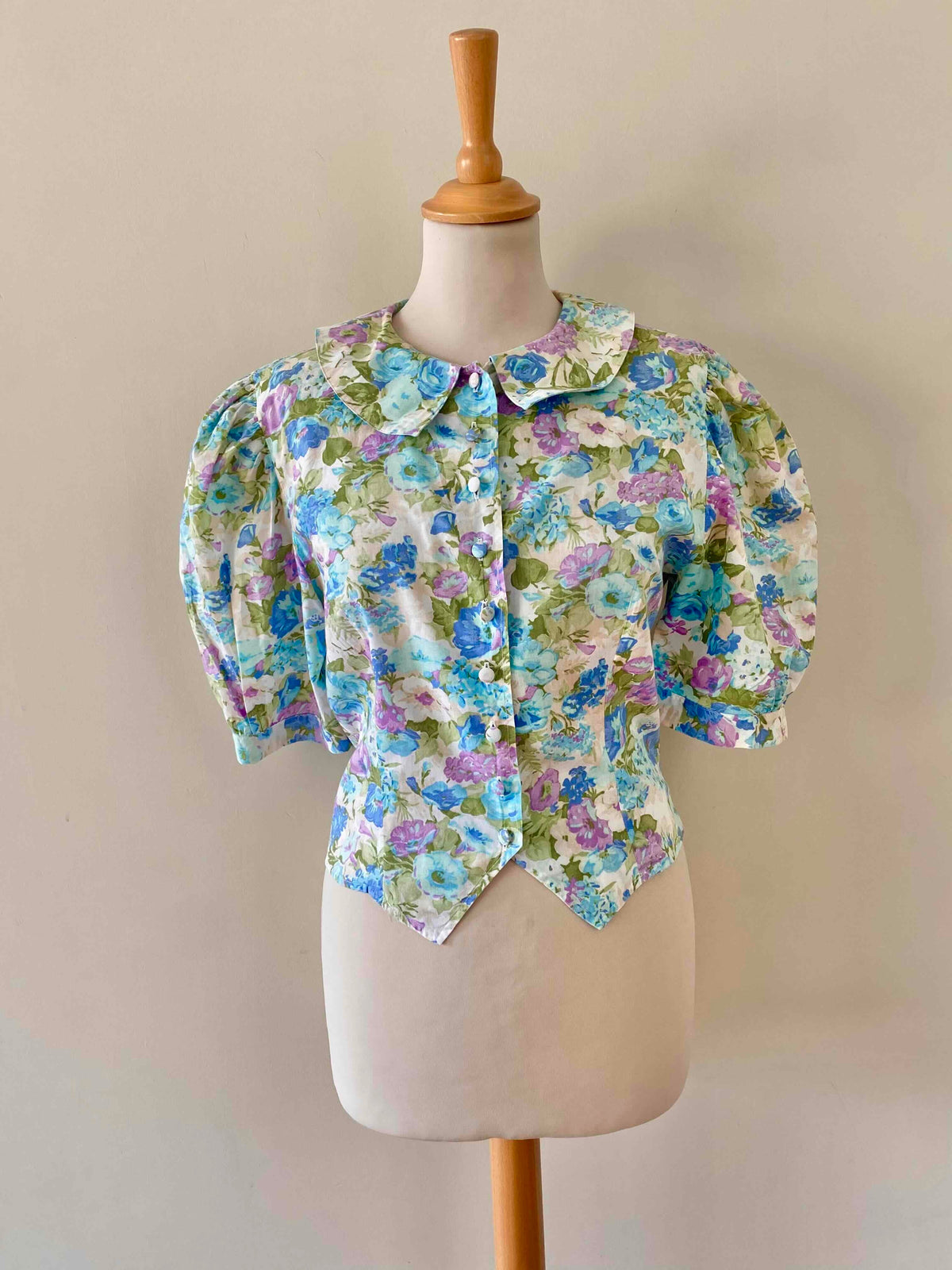 Blouse cropped à fleurs, en 100% coton blanc imprimée fleurs bleues ciel, vertes et lilas, col claudine, manches ballons coudes, taille ceintrée esprit corsage, fabriquée en France, taille 34 et 36 portée ici sur un mannequin T36.