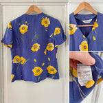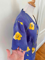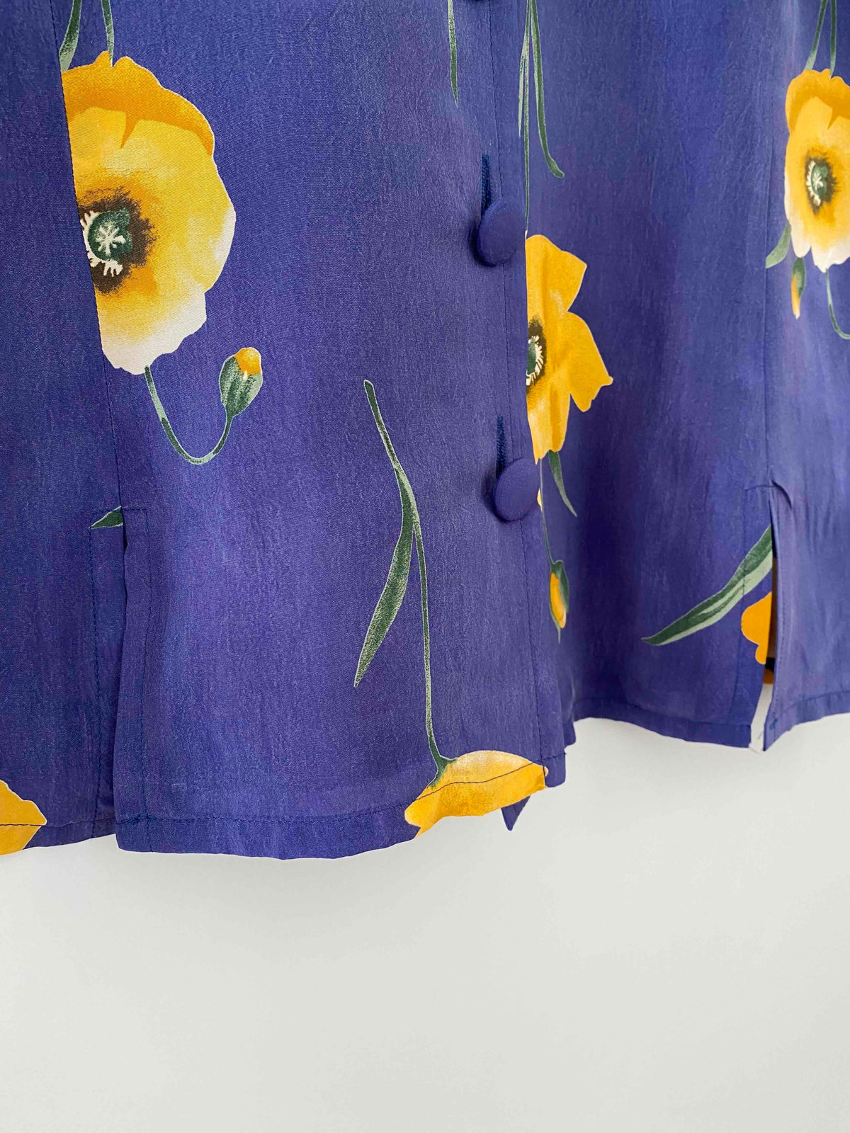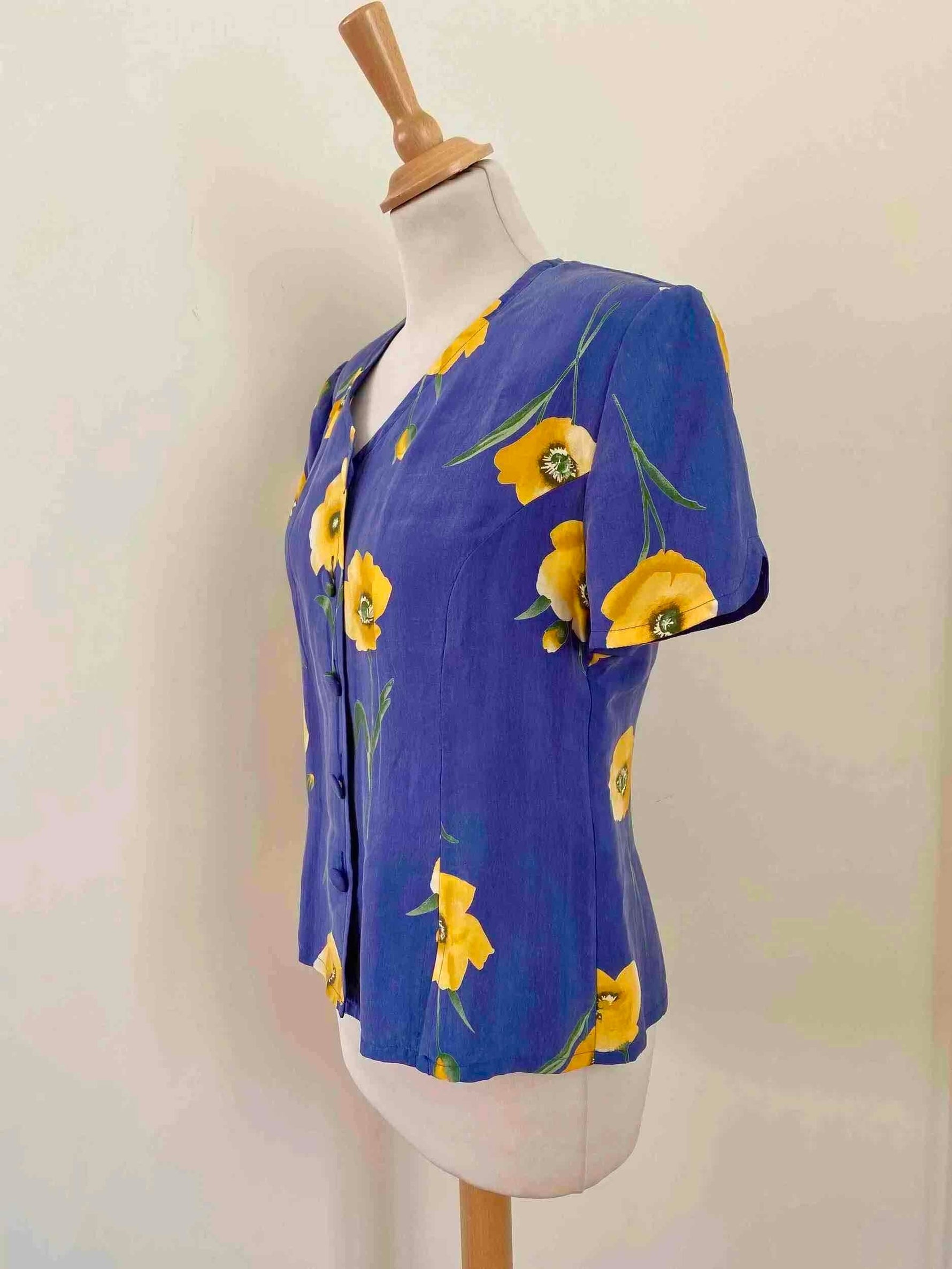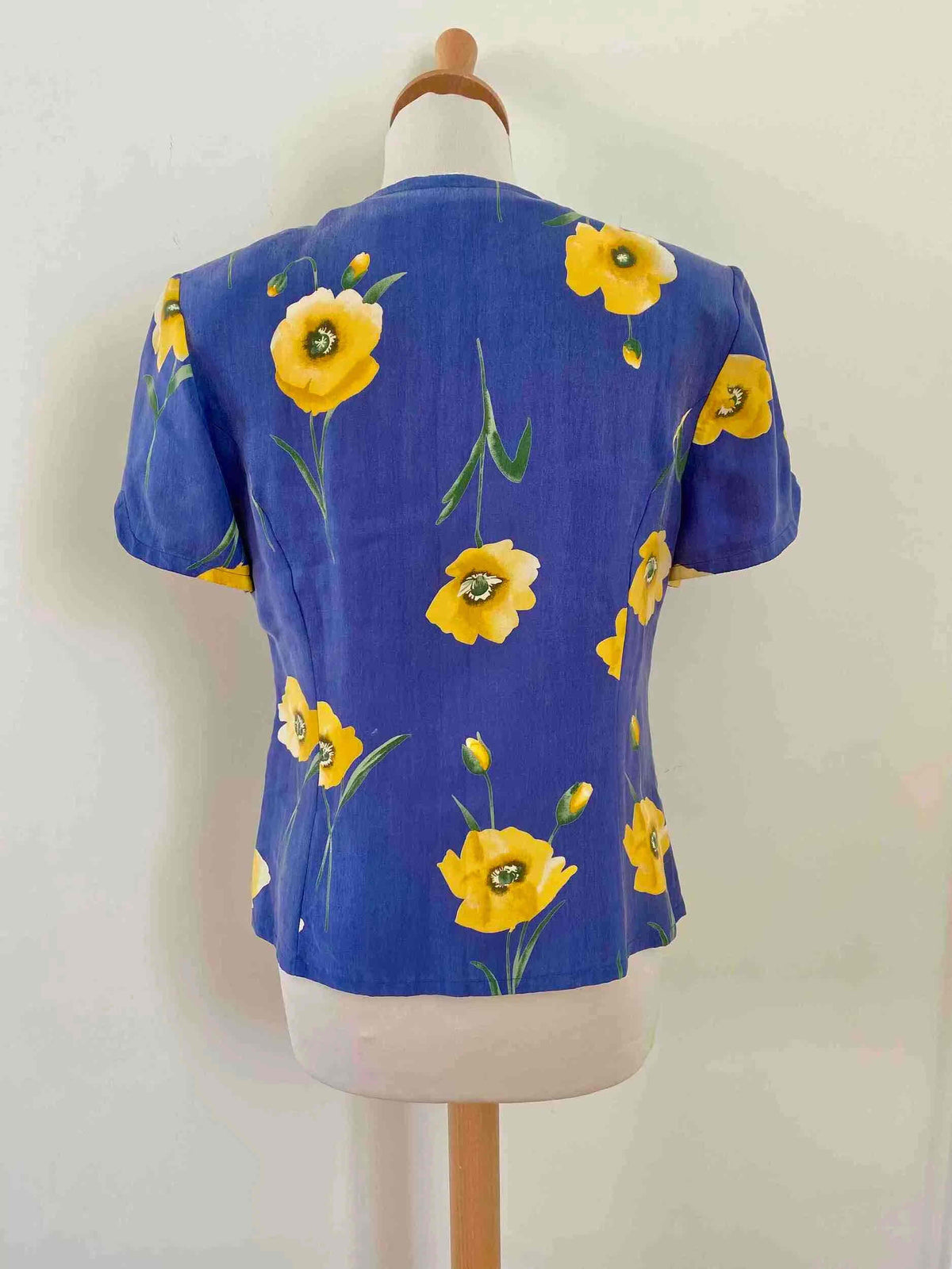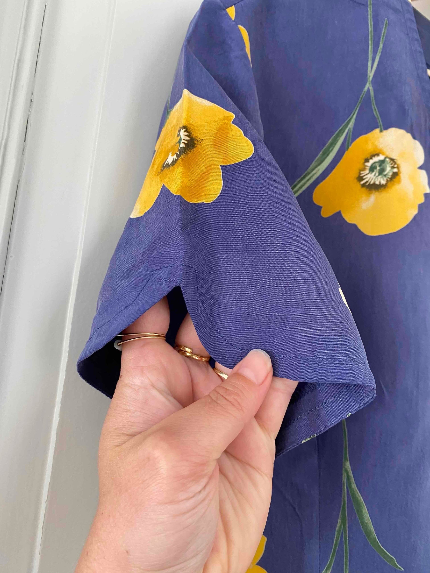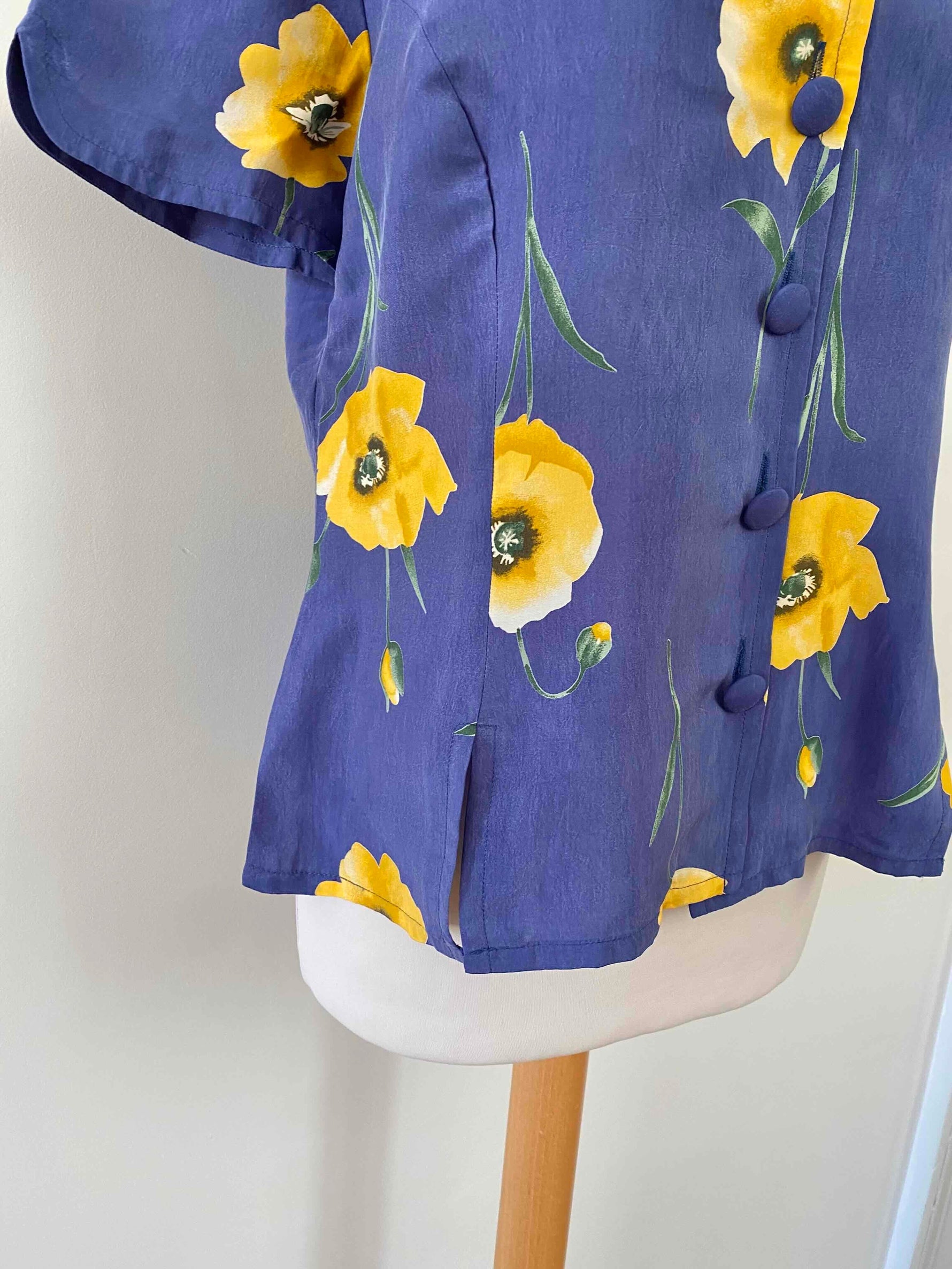 Prix unitaire parBlouse à fleurs en cupro satin peau de pêche soyeux bleu, imprimé fleurs de coquelicots jaunes, boutons recouverts, taille ceintrée, petites fentes en bas et aux manches, fabriquée en France, taille 38 porté ici sur un mannequin T36.