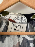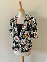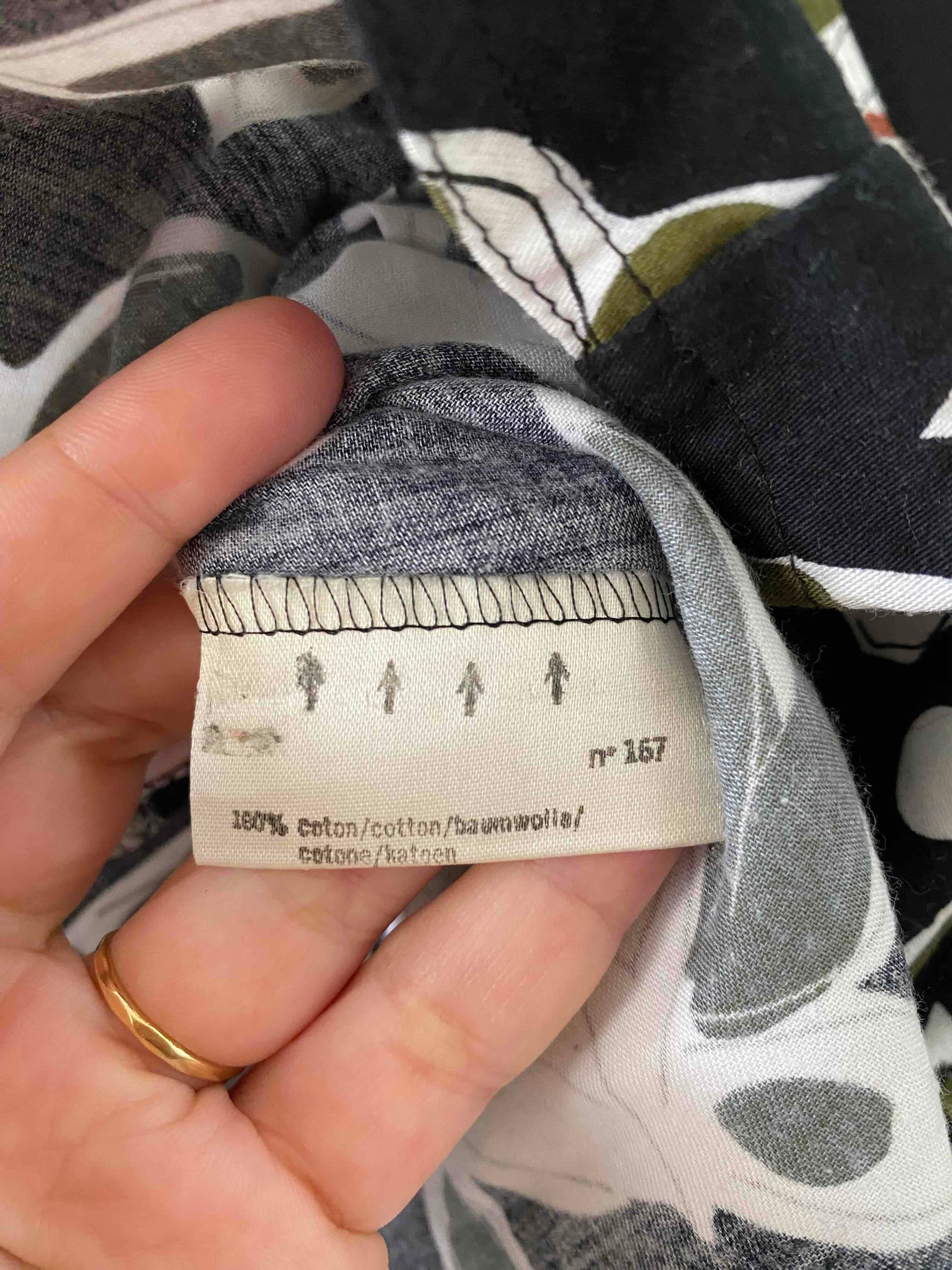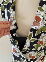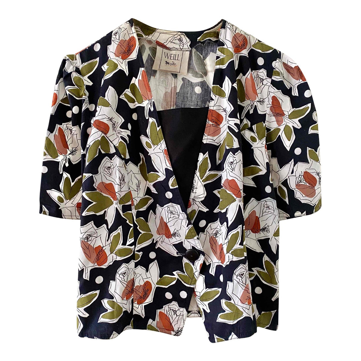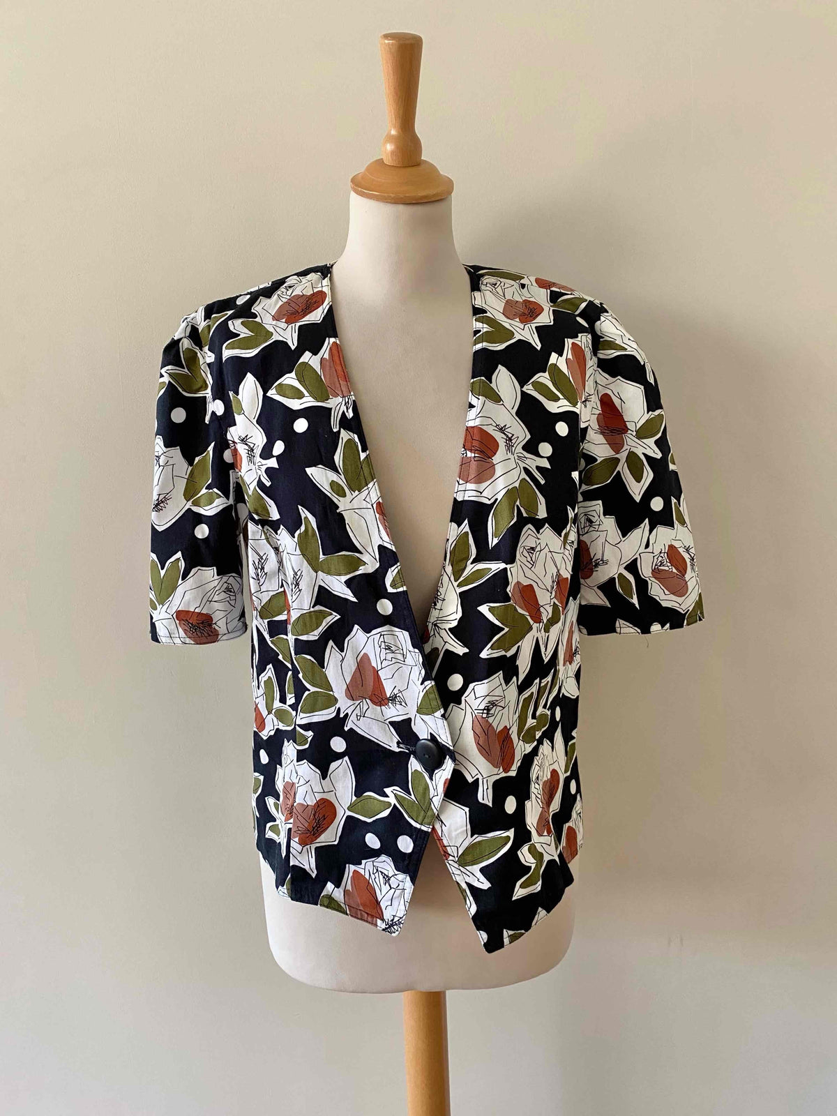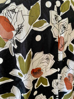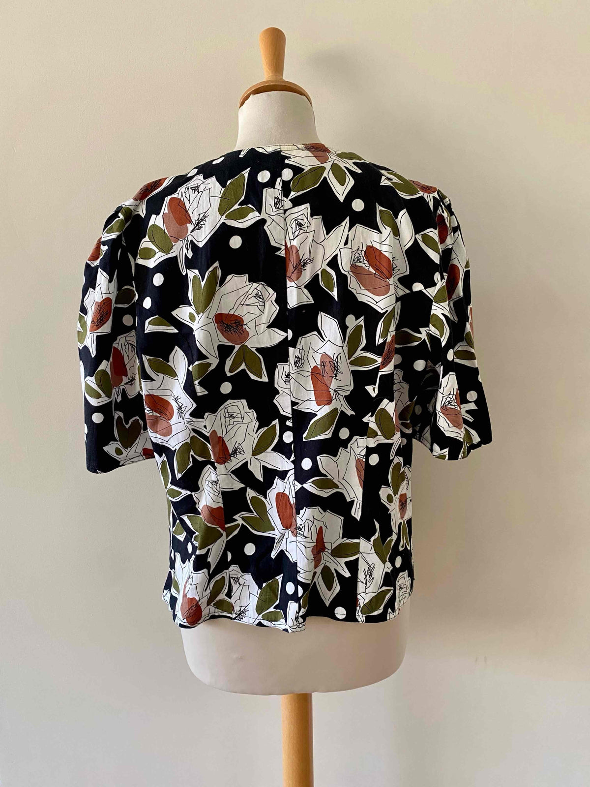Blouse à fleurs Weill, en coton satinée fluide, noir imprimé pois et roses abstraites vert olive, terracotta et bois de rose, empiecement modestie devant noir amovible par boutons, fabriquée en France, taille 38 portée ici sur un mannequin T36.