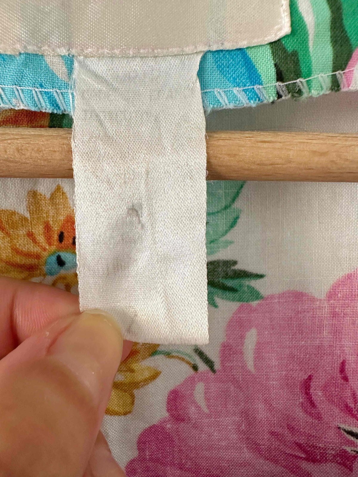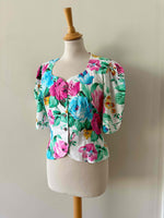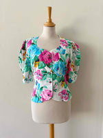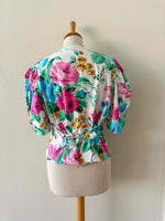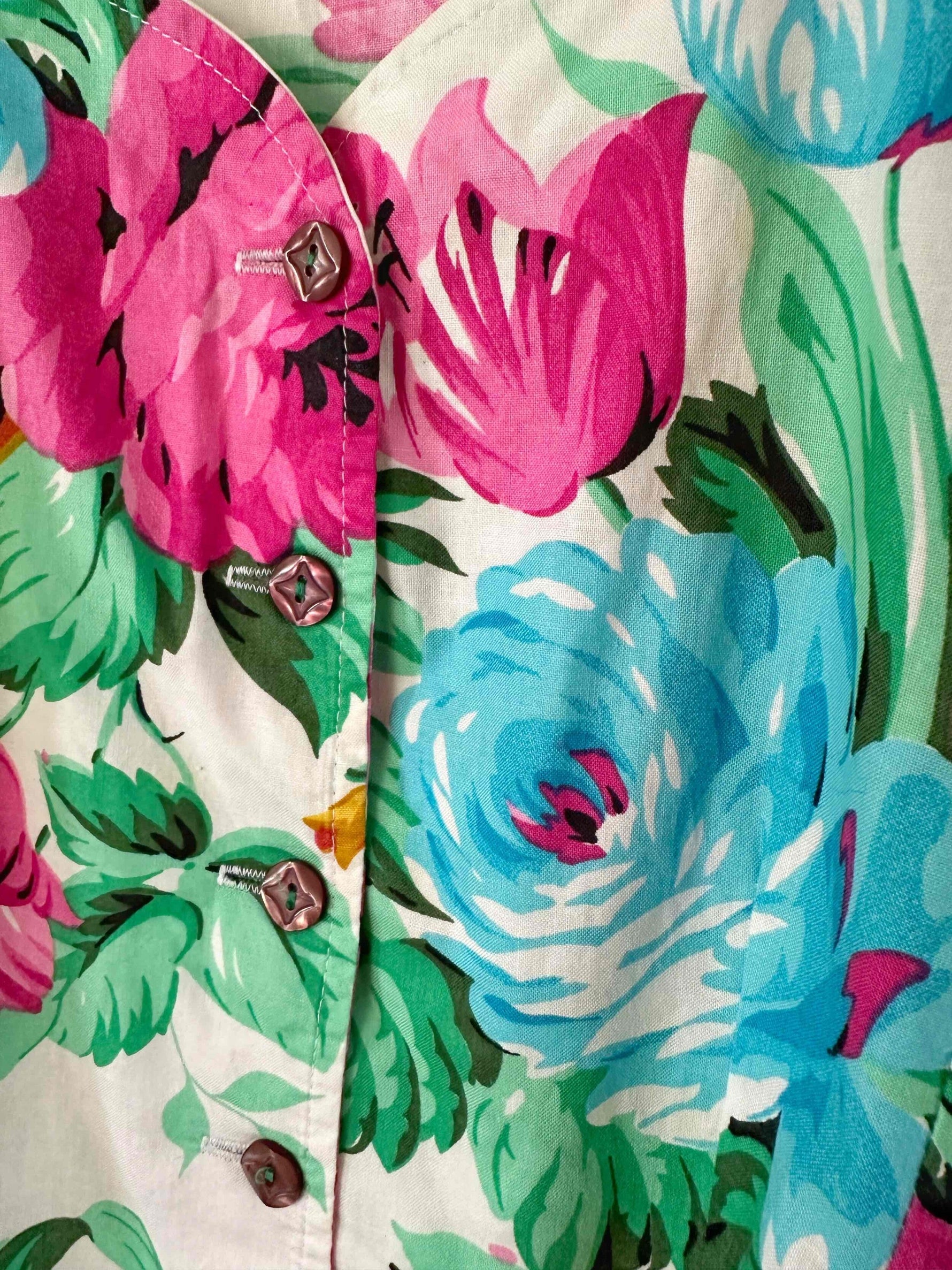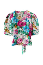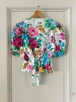 Prix unitaire parBlouse à fleurs, en coton blanc imprimée grandes fleurs multicolores roses fuchsia, bleues, vertes et ocres.