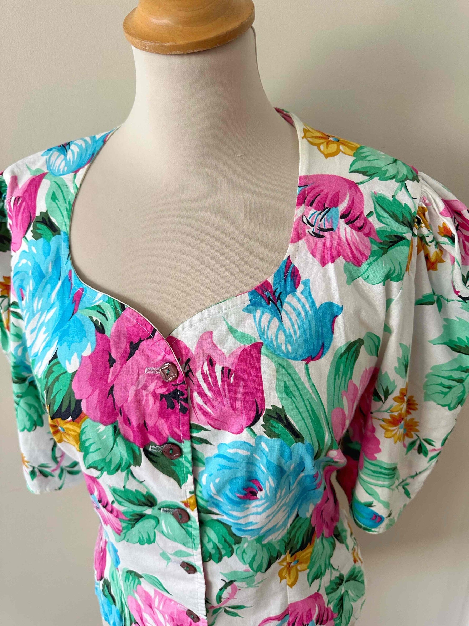Manches ballons gigots, boutonnée, taille dos à nouer, fabriquée en France, taille 36 portée ici sur un mannequin T36.