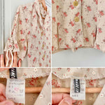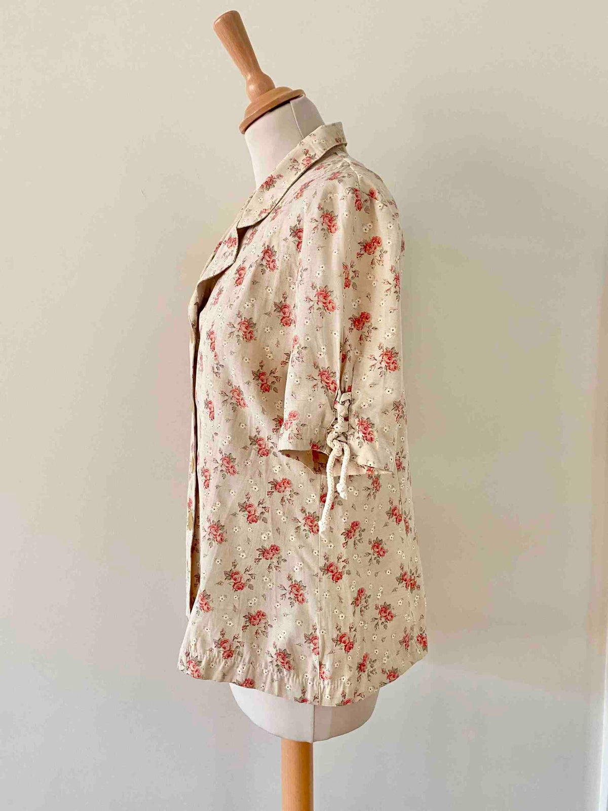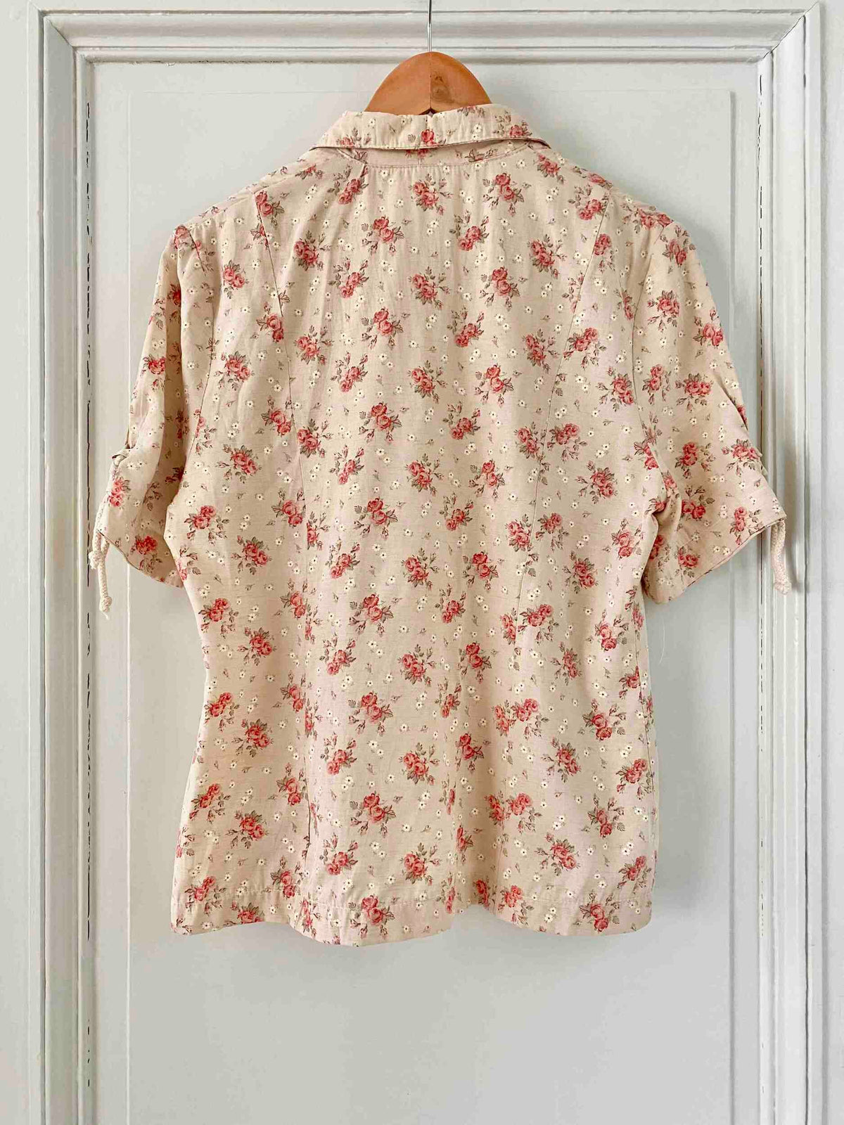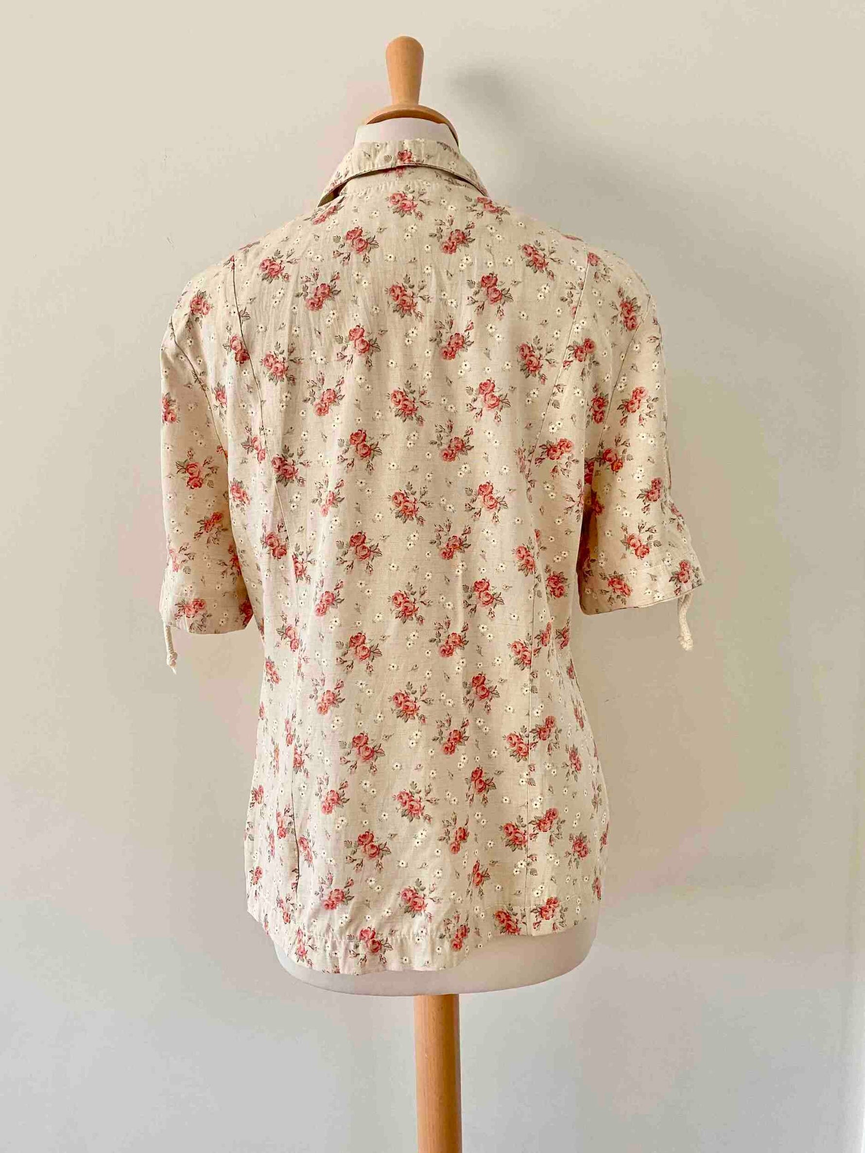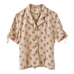 Prix unitaire parBlouse à fleurs beige et petites fleurs liberty roses rouges et blanches, col chemisier, manches courtes lacets à nouer, fabriquée en France