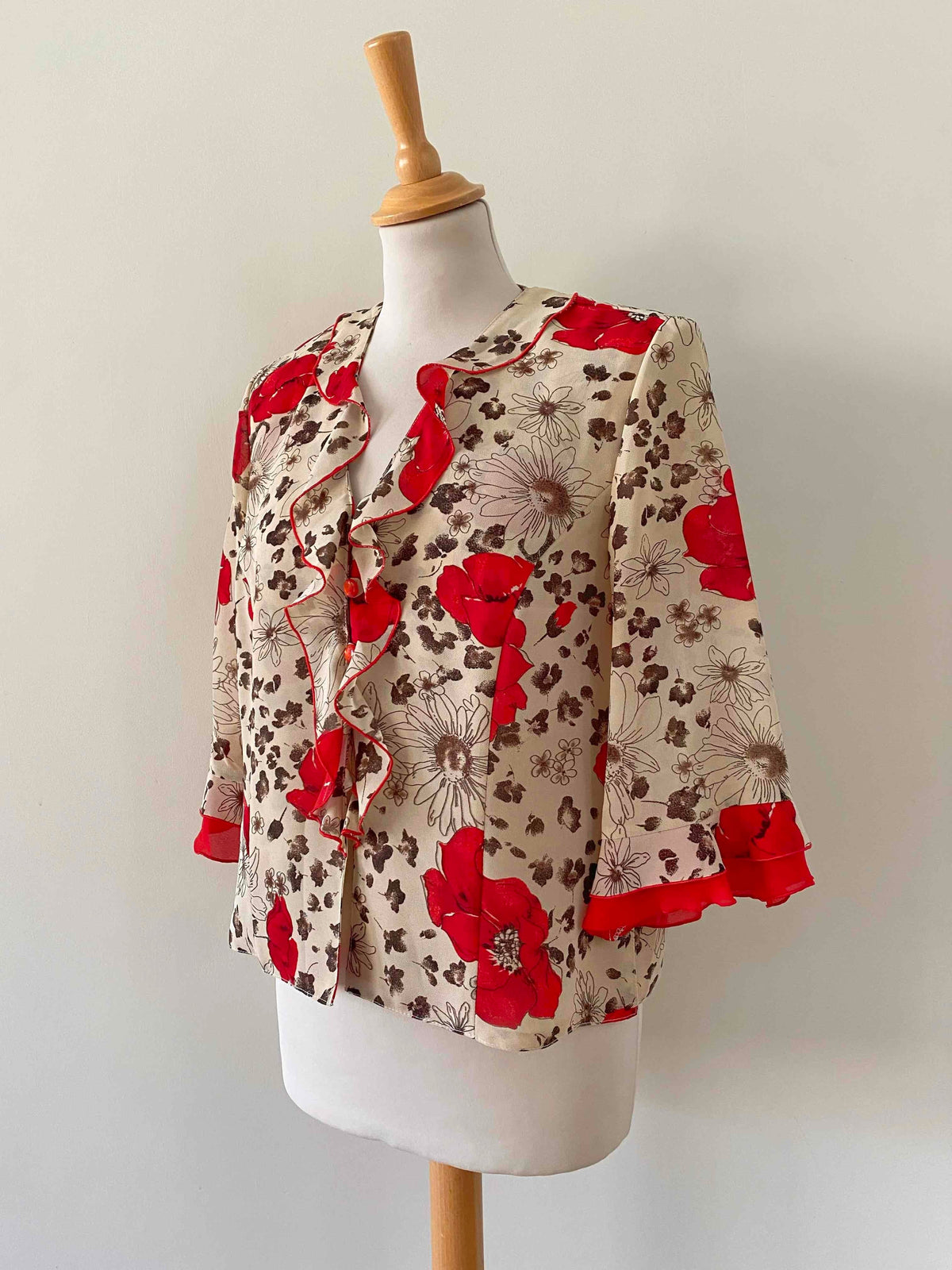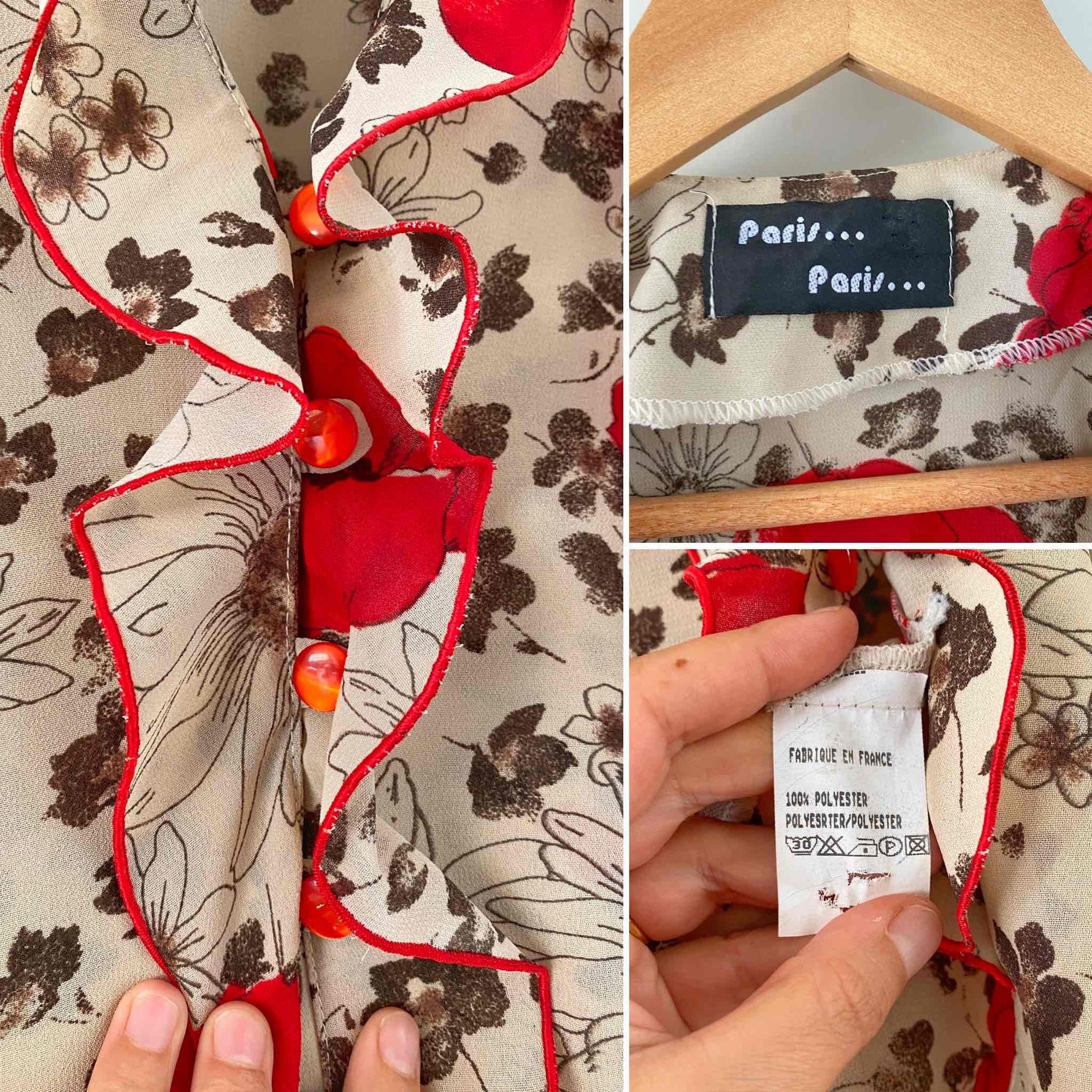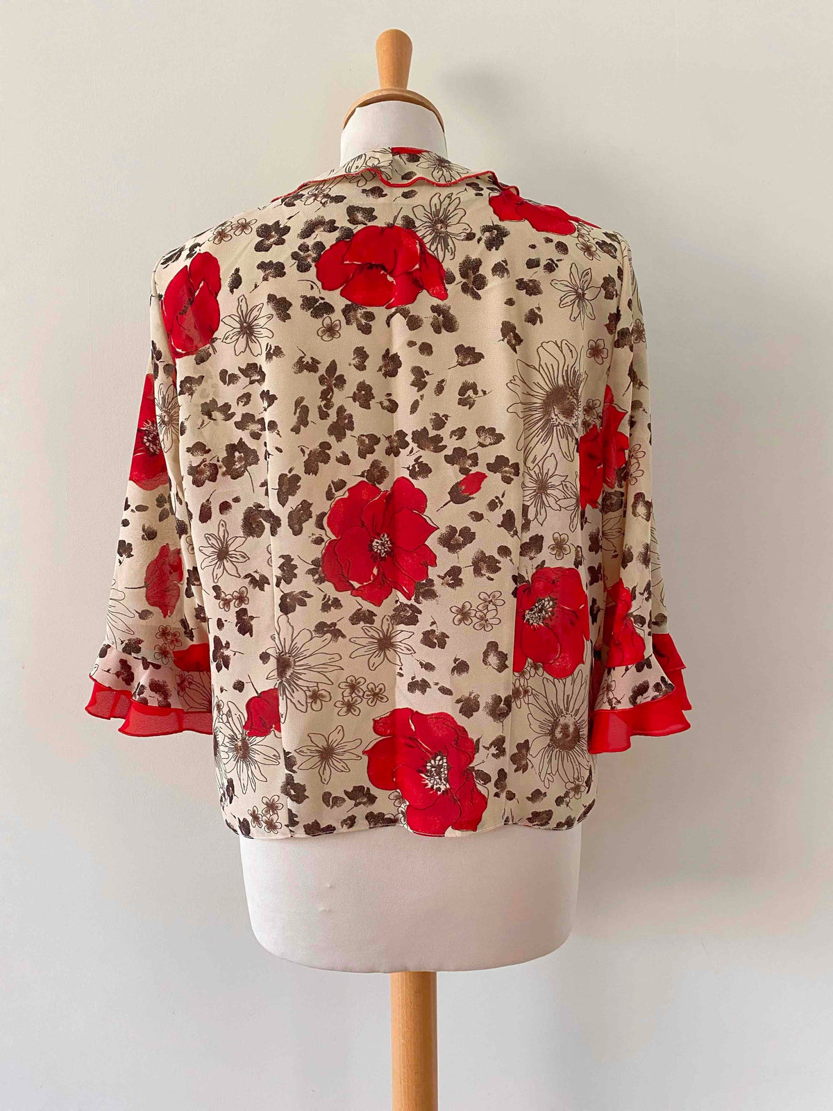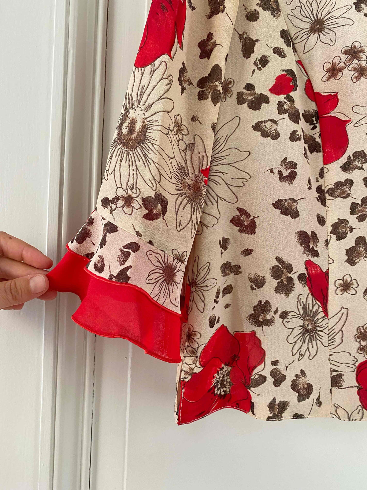 Prix unitaire parBlouse fleurs léopard en voile beige, imprimé fleurs de coquelicots rouges et fleurs chocolats tâches léopard, manches trompettes volantées, col volanté, boutons rouges, fabriquée en France, taille 36 portée ici sur un mannequin T36.