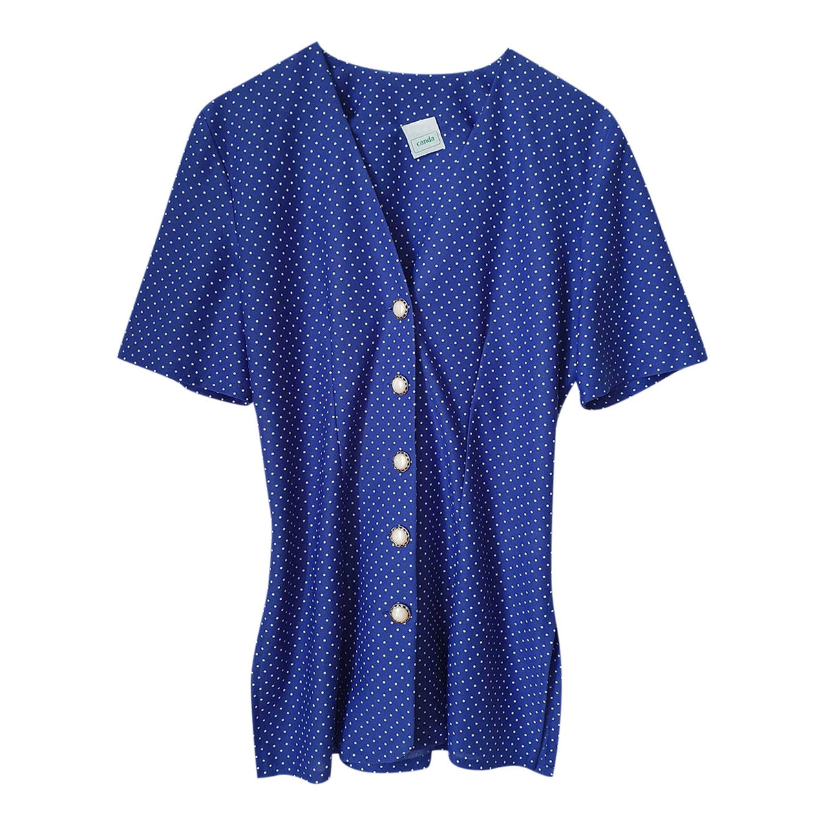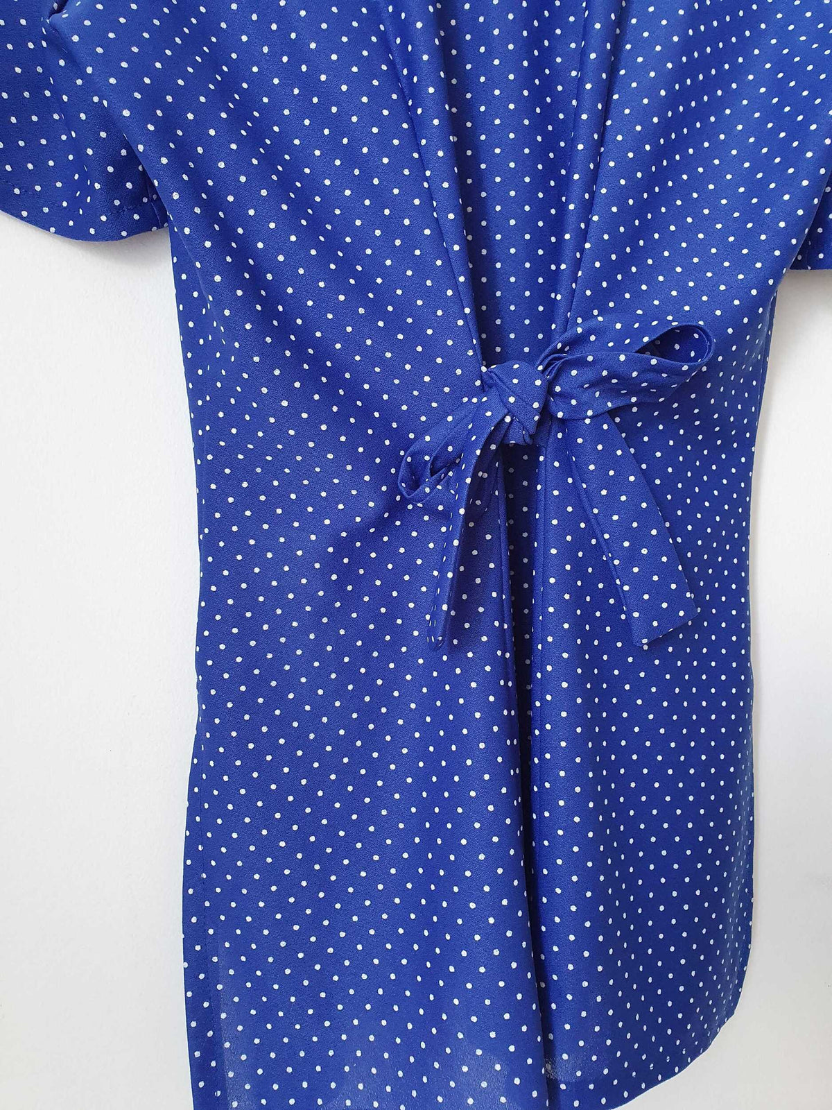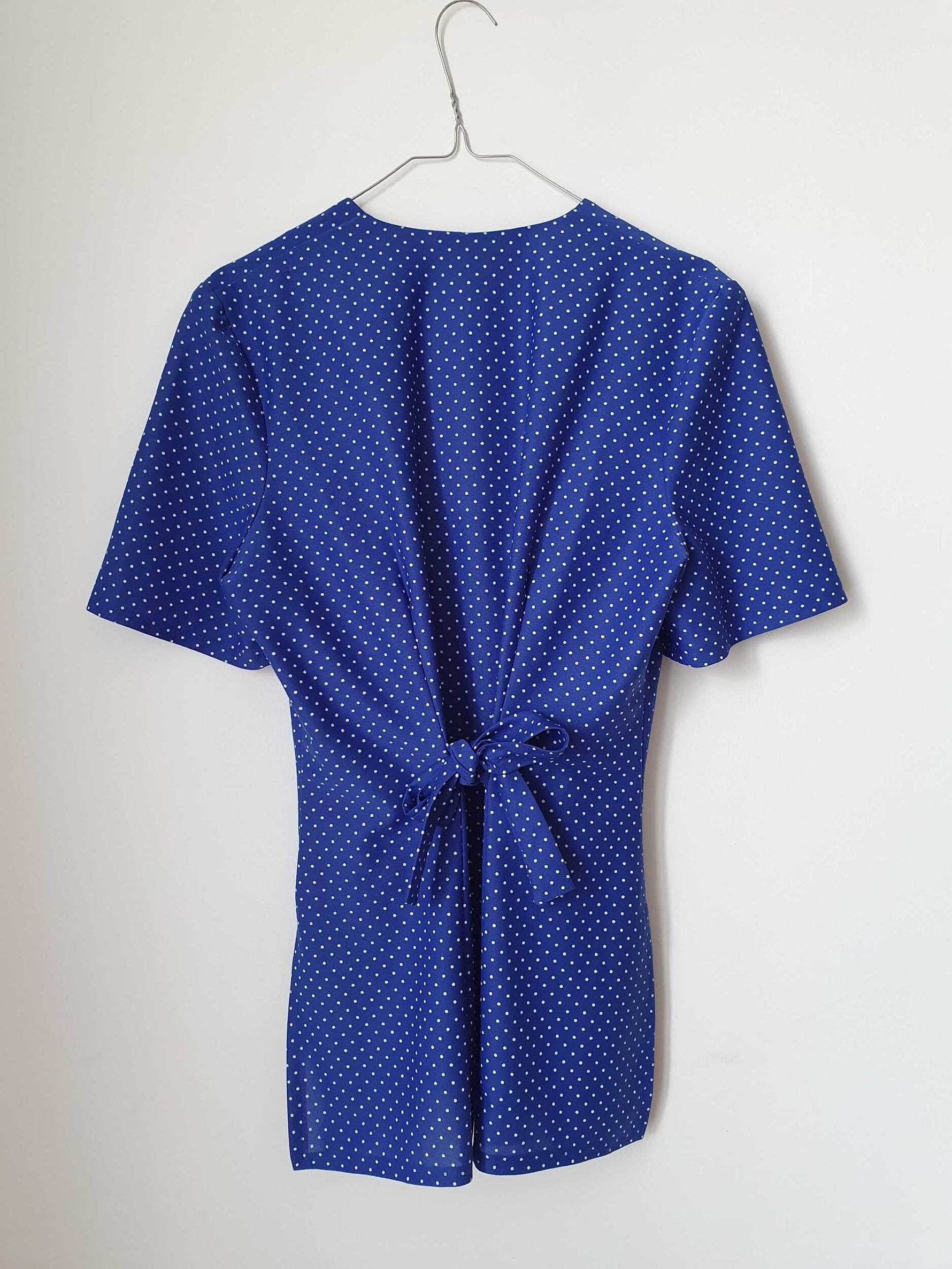 Prix unitaire parChemisier bleu à pois blancs. Liens à serrer dans le dos. Deux fentes côté.