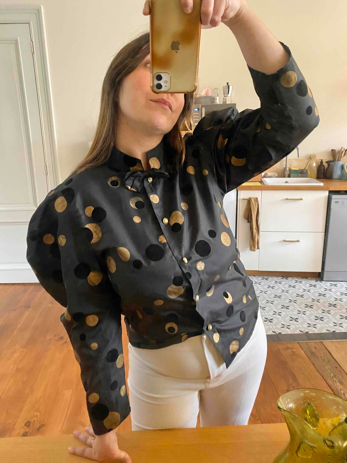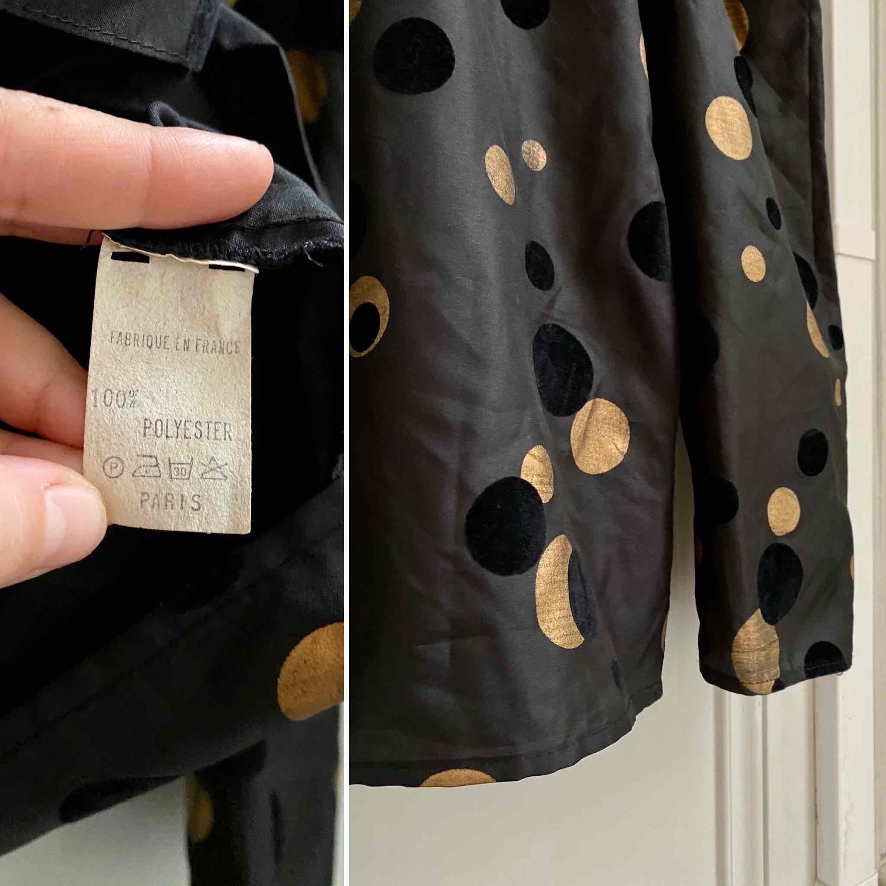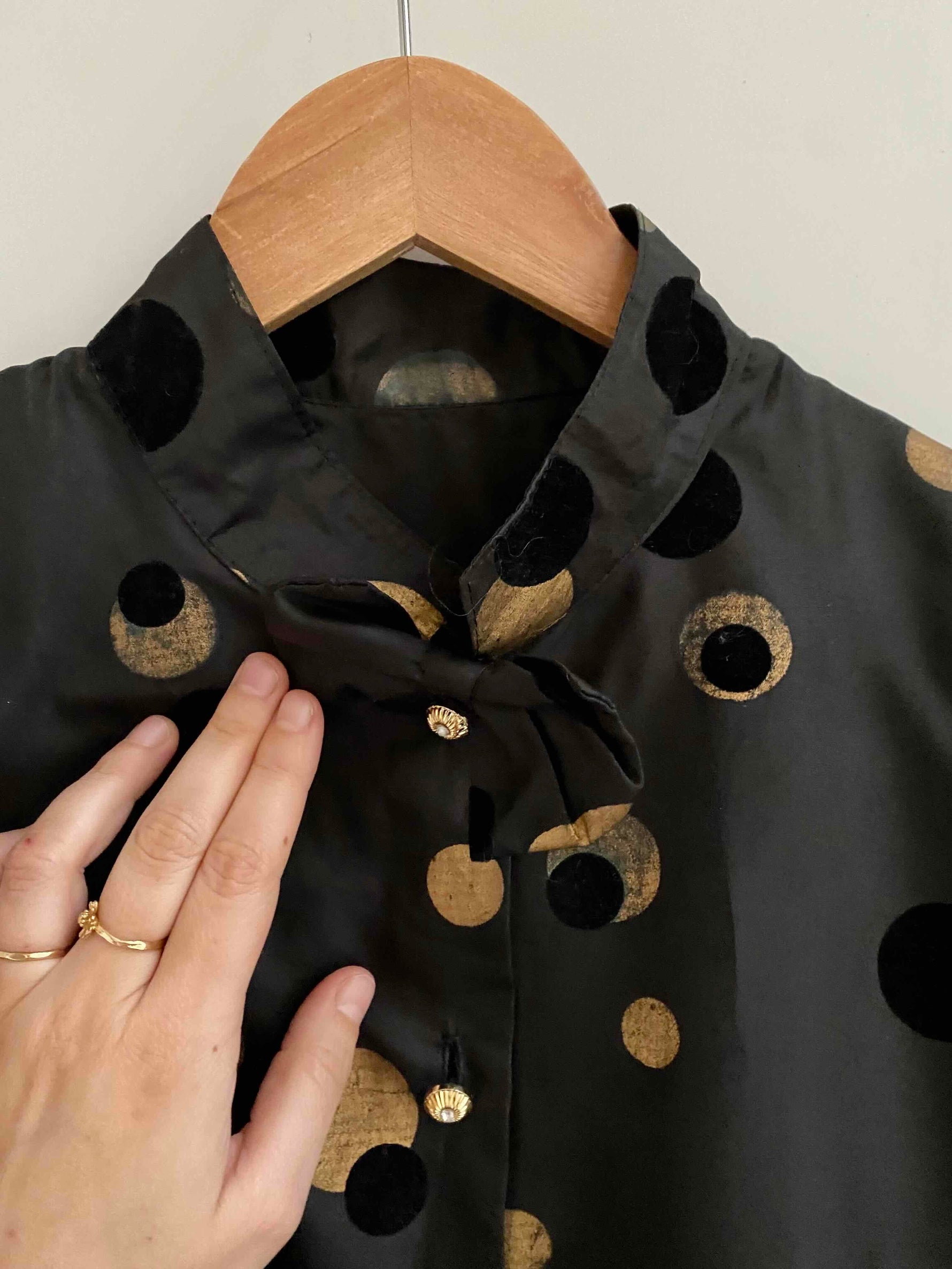 Prix unitaire parBlouse à pois doré et pois floqués velours noirs, col montant, manches ballons gigots, années 80’s, boutons bijoux dorés, fabriqué en France, taille 38 et 40 porté ici sur un mannequin T36 et une personne T40.