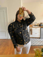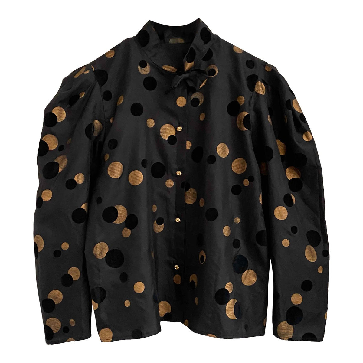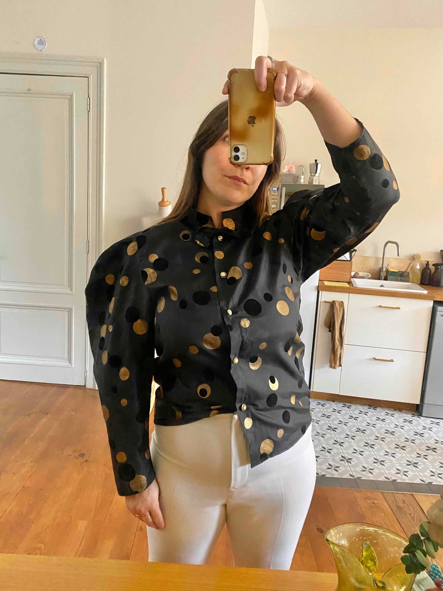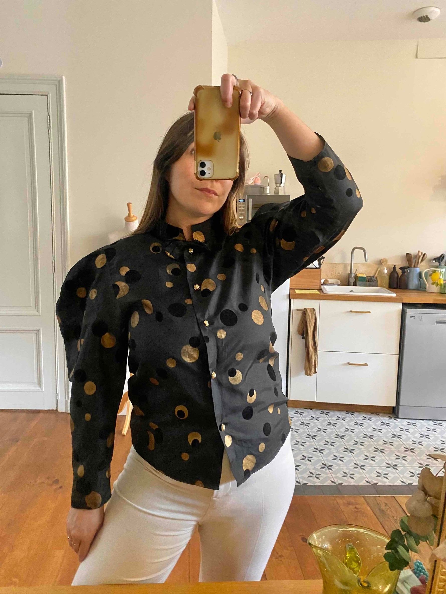 Prix unitaire parBlouse à pois doré et pois floqués velours noirs, col montant, manches ballons gigots, années 80’s, boutons bijoux dorés, fabriqué en France, taille 38 et 40 porté ici sur un mannequin T36 et une personne T40.