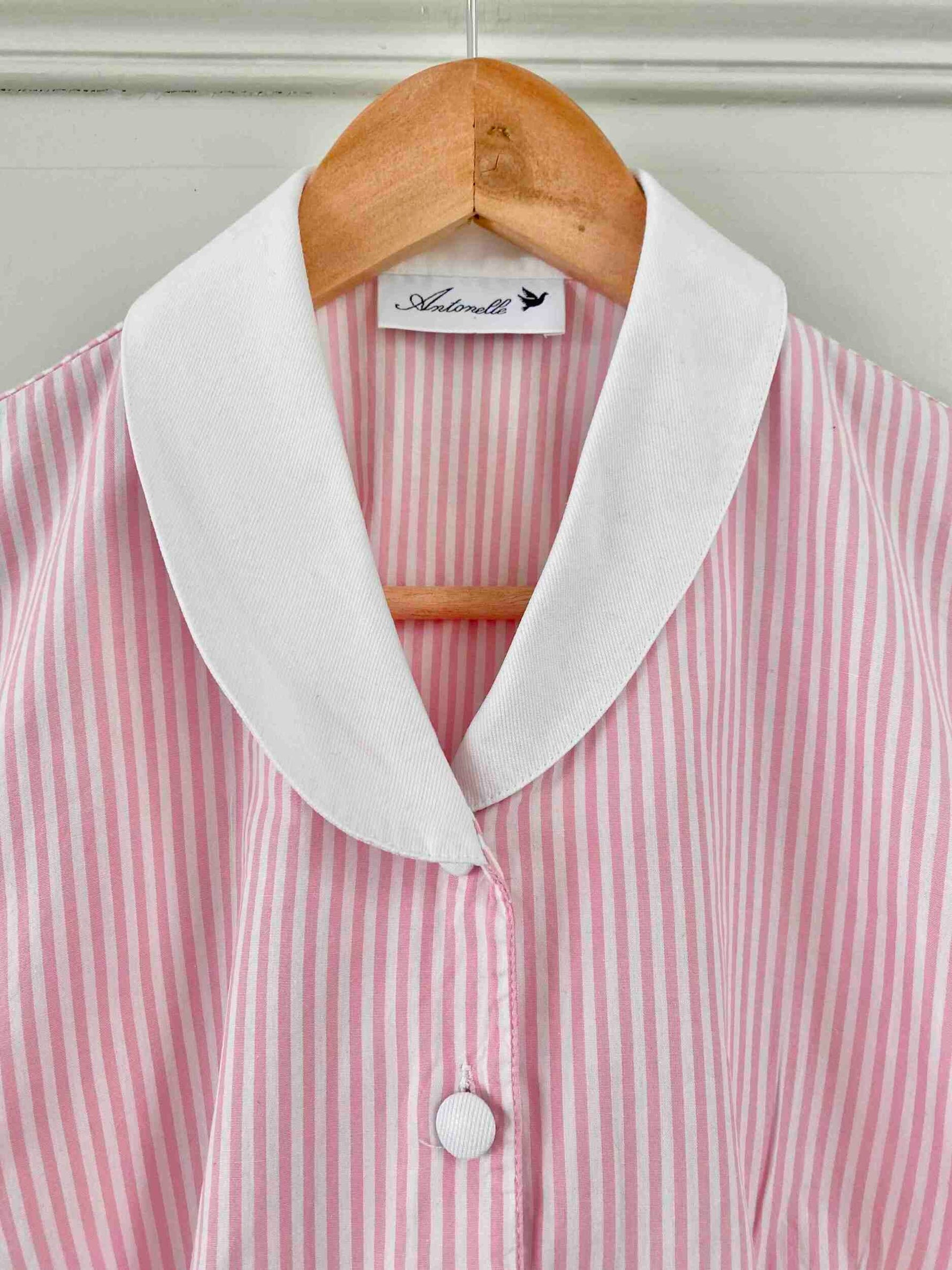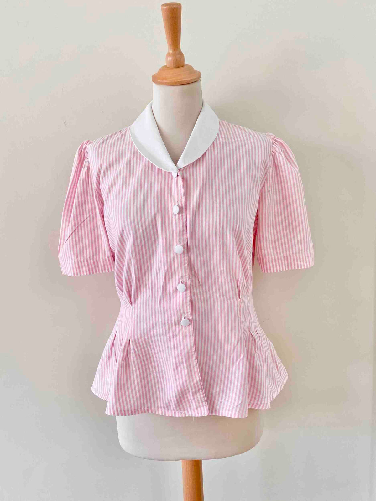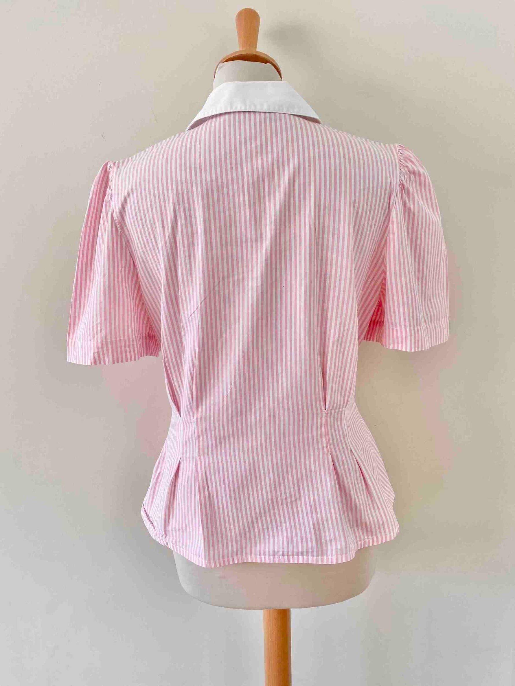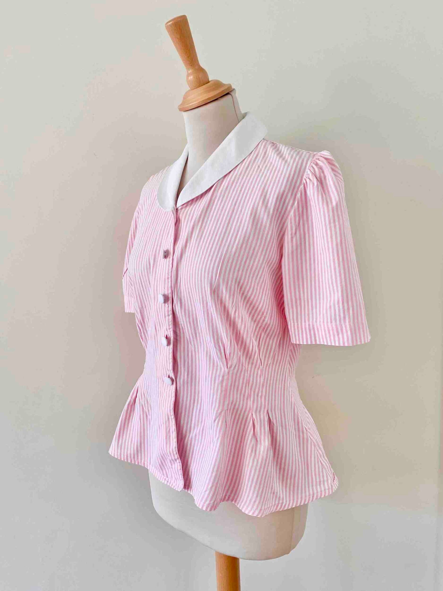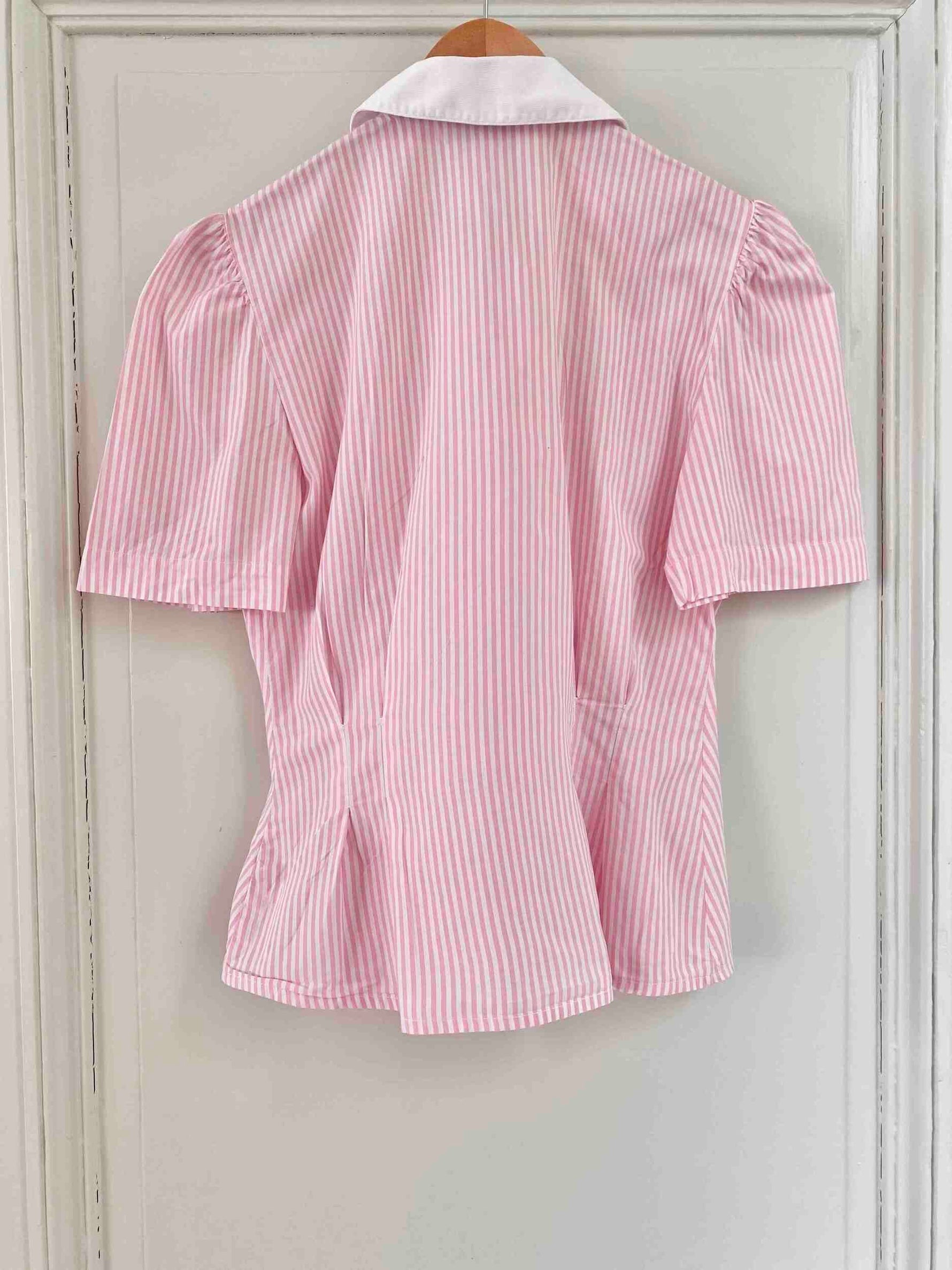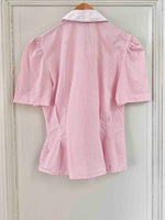 Prix unitaire parBlouse rayée à basque en coton popeline rayures roses et blanches, col rond et boutons blancs contrastés, manches ballon froncées, Antonelle, fabriquée en France.