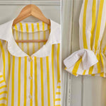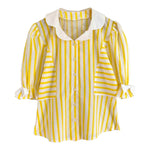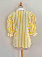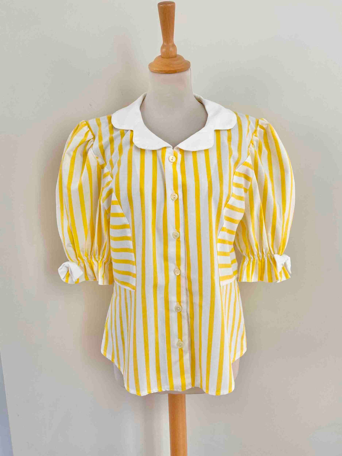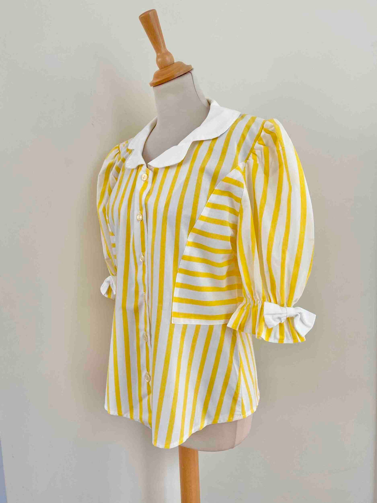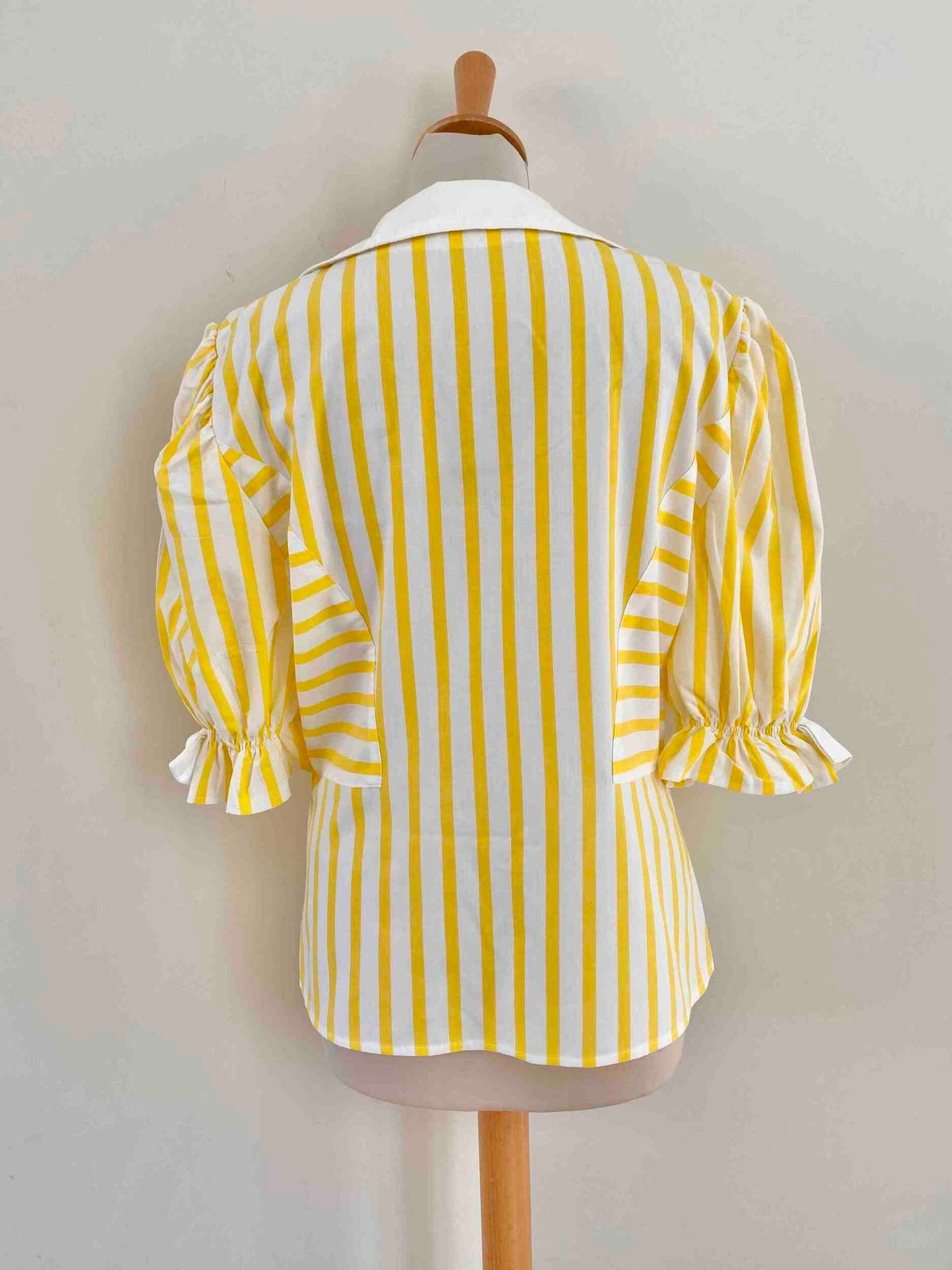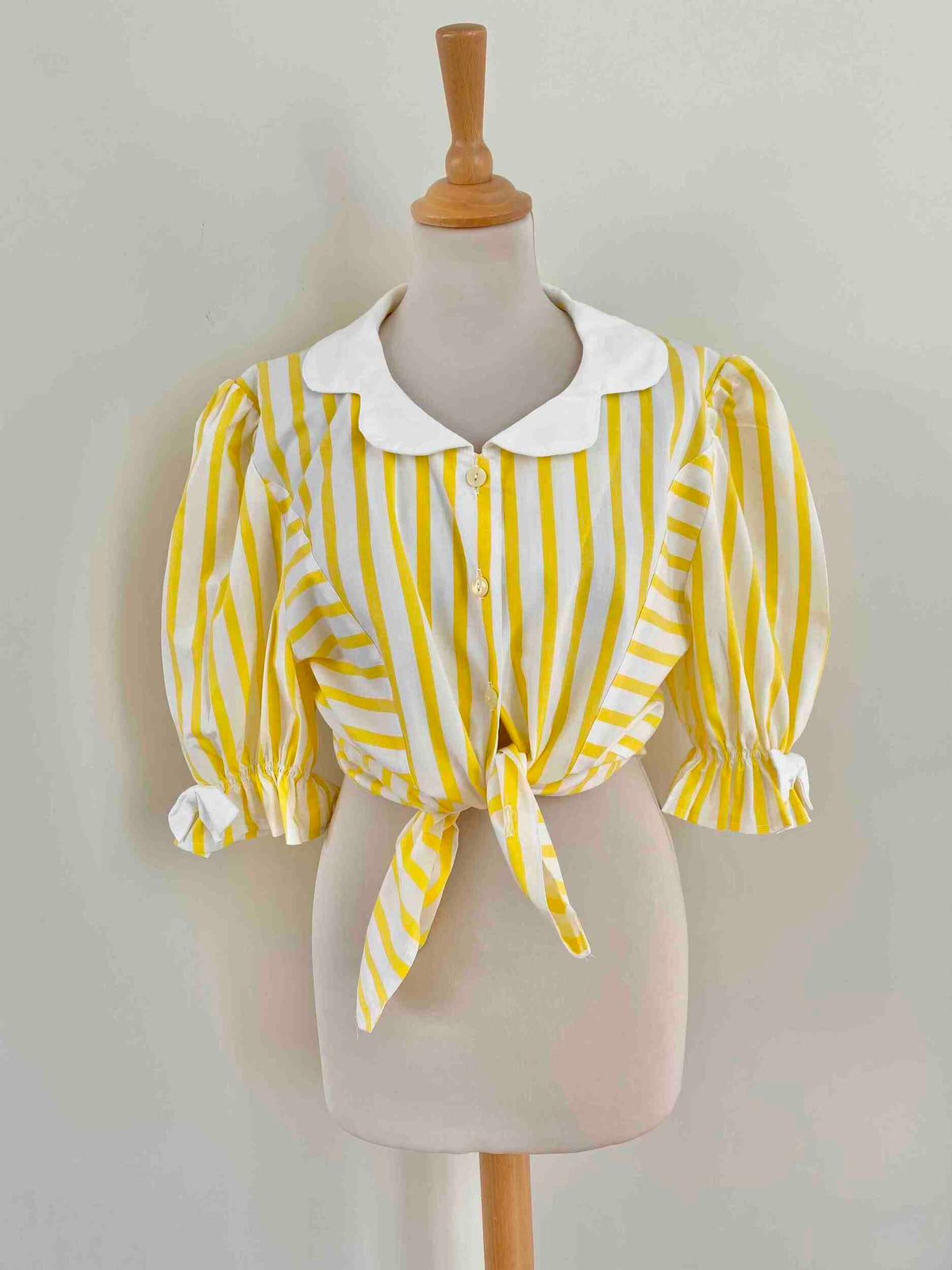 Prix unitaire parBlouse Rayée en coton rayures jaunes et blanches, col claudine festonné en piqué de coton strié, manches ballon à nœuds, découpes de rayures inversées, fabriquée en France.