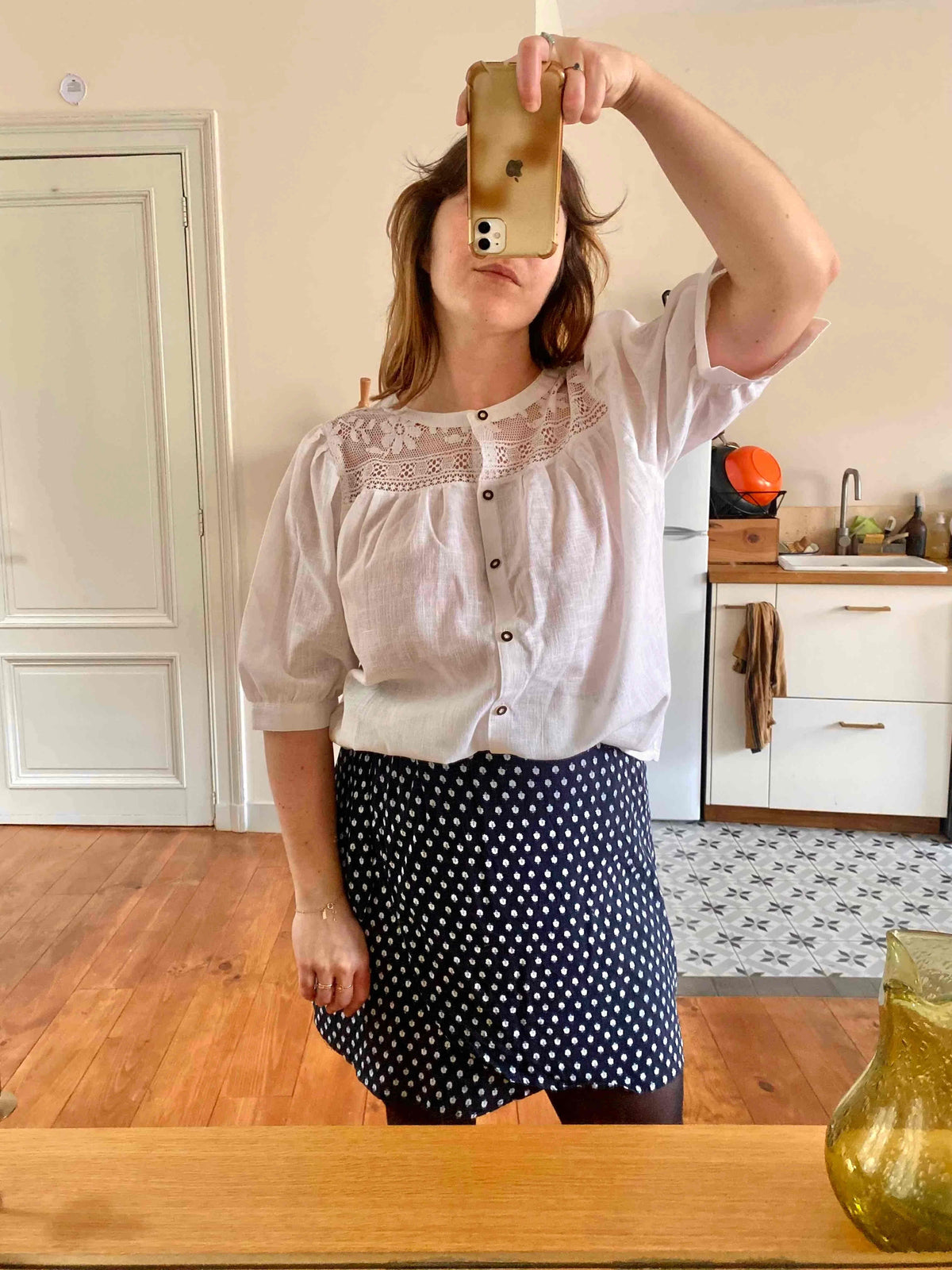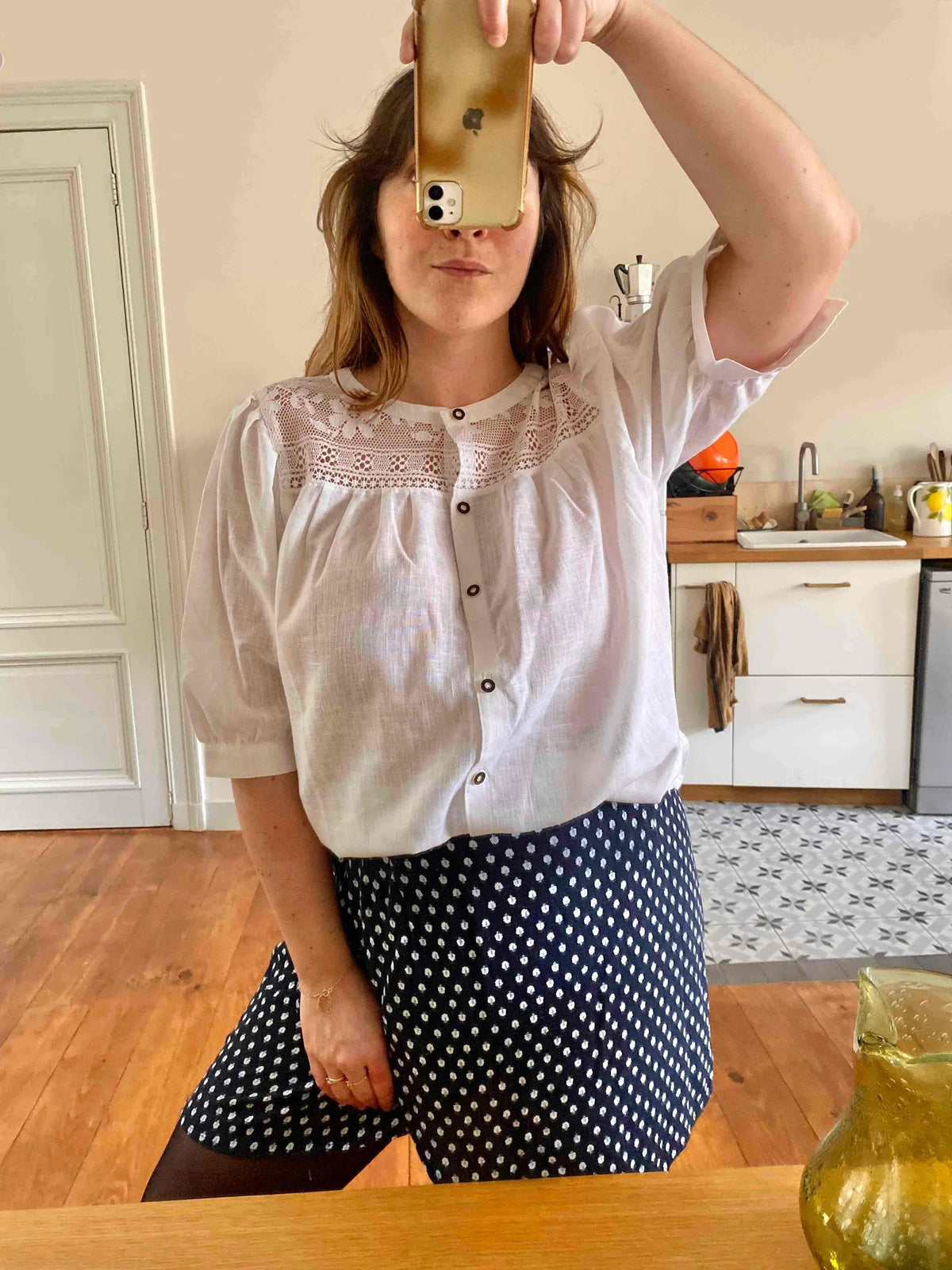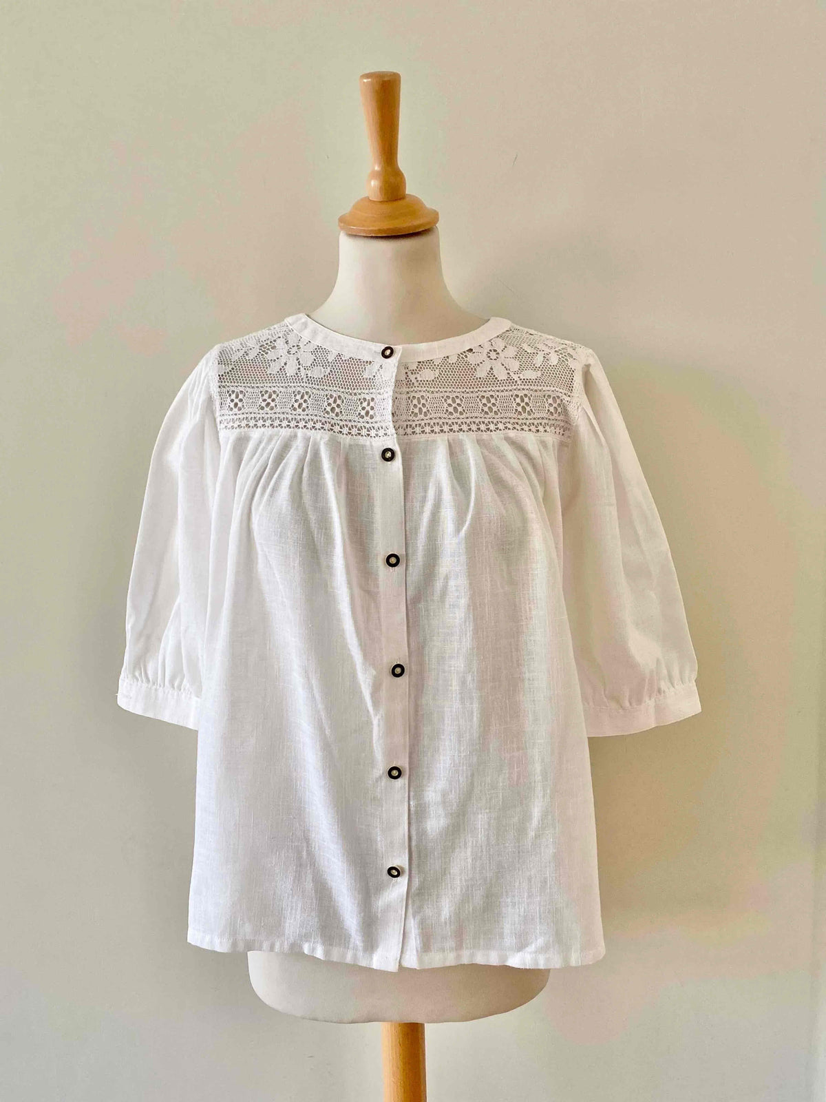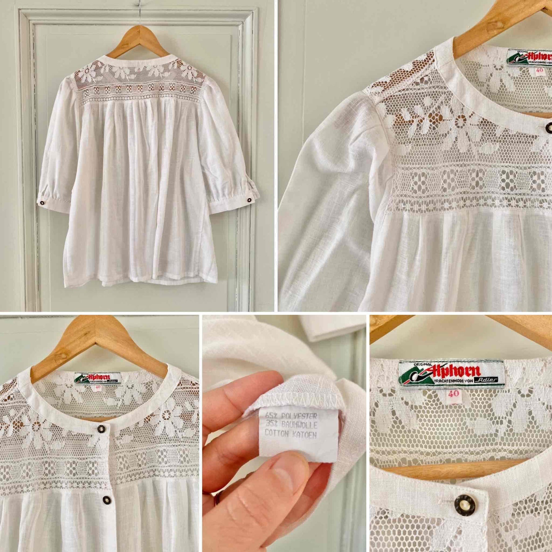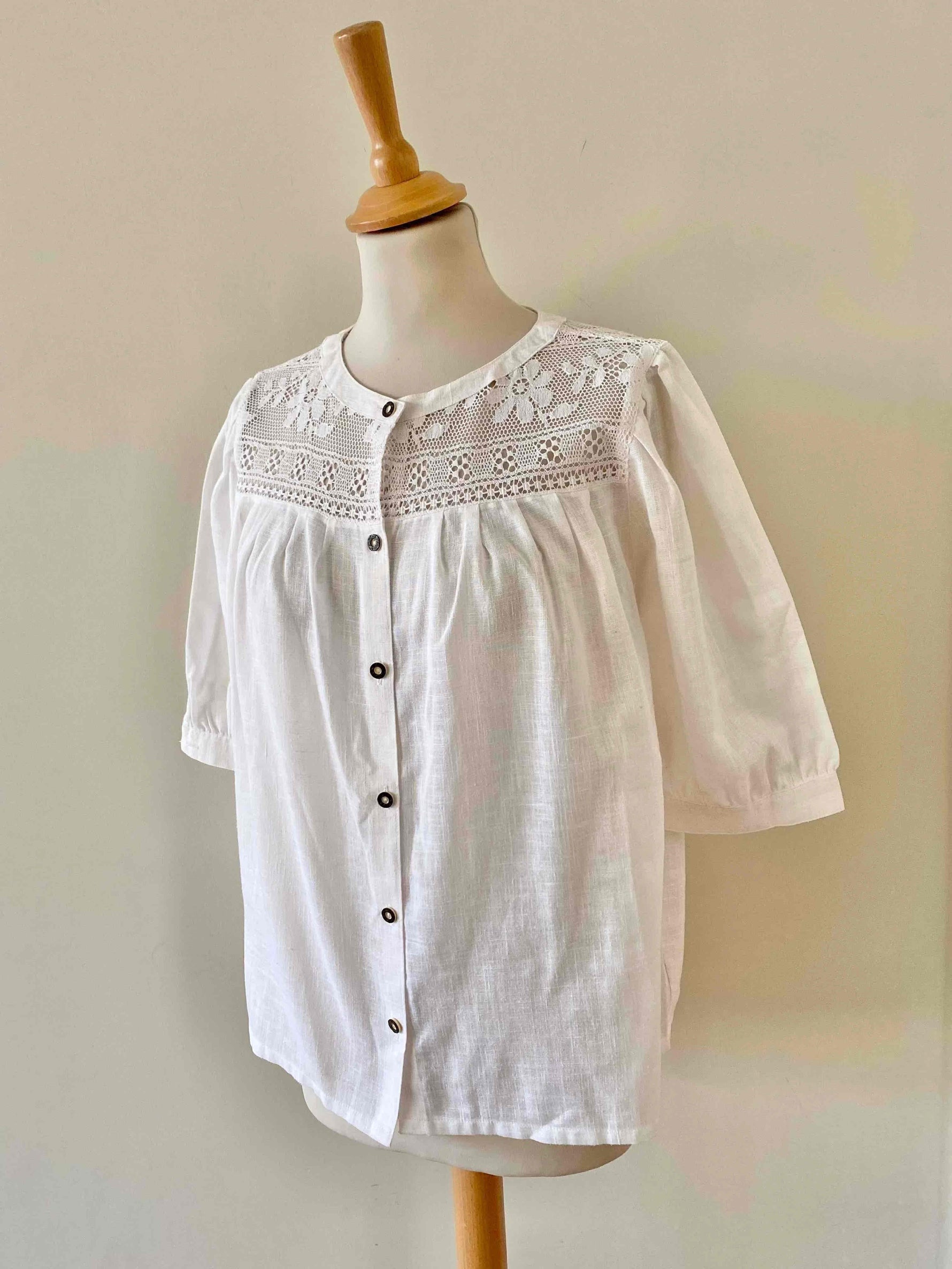 Prix unitaire parBlouse Autrichienne en gaze de coton mélangé, ajourée de dentelle macramé florale au plastron devant et dos, manches ballon courtes, fabriquée en Autriche, porté ici sur un mannequin T36 et une personne T40.