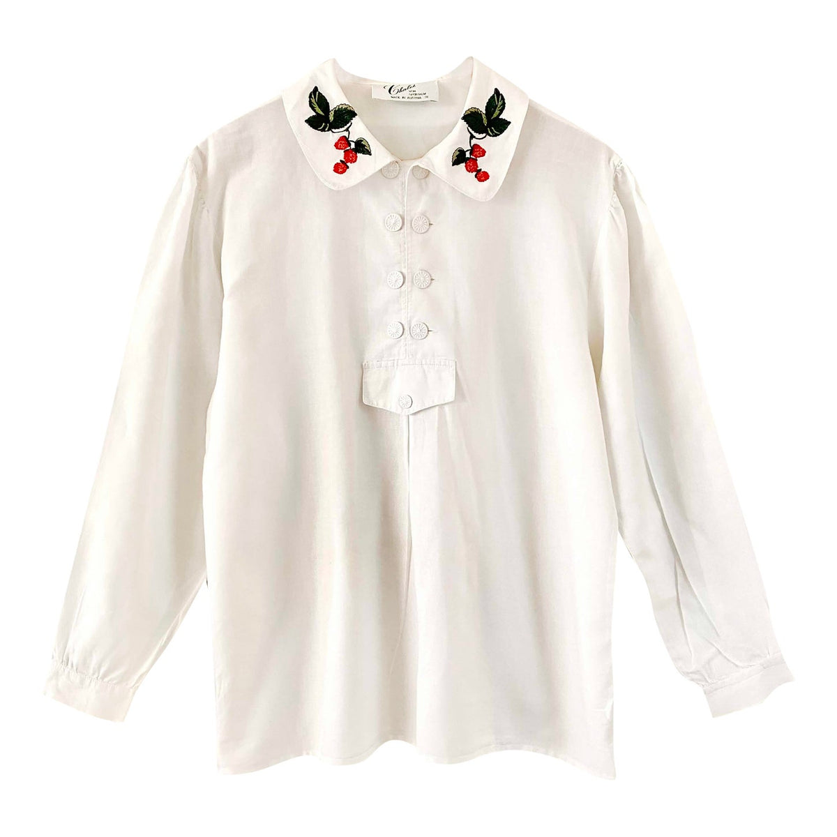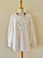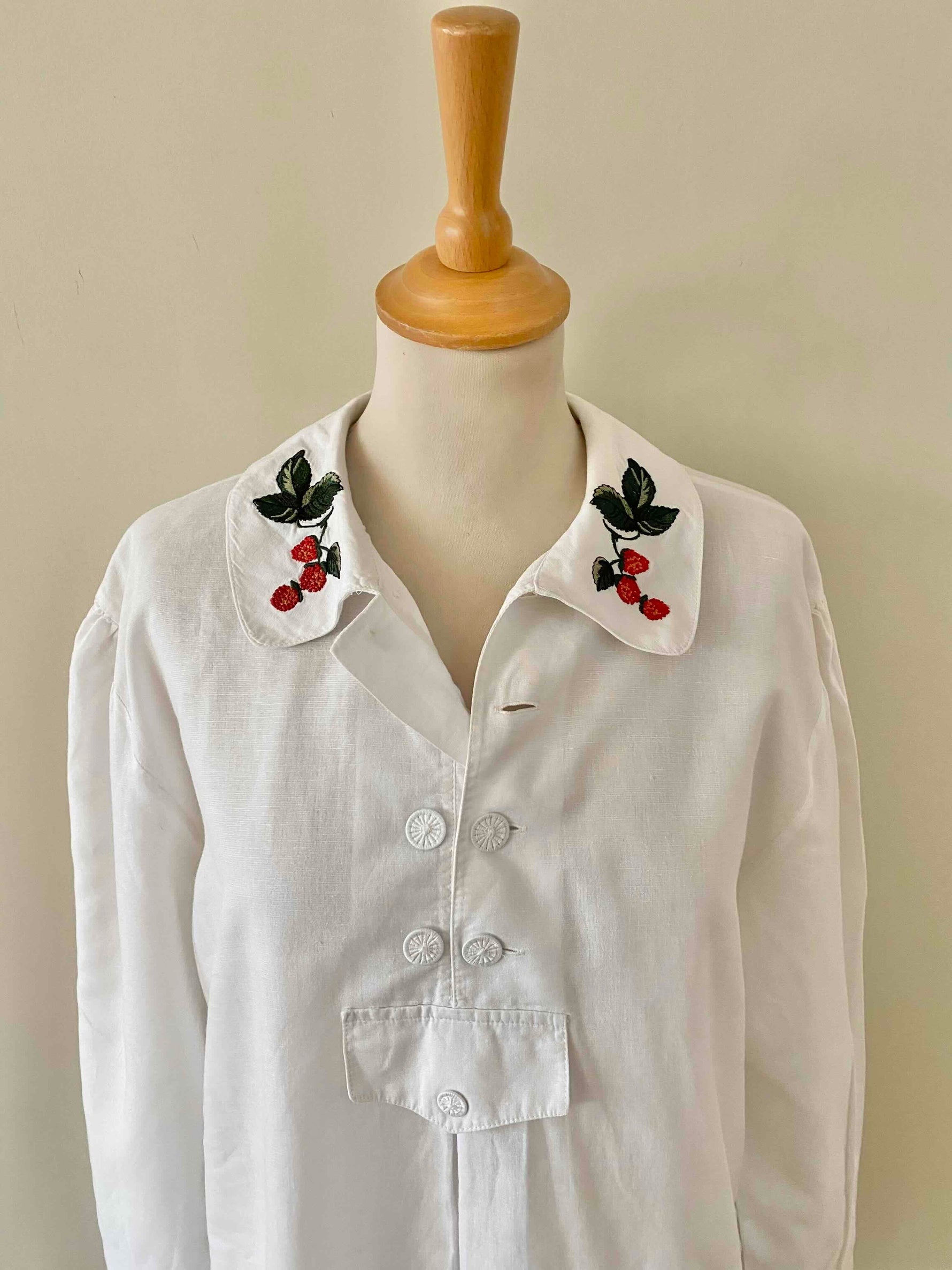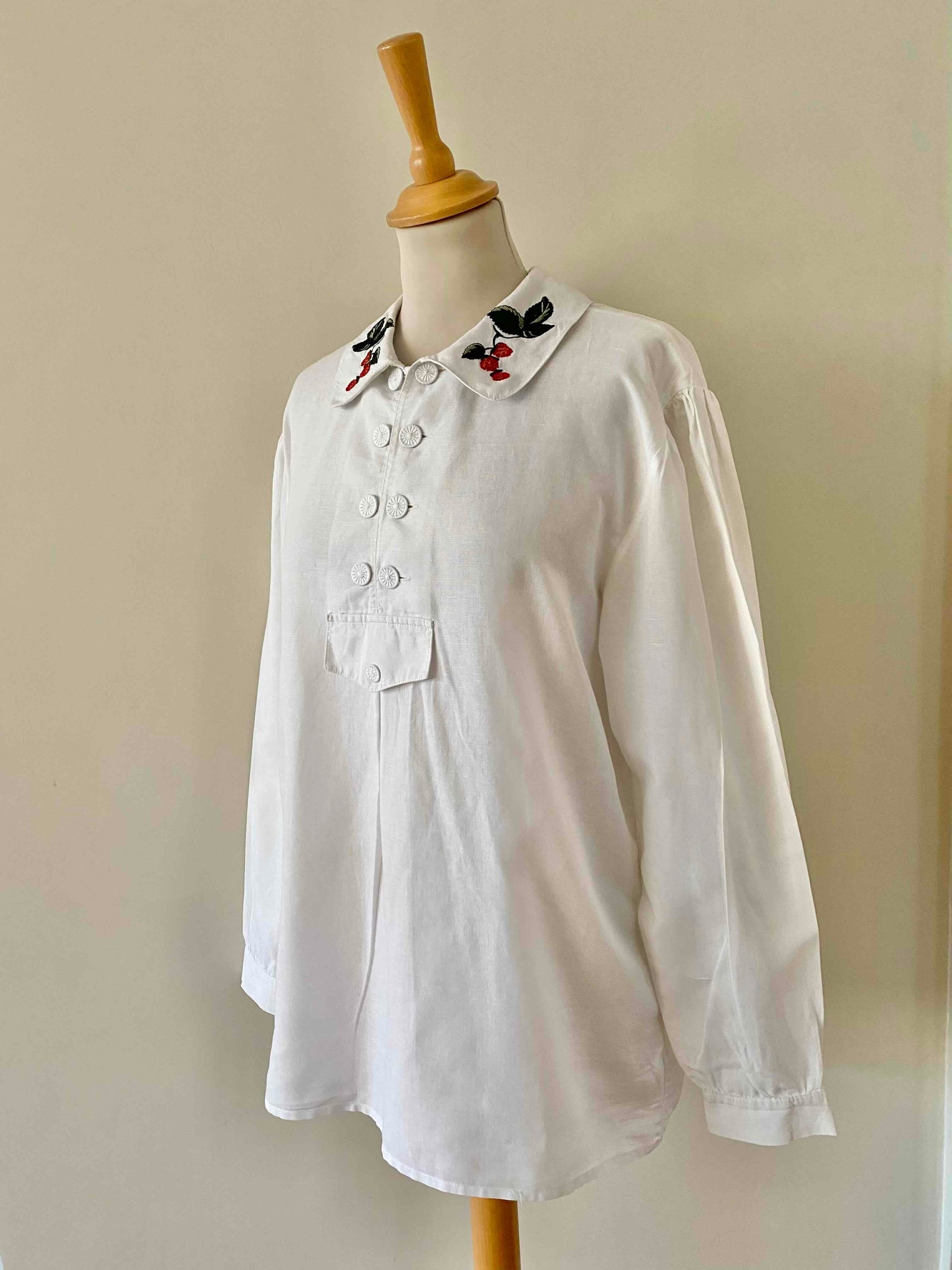Prix unitaire parBlouse autrichienne en pur coton blanc, col claudine brodé de framboises rouges et vertes, forme liquette trapèze, col tunique aux boutons brodés, fabriquée en Autriche, taille 38 portée ici sur un mannequin T36 et une personne T40.