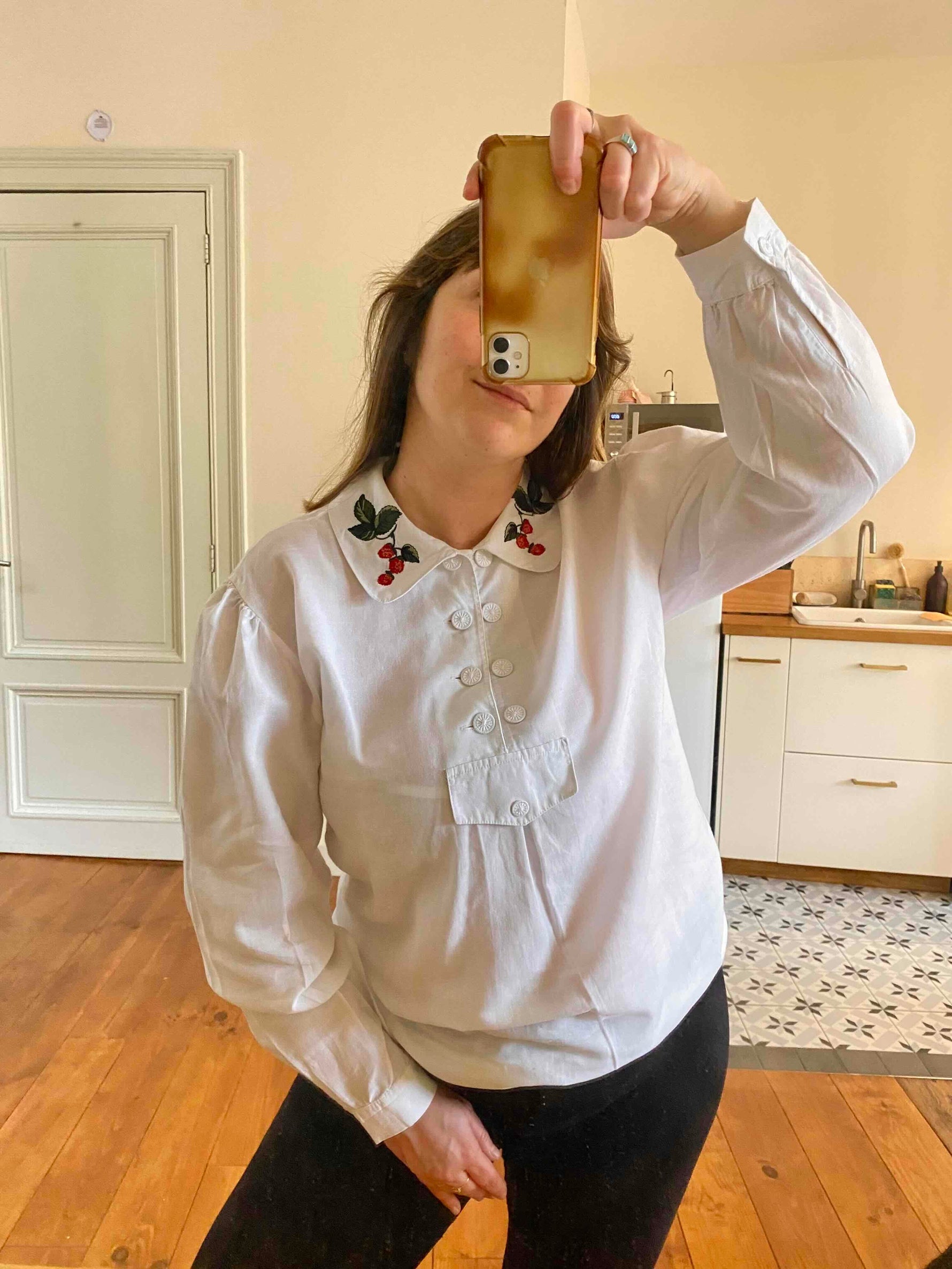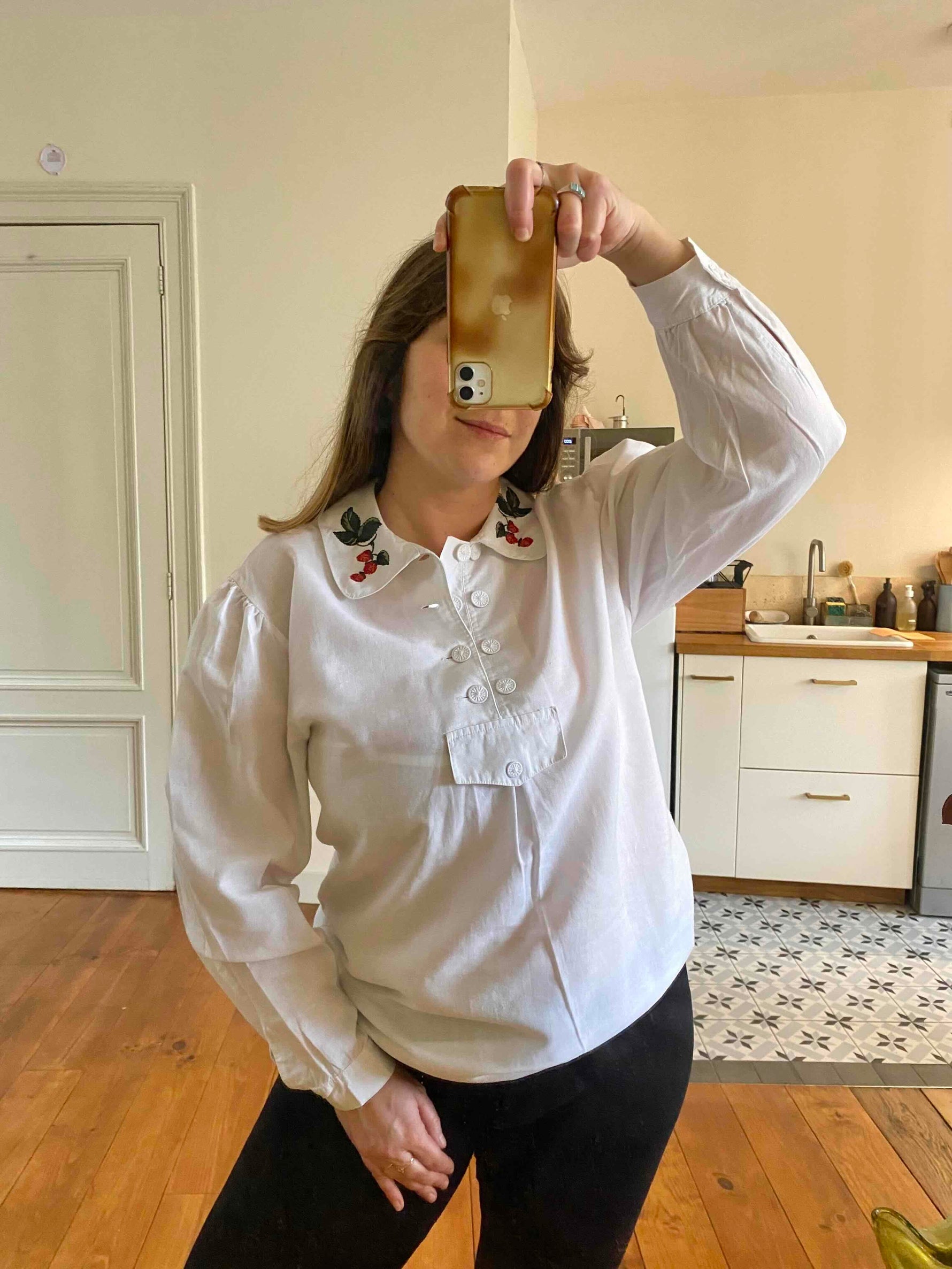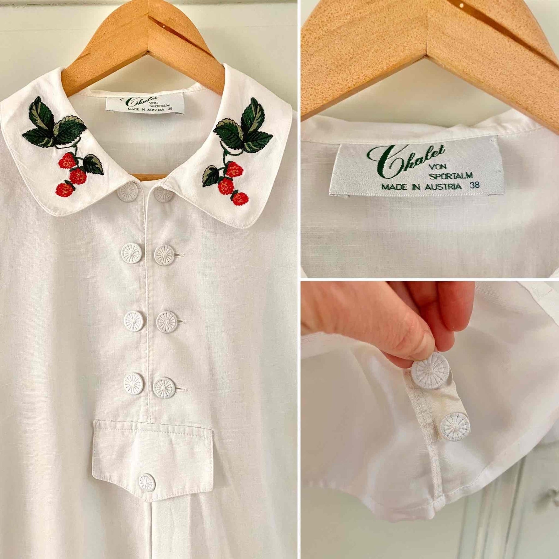 Prix unitaire parBlouse autrichienne en pur coton blanc, col claudine brodé de framboises rouges et vertes, forme liquette trapèze, col tunique aux boutons brodés, fabriquée en Autriche, taille 38 portée ici sur un mannequin T36 et une personne T40.