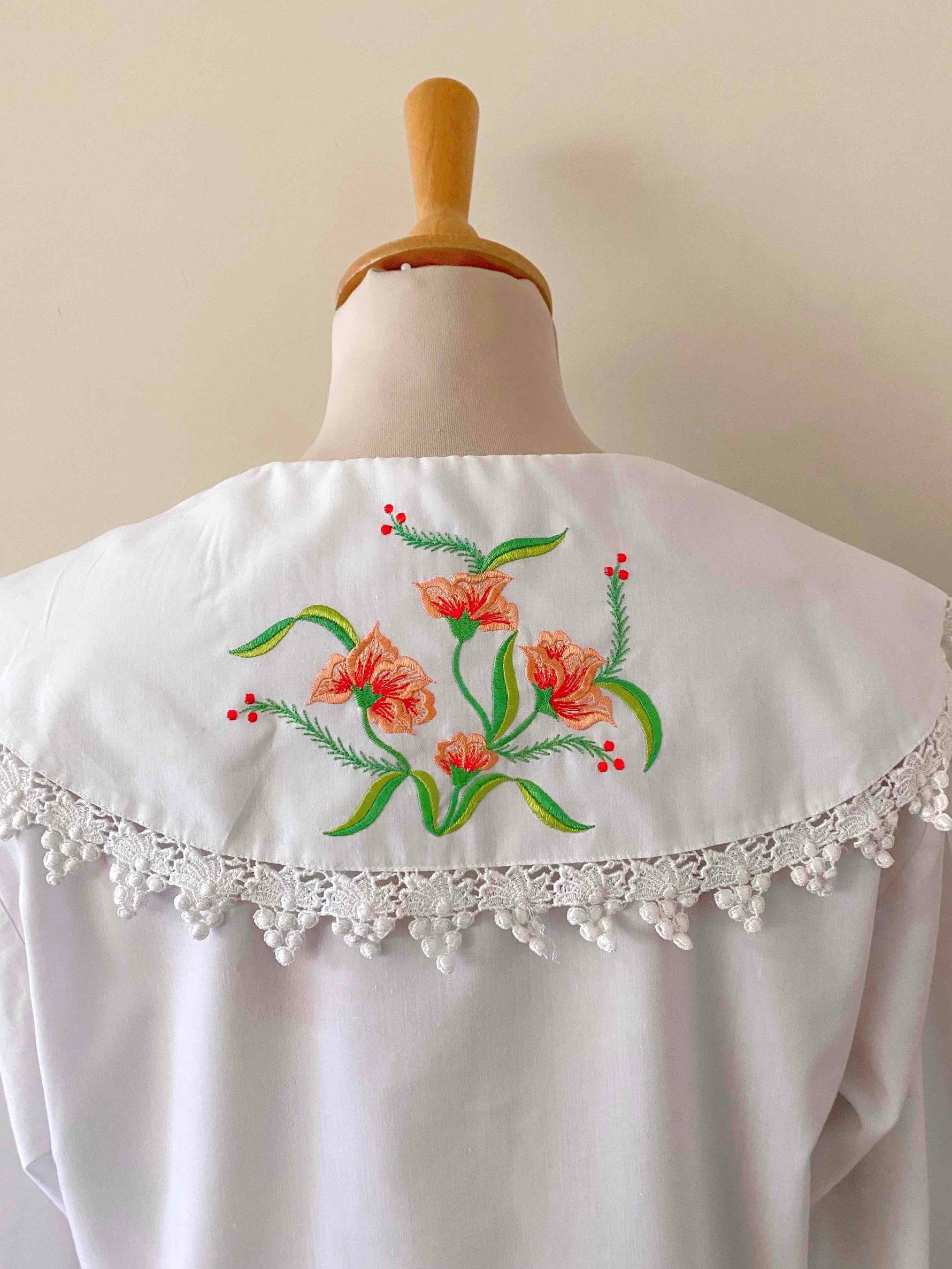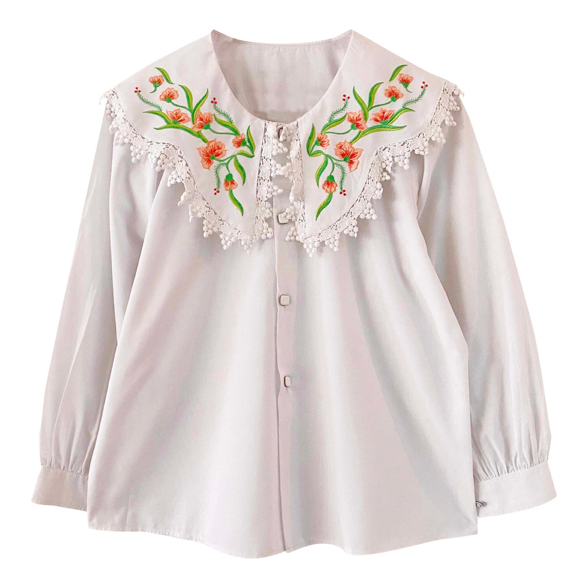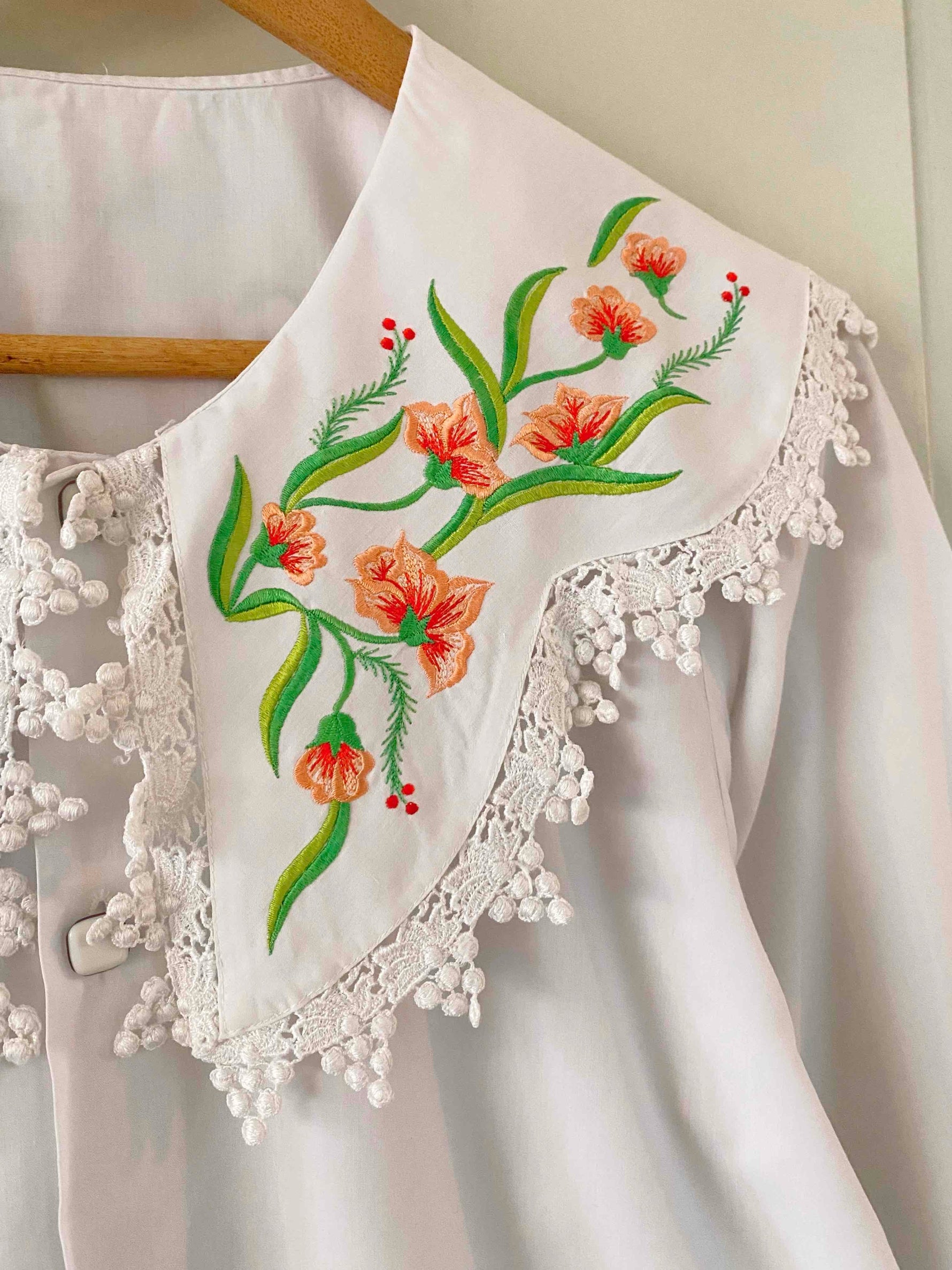 Prix unitaire parBlouse autrichienne en coton popeline à grand col peter pan brodé de fleurs rose orangées et vertes, bordures en dentelle, manches ballons, fabriquée en Autriche, taille 36 et 38 portée ici sur un mannequin T36.