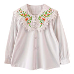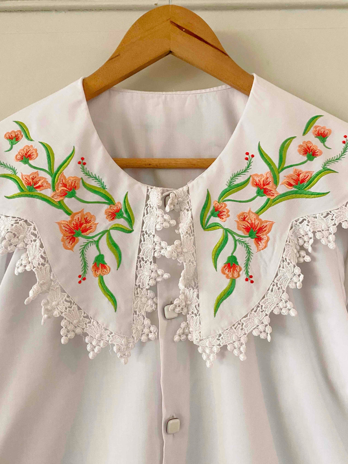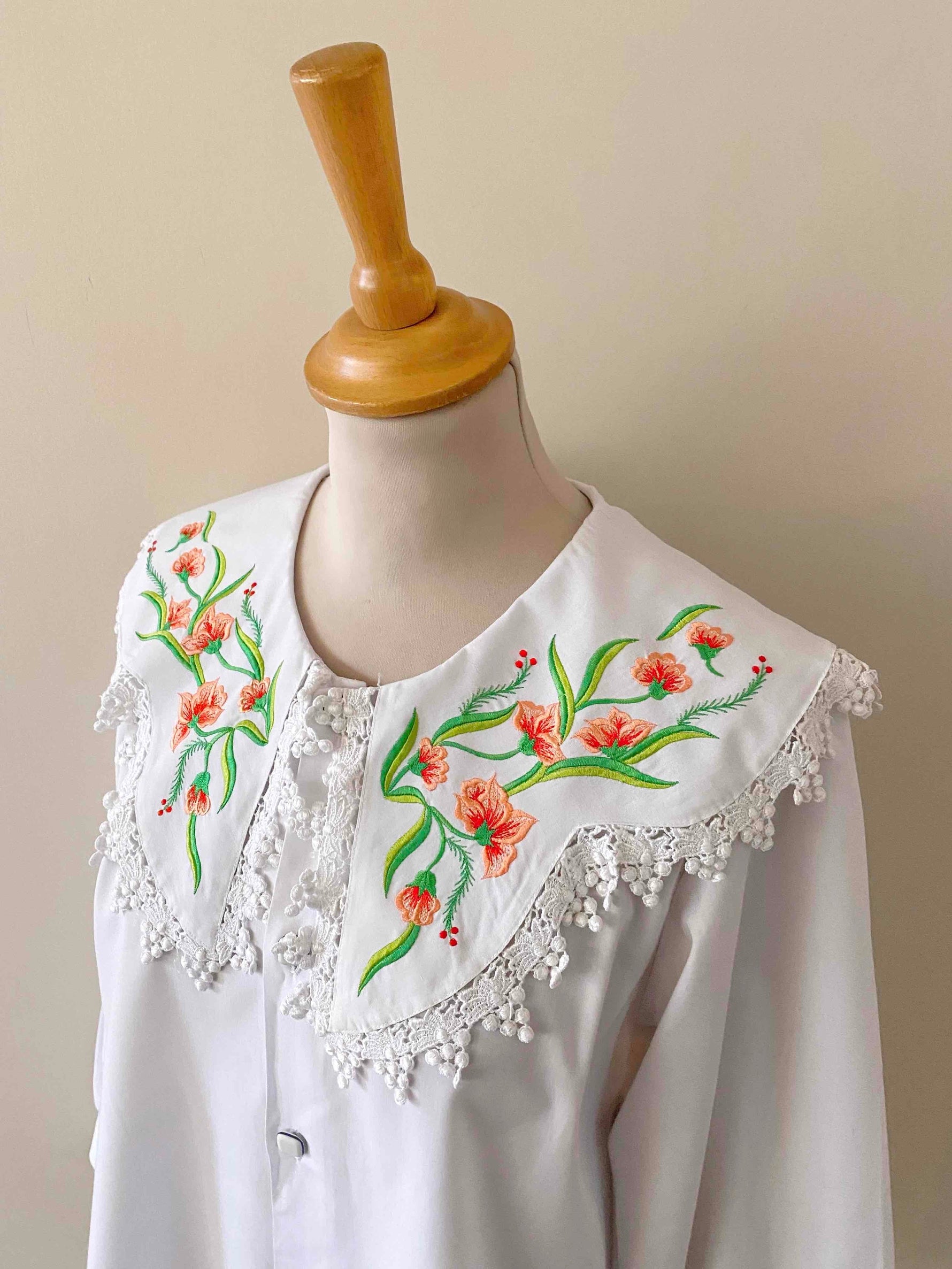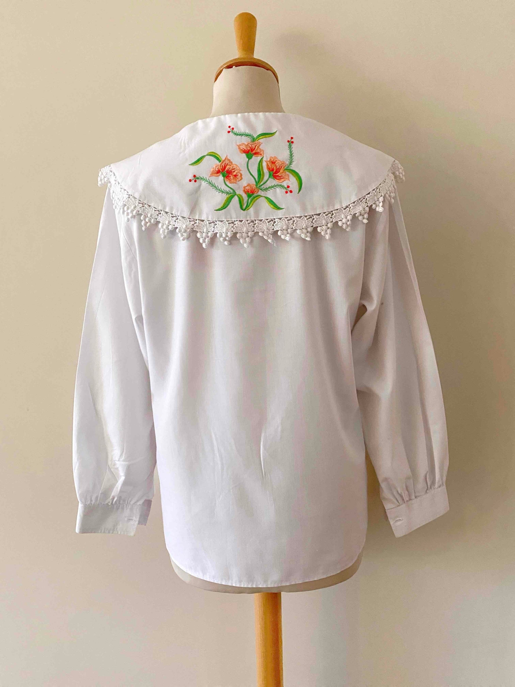 Prix unitaire parBlouse autrichienne en coton popeline à grand col peter pan brodé de fleurs rose orangées et vertes, bordures en dentelle, manches ballons, fabriquée en Autriche, taille 36 et 38 portée ici sur un mannequin T36.