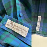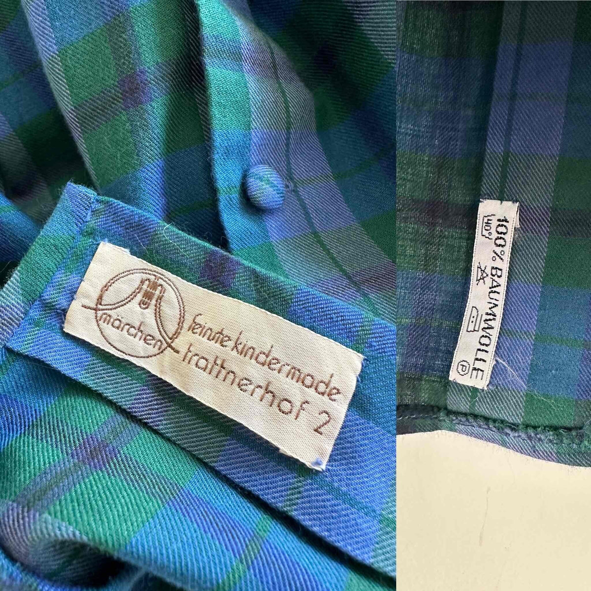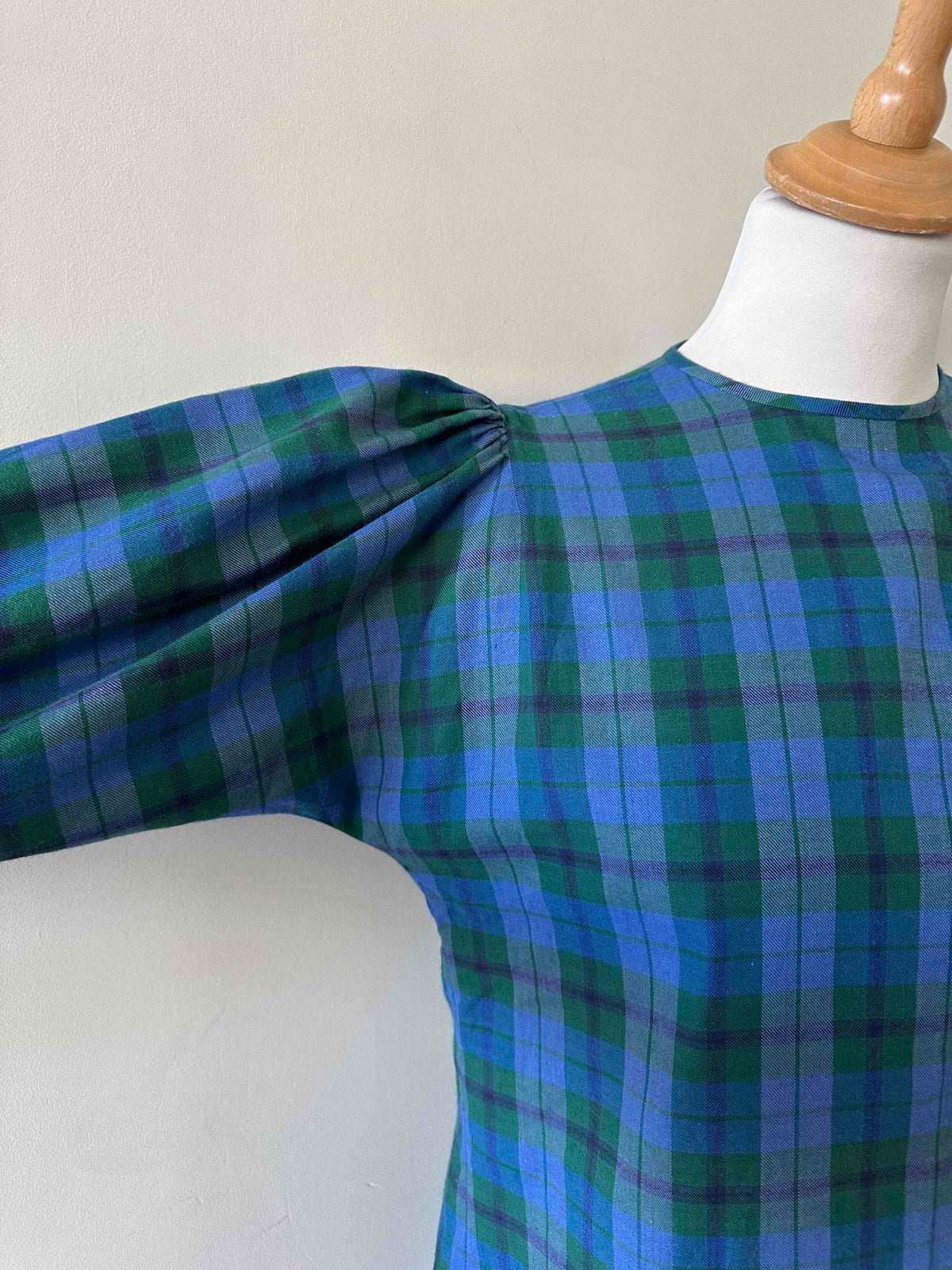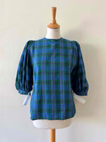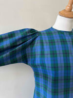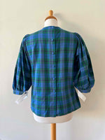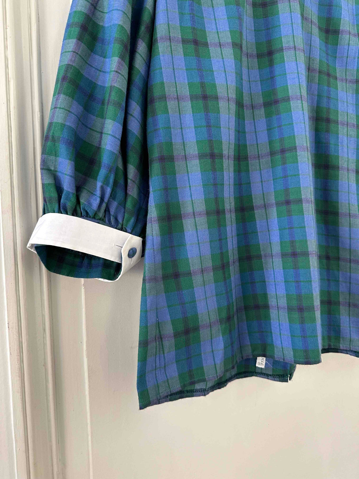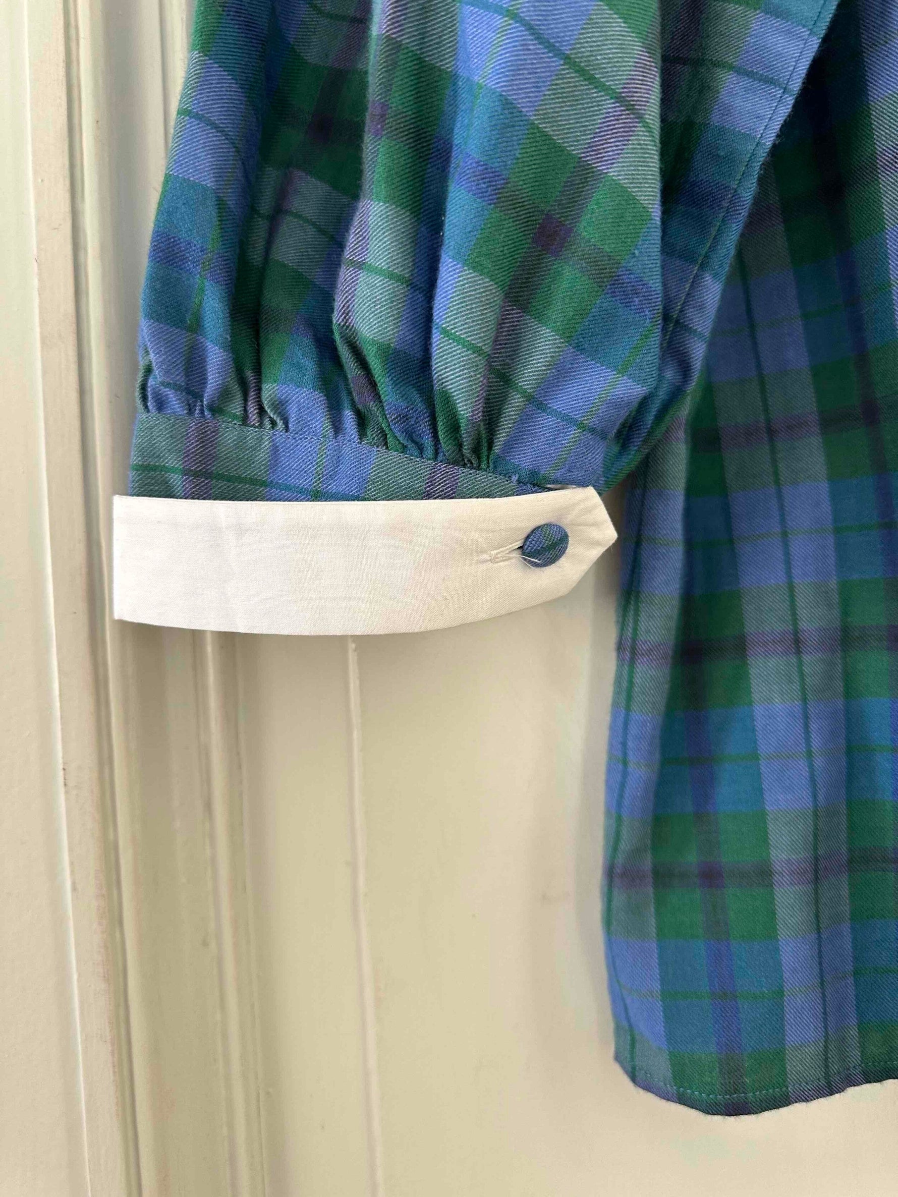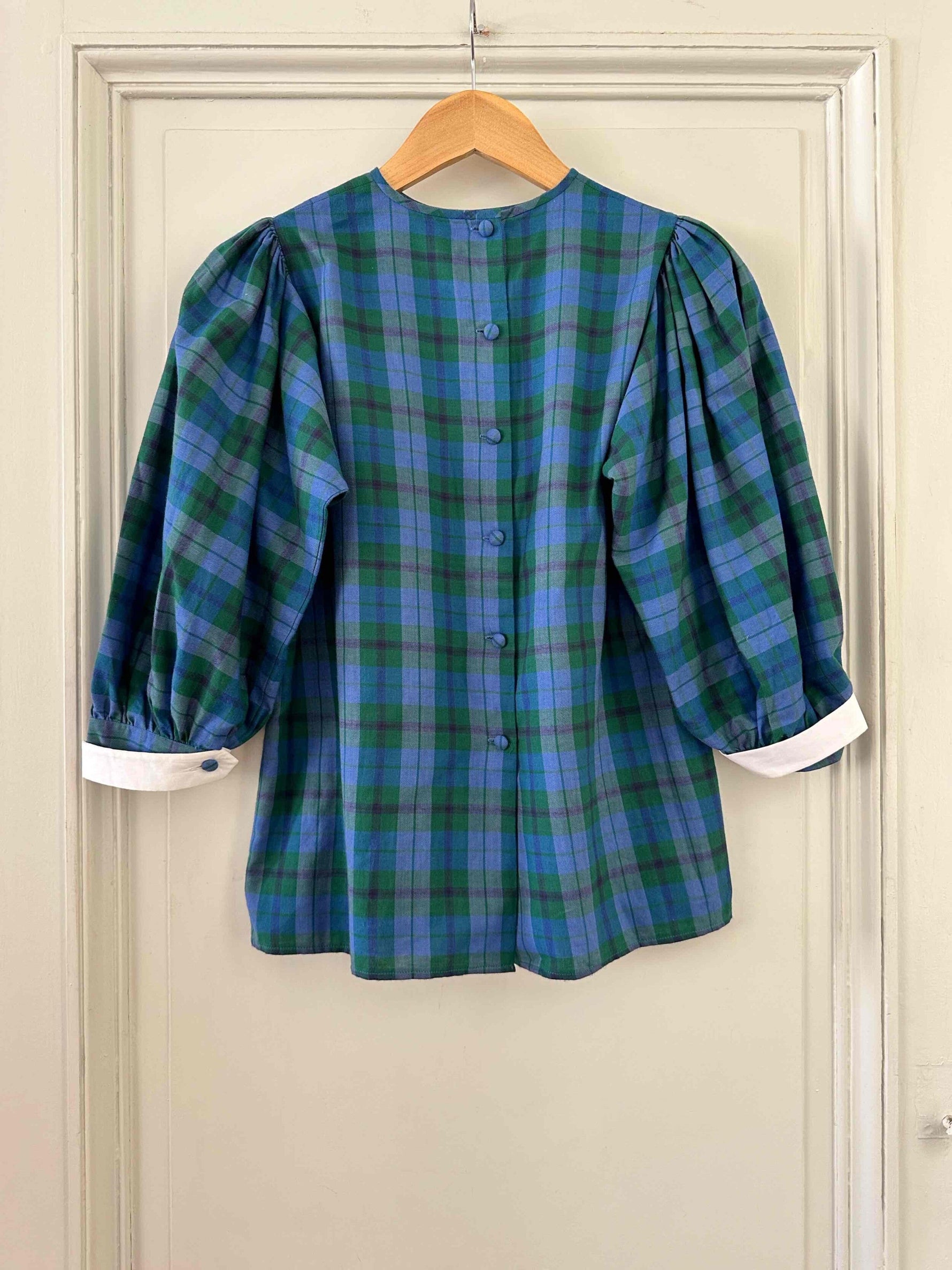 Prix unitaire parBlouse autrichienne à carreaux, en 100% coton flanelle, carreaux tartan ecossais bleus et verts, manches ballons, patte de poignets en coton blanc amovibles, fabriquée en Autriche, taille 34 portée ici sur un mannequin T36.