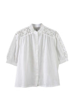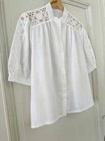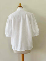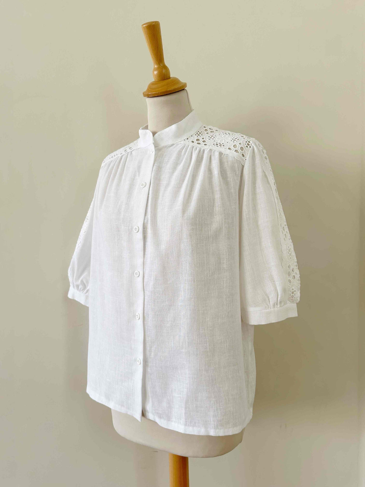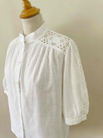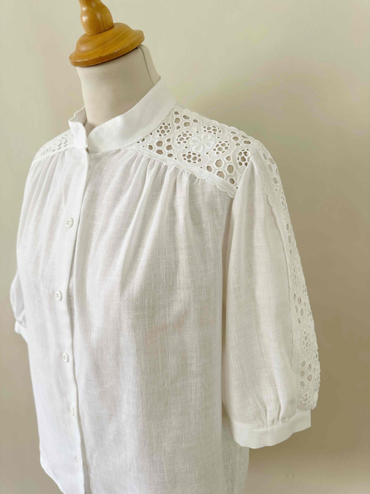 Prix unitaire parBlouse autrichienne, en 100% coton gaze blanc, col Mao, forme évasée, manches ballons 3/4 et épaules ajourées de broderies anglaises florales, fabriquée en Autriche, taille 36, portée ici sur un mannequin T36.
