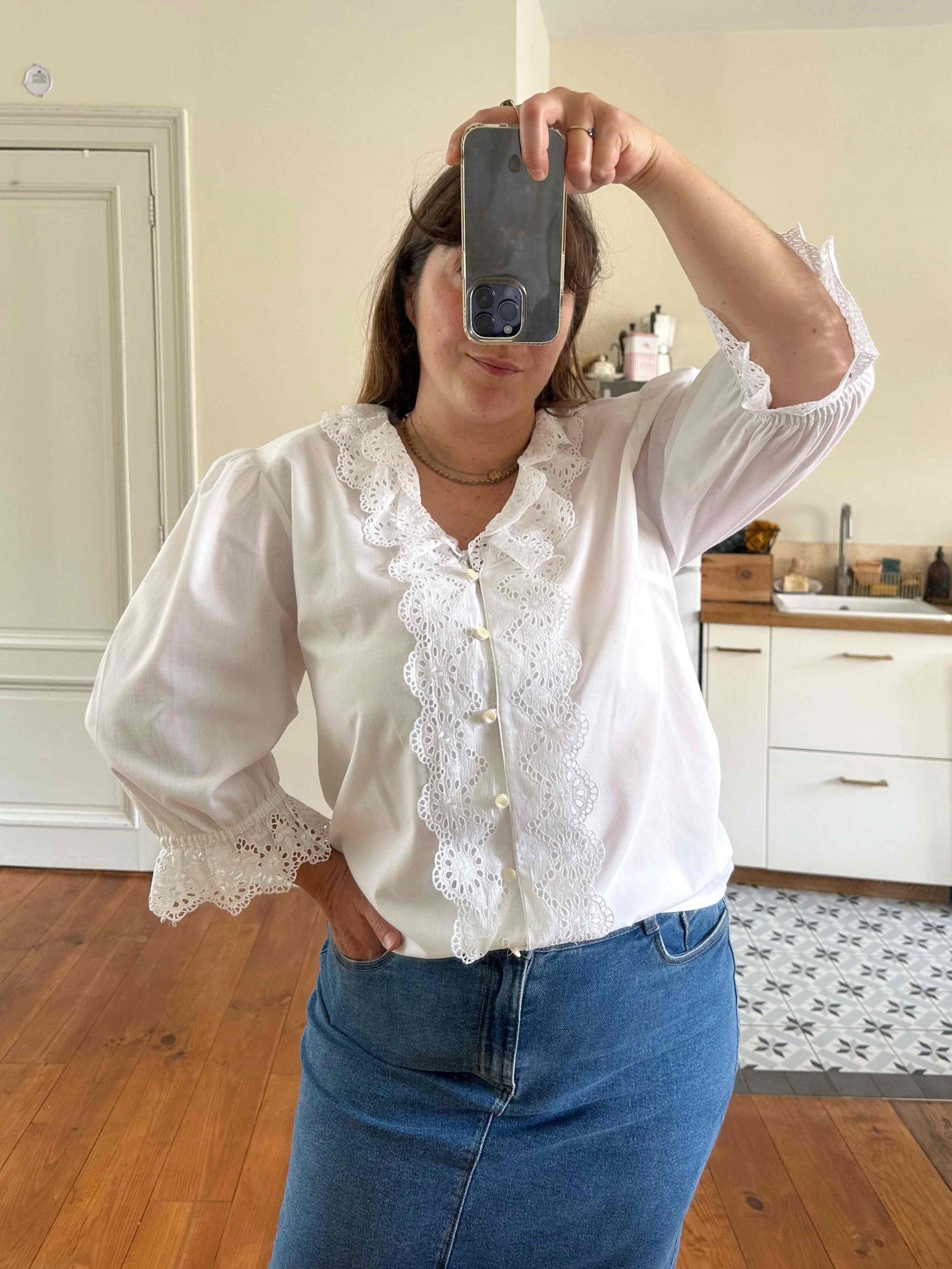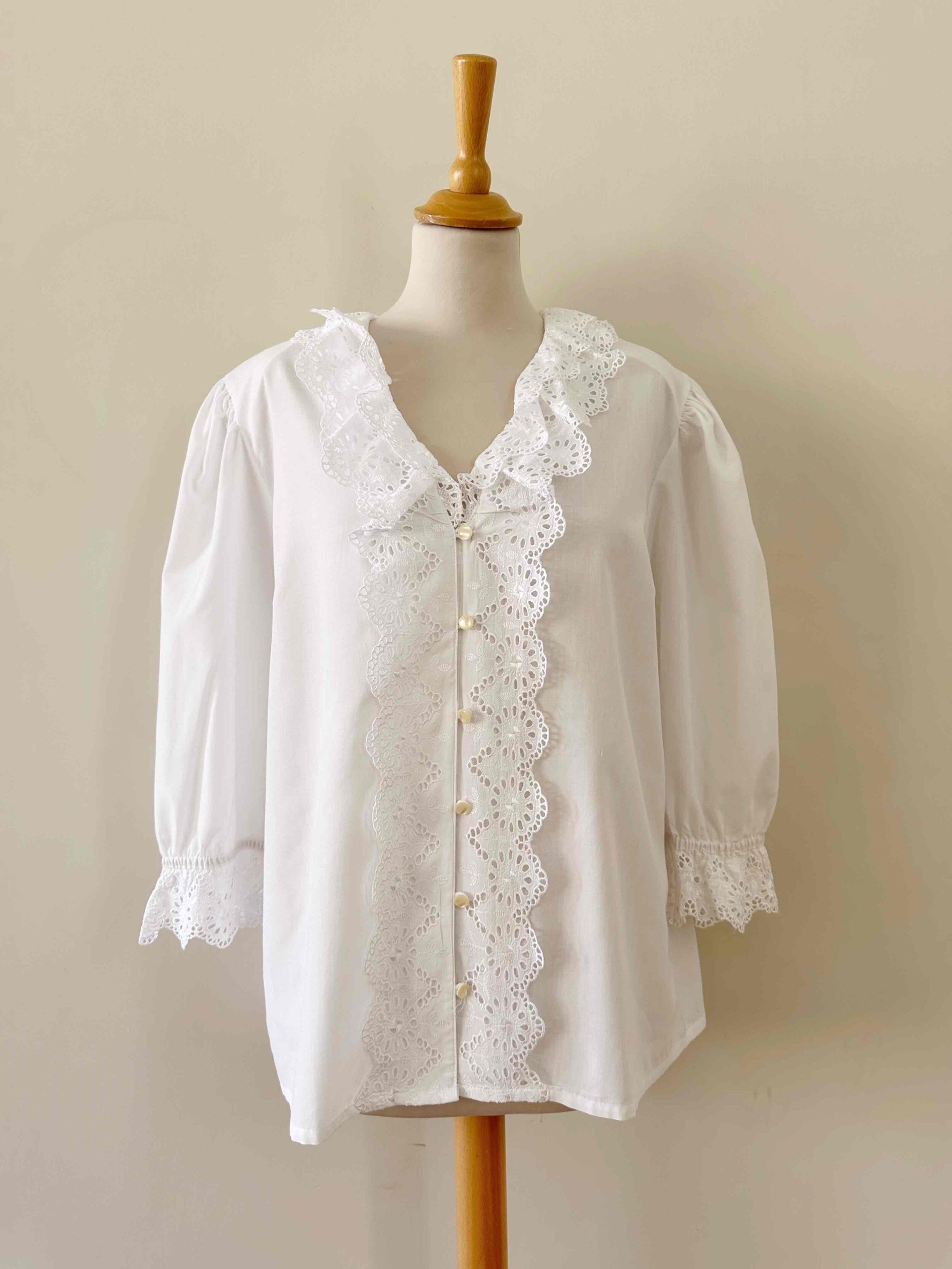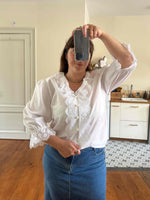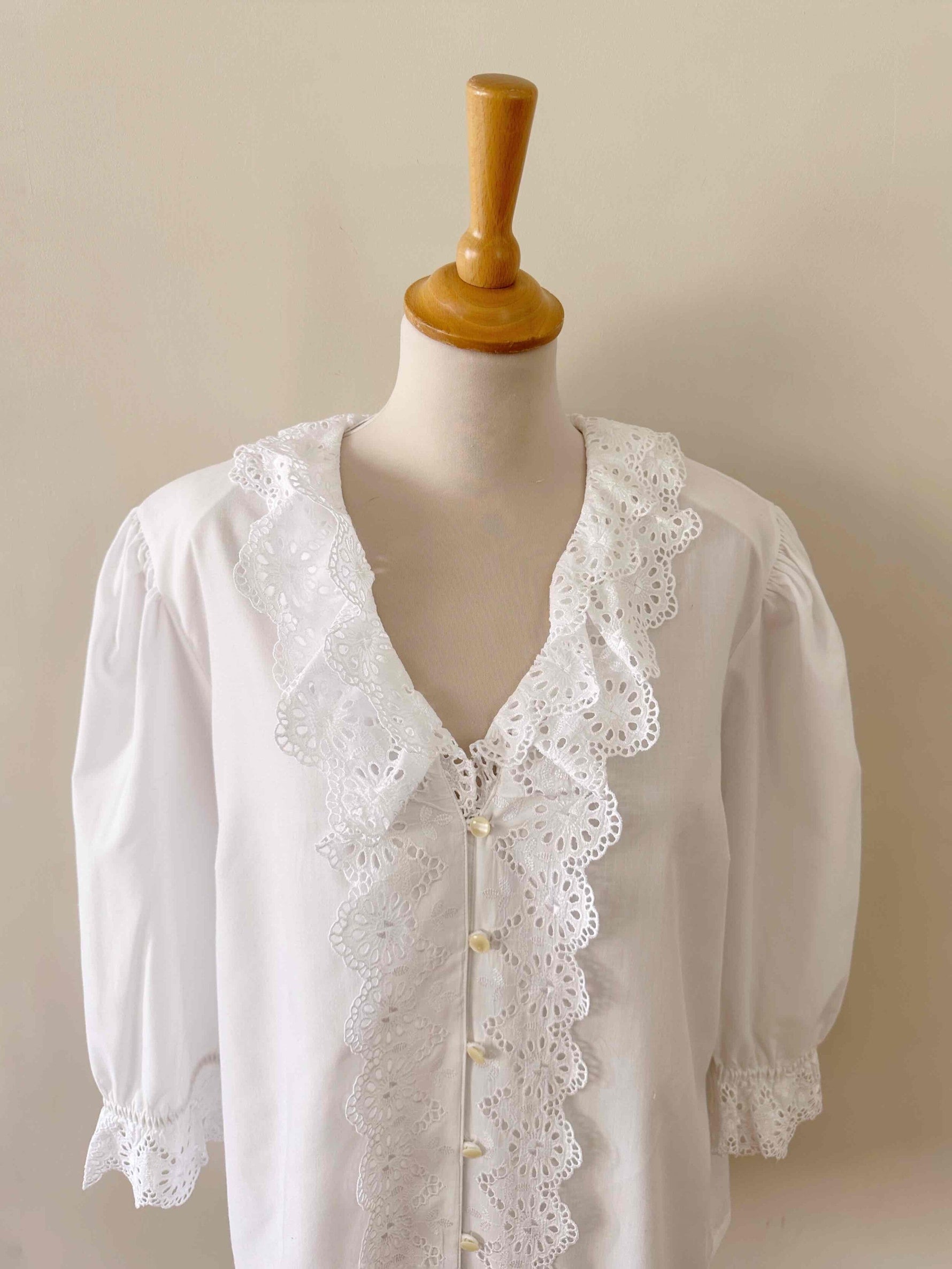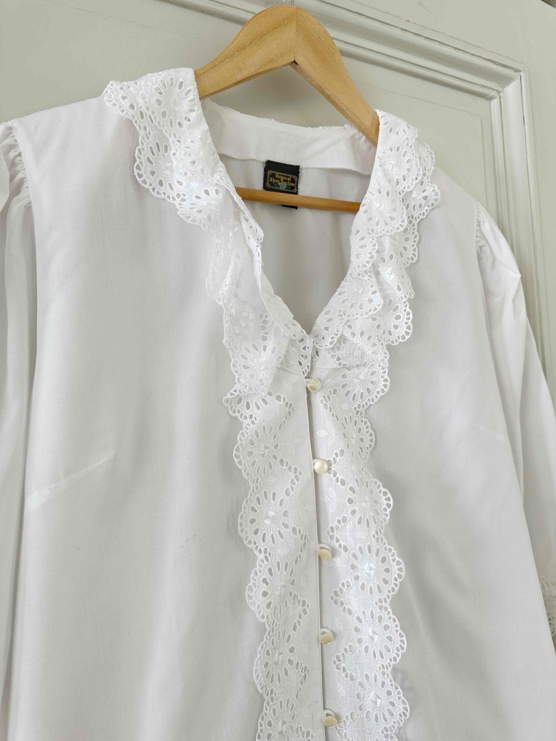 Prix unitaire parBlouse autrichienne, en coton popeline mélangé blanc, col et plastron volanté, manches ballons 3/4 élastiques et grand col volanté, les deux ajourés de broderies anglaises florales, fabriquée en Autriche, convient aux tailles 38/40/42, portée ici sur un mannequin T36 et sur une personne T40.