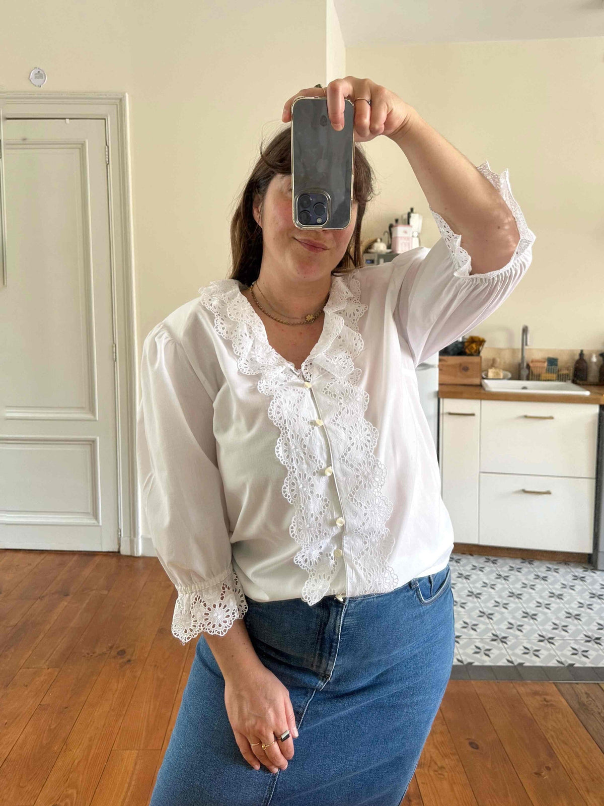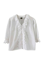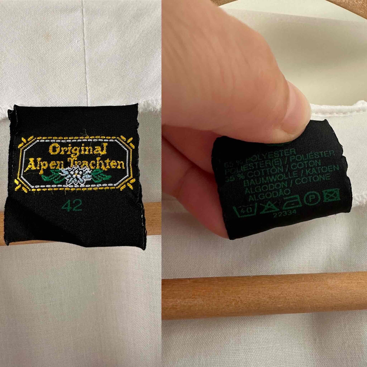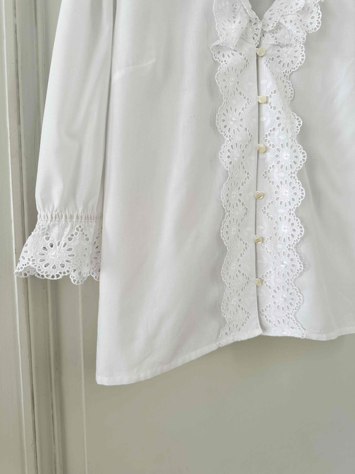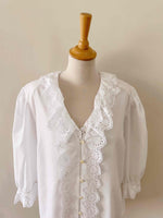 Prix unitaire parBlouse autrichienne, en coton popeline mélangé blanc, col et plastron volanté, manches ballons 3/4 élastiques et grand col volanté, les deux ajourés de broderies anglaises florales, fabriquée en Autriche, convient aux tailles 38/40/42, portée ici sur un mannequin T36 et sur une personne T40.