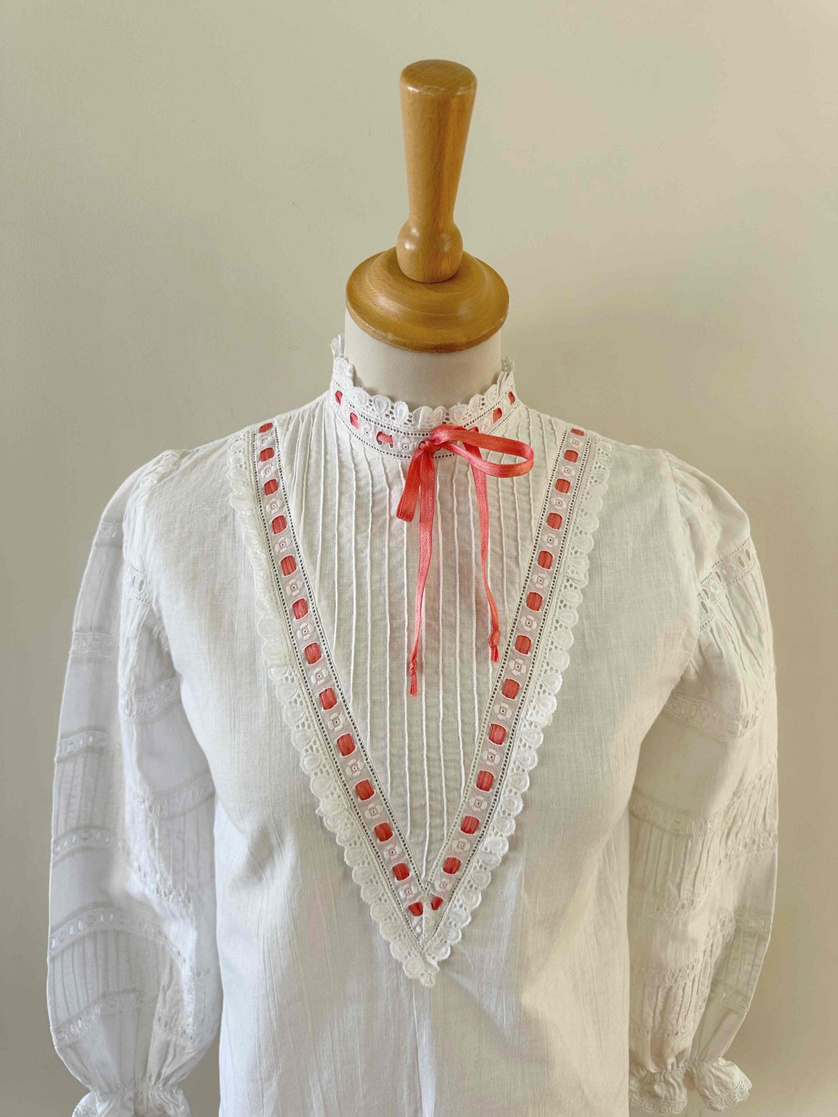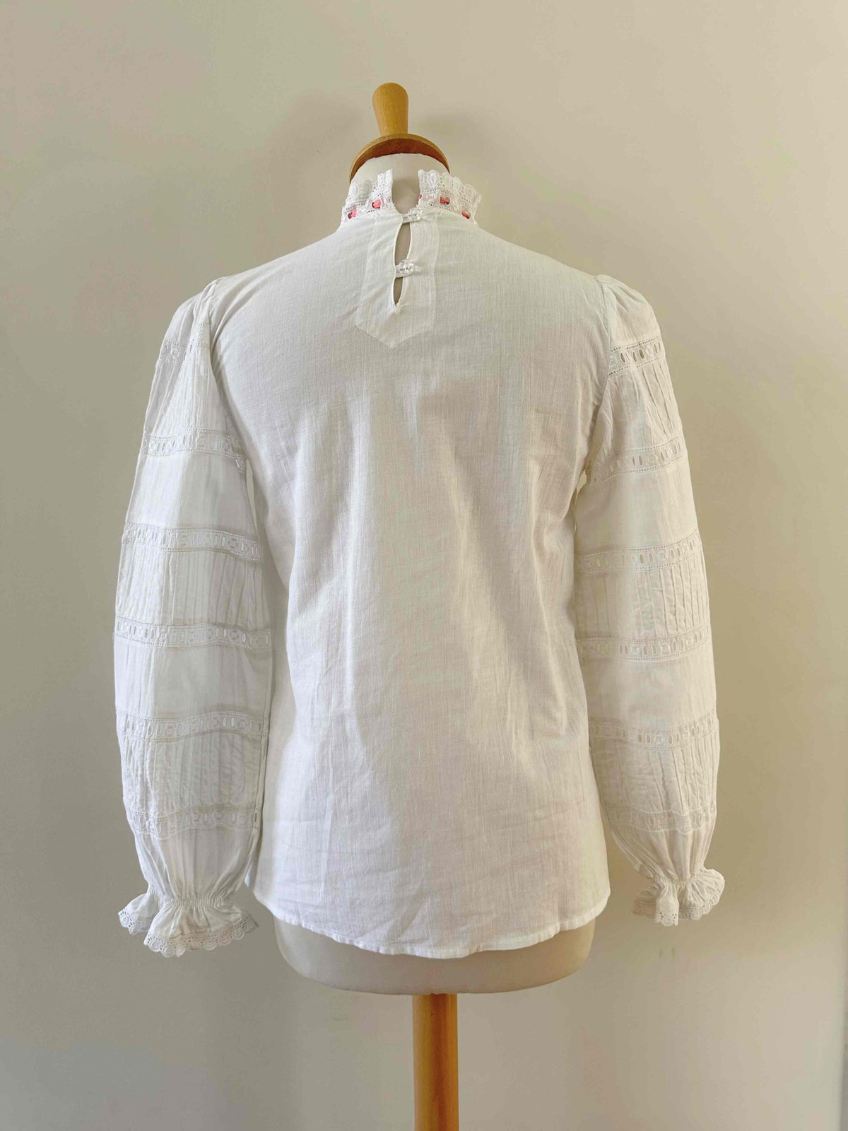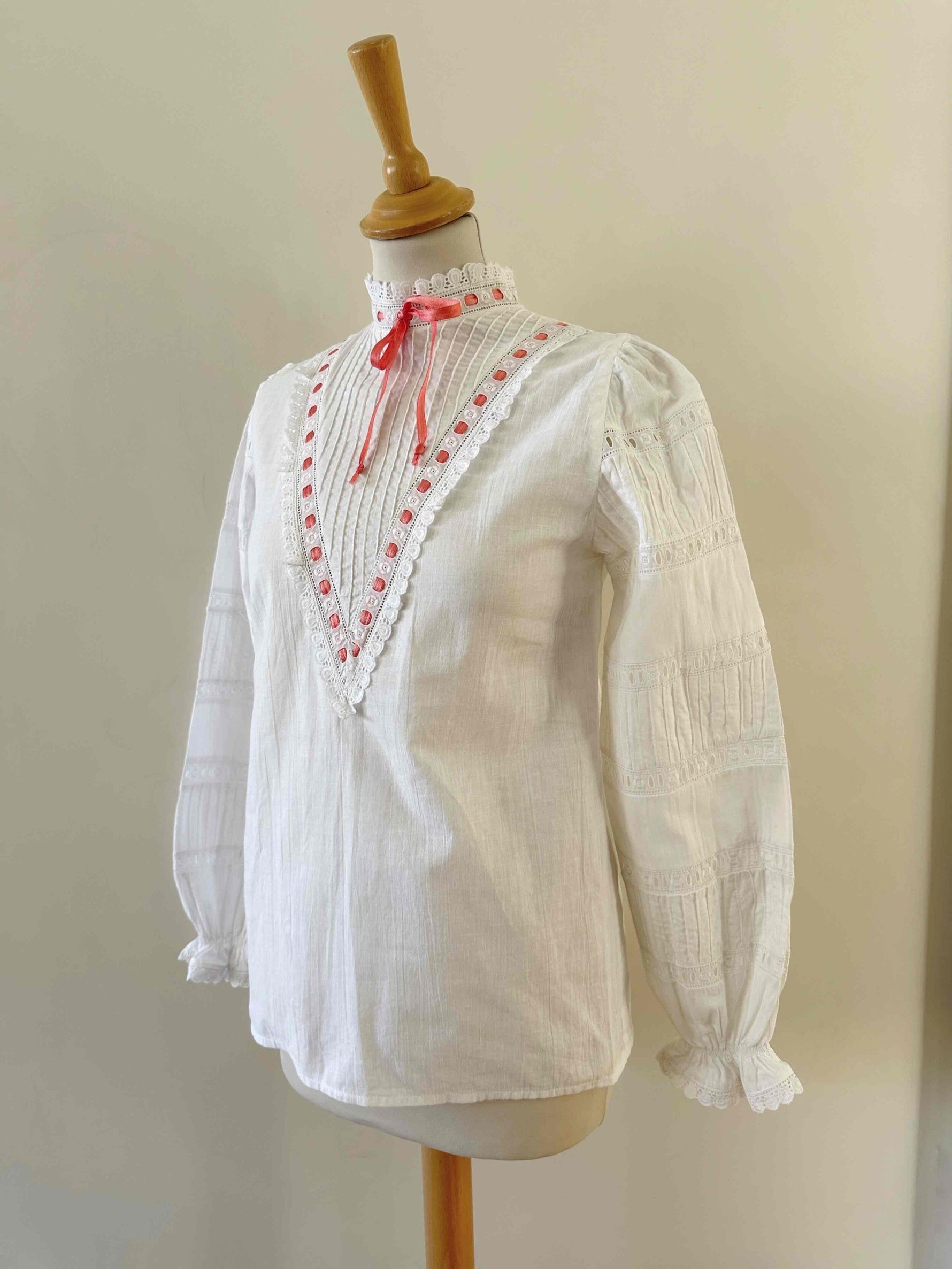 Prix unitaire parBlouse Autrichienne, en coton blanc, col montant et plastron brodé lacés d’un ruban rose, manches ballons broderies ajourées, col au dos boutonné, fabriquée en Autriche, convient aux tailles 34 et 36 portée ici sur un mannequin T36.
