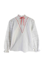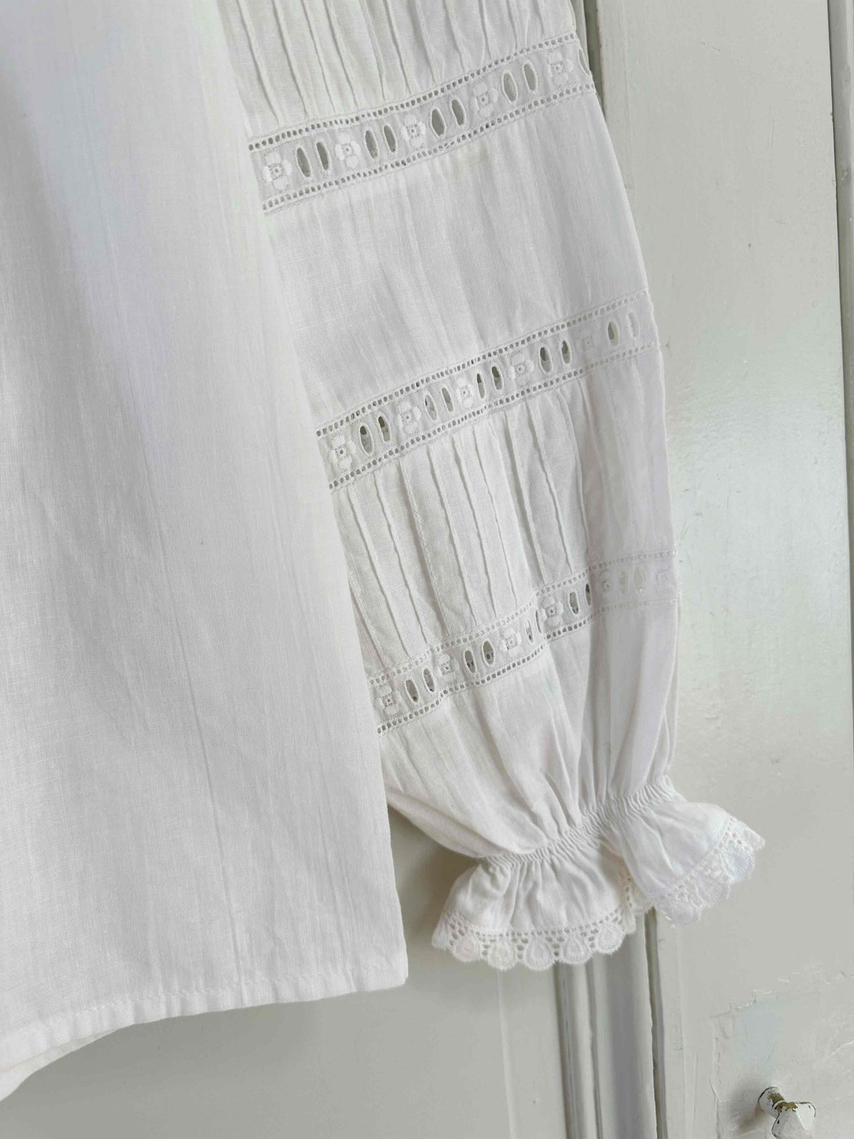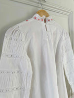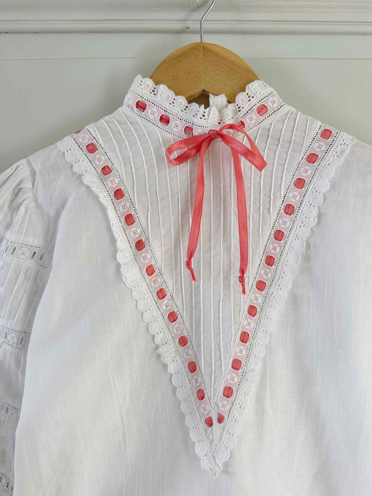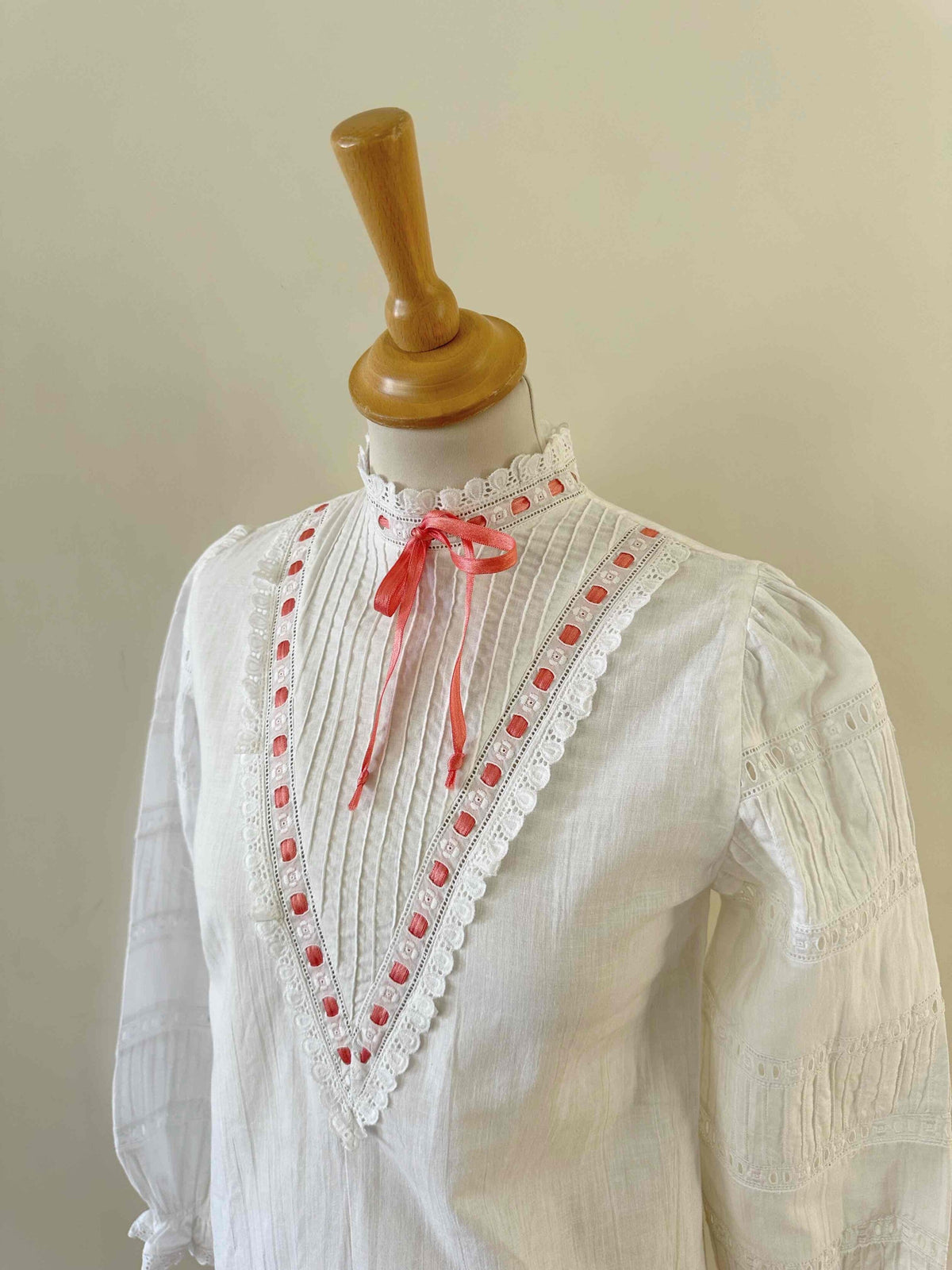 Prix unitaire parBlouse Autrichienne, en coton blanc, col montant et plastron brodé lacés d’un ruban rose, manches ballons broderies ajourées, col au dos boutonné, fabriquée en Autriche, convient aux tailles 34 et 36 portée ici sur un mannequin T36.