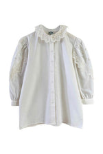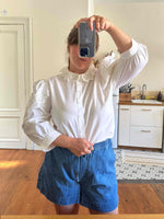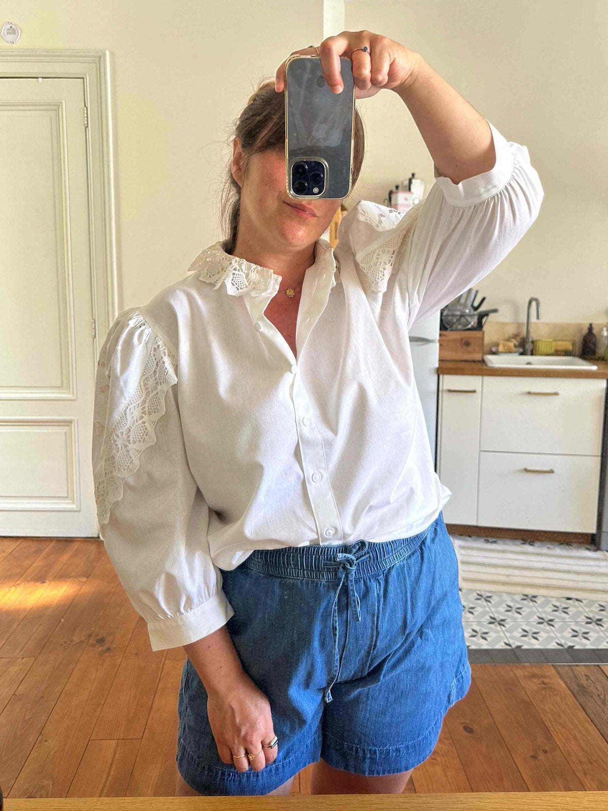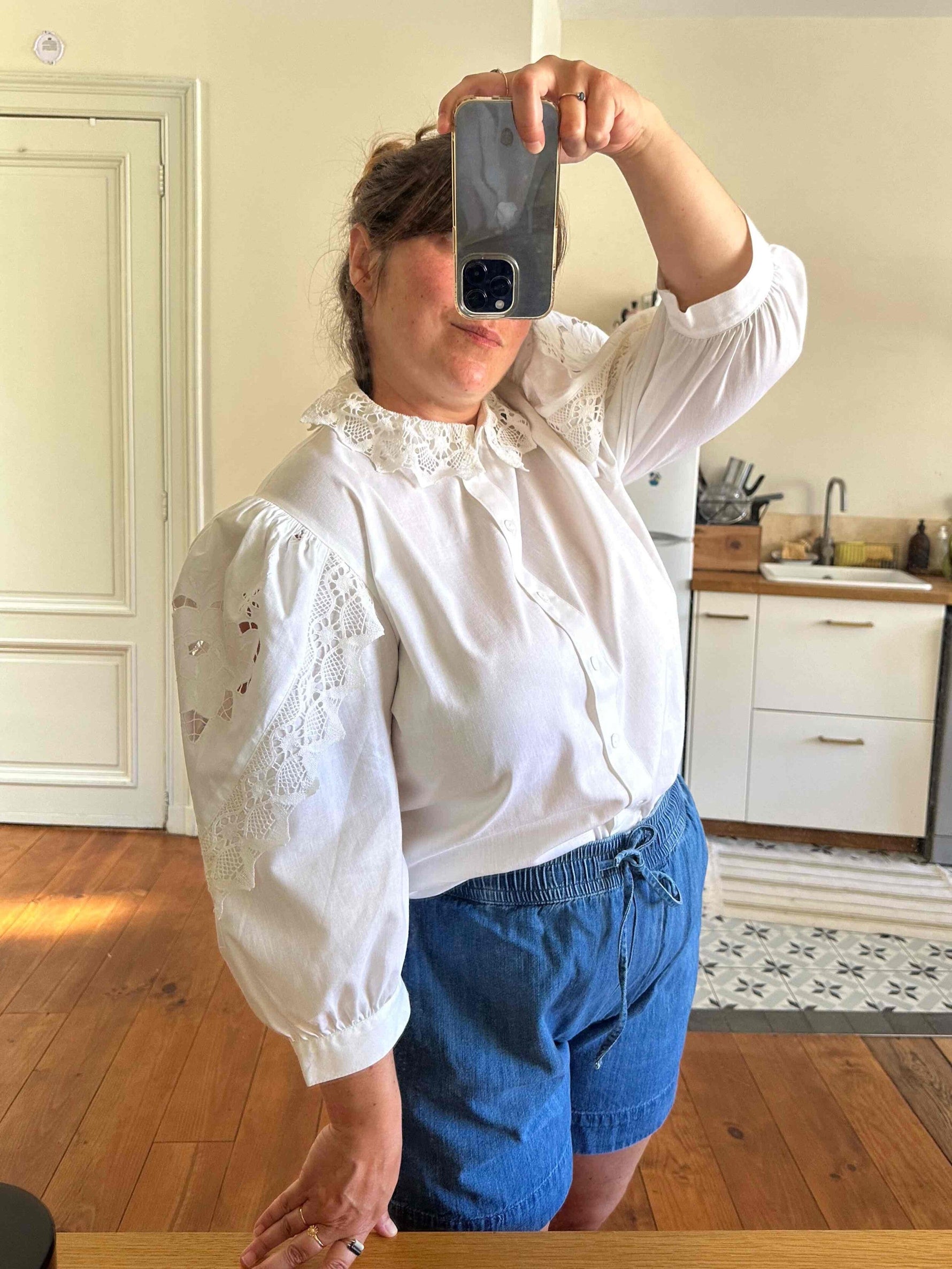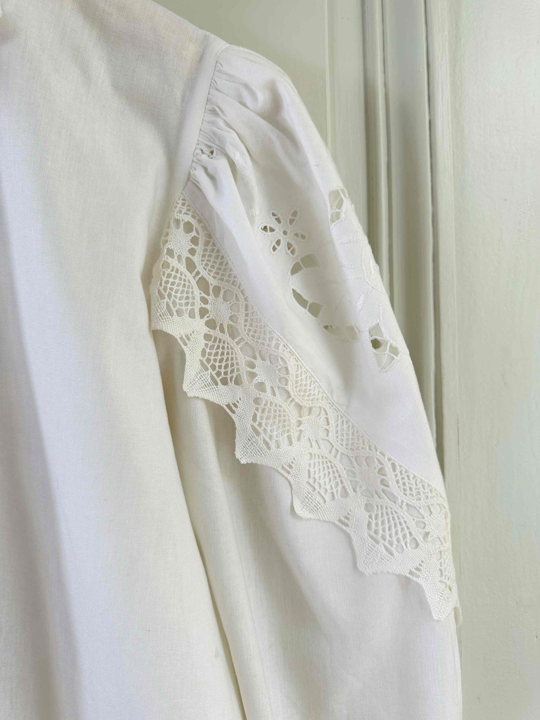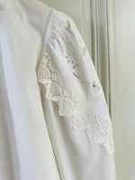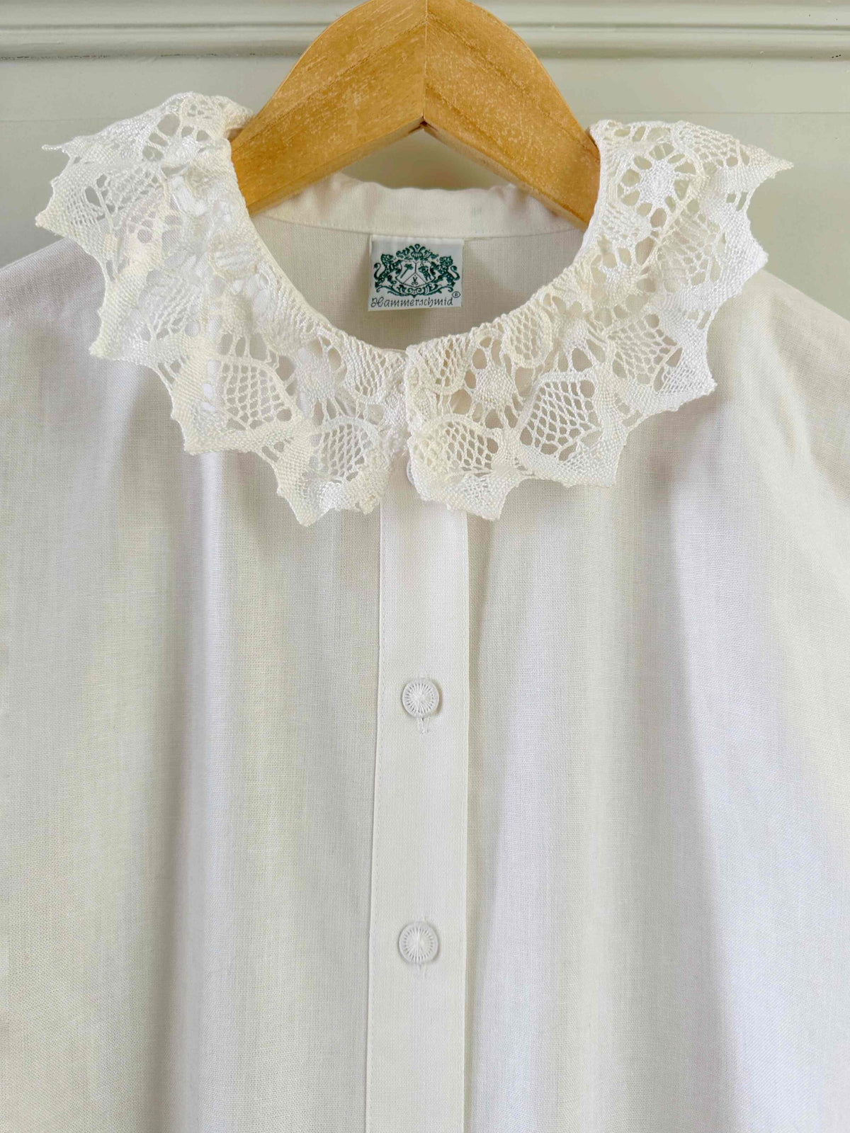 Prix unitaire parBlouse autrichienne, en 100% coton blanc, manches 3/4 ballons brodées et ajourées de broderies anglaises florales, col montant volant en dentelle, fabriquée en Allemagne, taille 40 portée ici sur une personne T40.