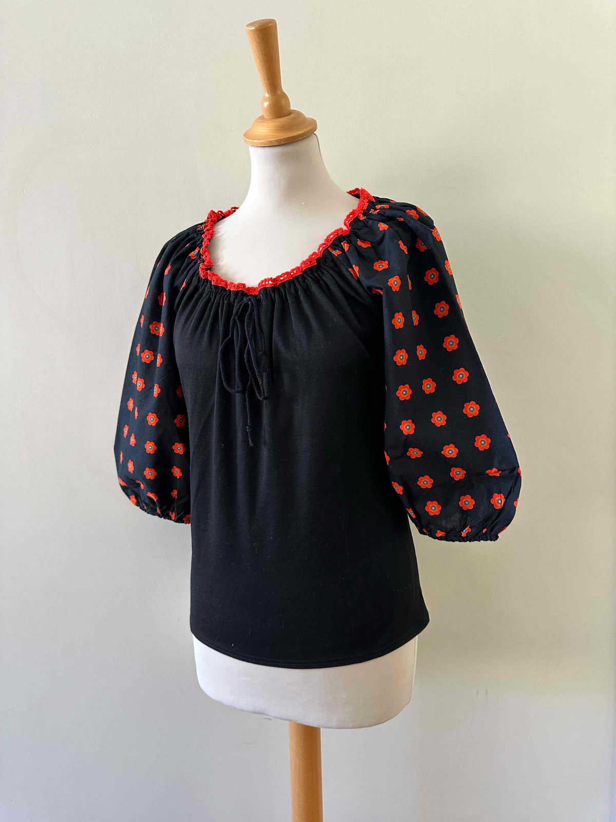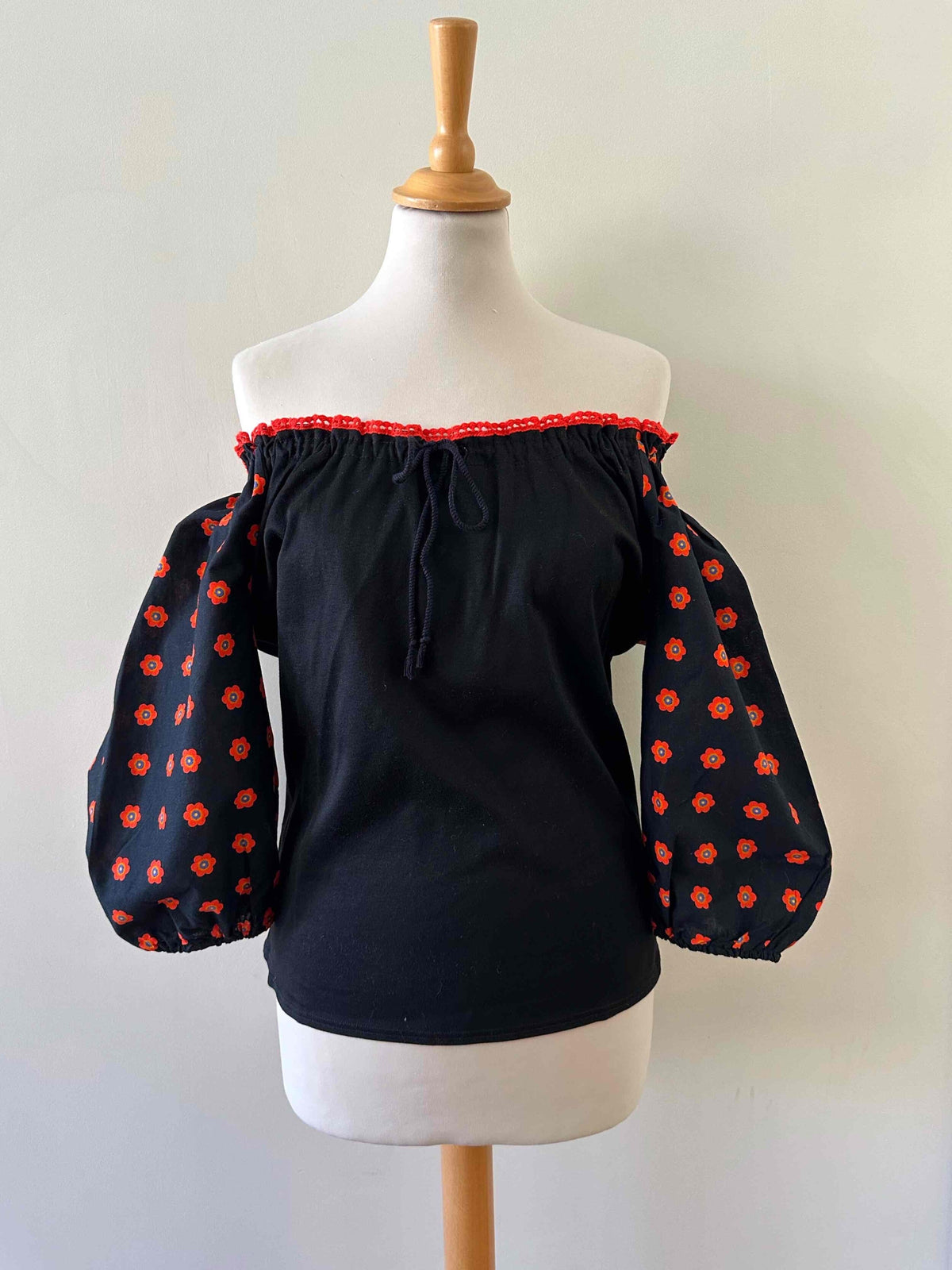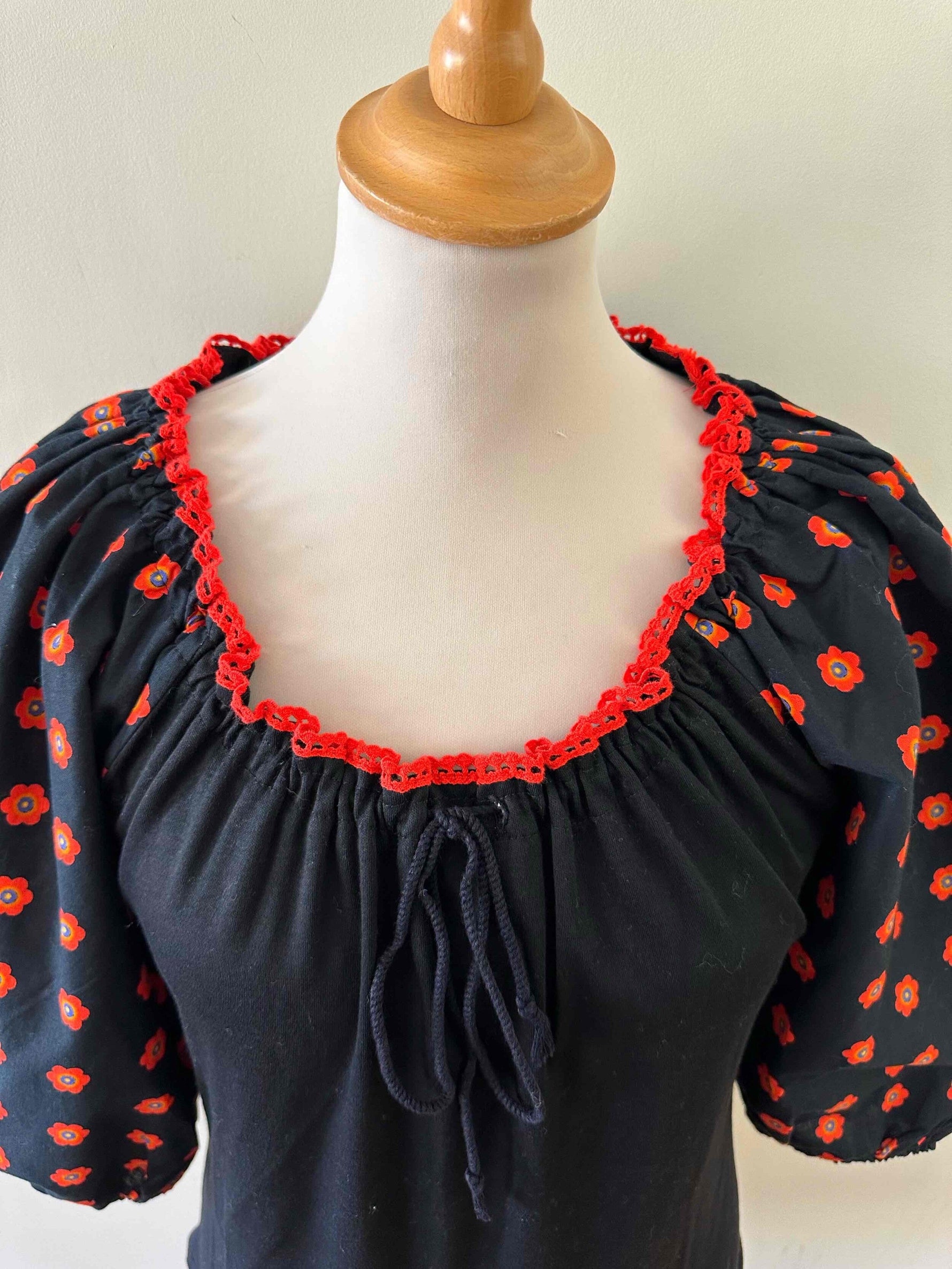 Prix unitaire parBlouse autrichienne, en coton jersey noir et manches ballons imprimée de fleurs rouges, oranges et bleues, encolure brodée de rouge, avec lien à nouer et à froncer pour porter open shoulders, fabriquée en Allemagne, taille 36 portée ici sur un mannequin T36.