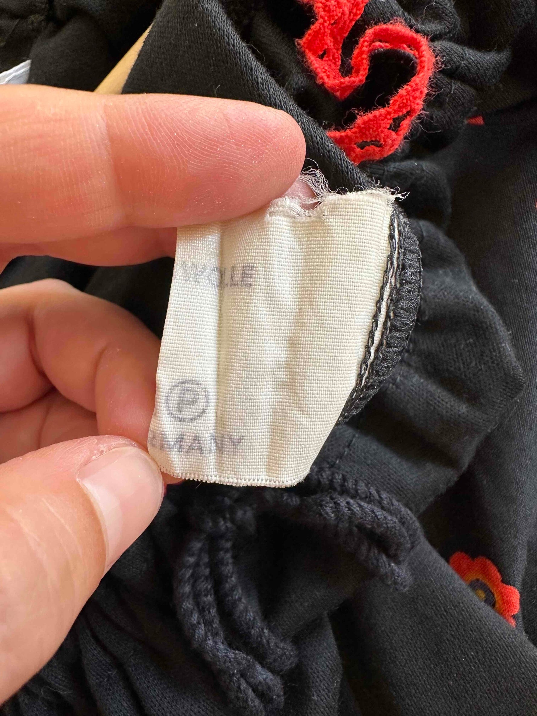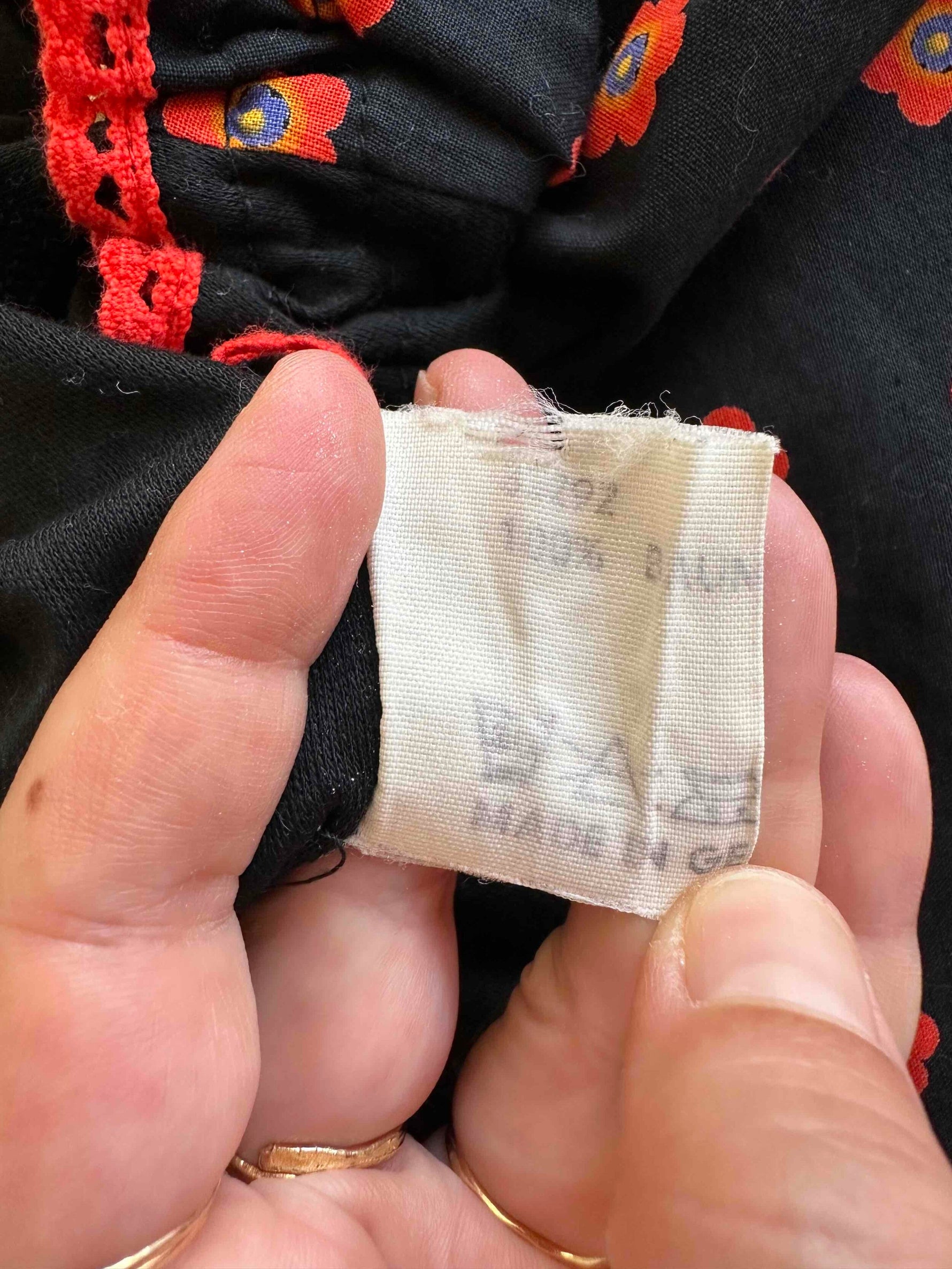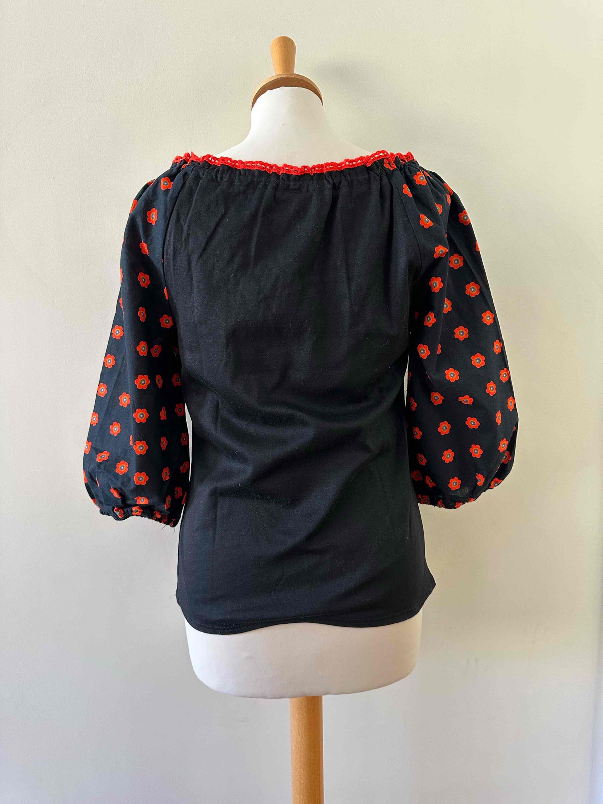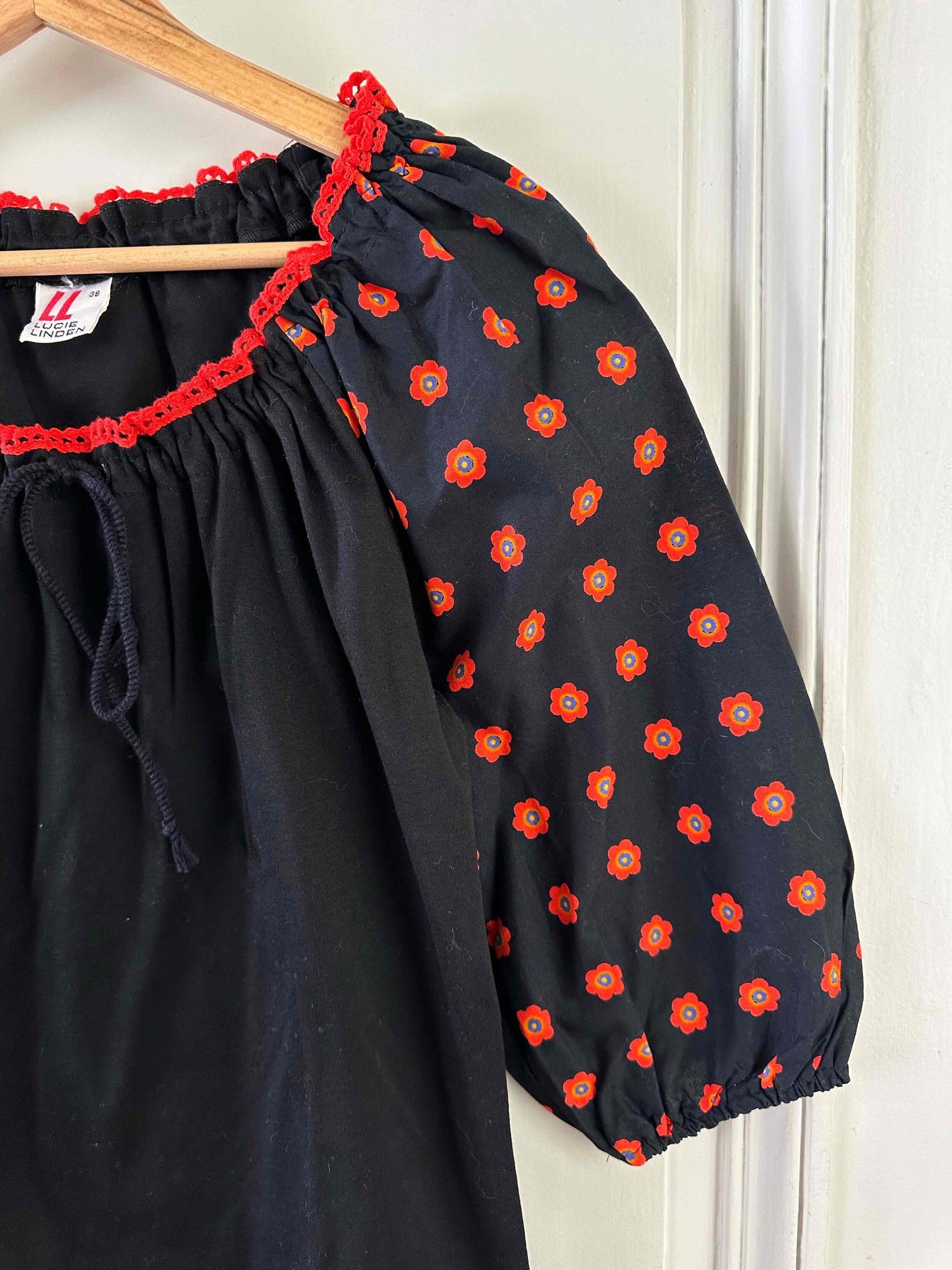 Prix unitaire parBlouse autrichienne, en coton jersey noir et manches ballons imprimée de fleurs rouges, oranges et bleues, encolure brodée de rouge, avec lien à nouer et à froncer pour porter open shoulders, fabriquée en Allemagne, taille 36 portée ici sur un mannequin T36.